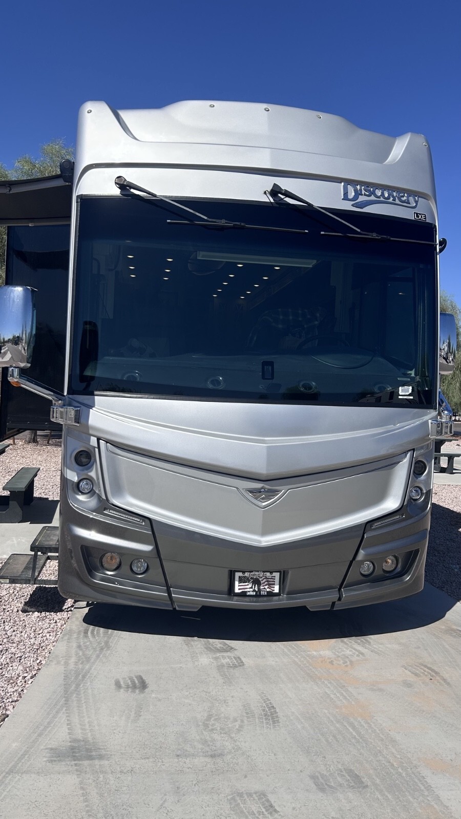 The 2022 Fleetwood Discovery LXE 44S is a44-foot Class A diesel motorhome on aFreightliner® XCM chassispowered by a 450HP CumminsISL9 engine andAllison 3000 MHtransmission, 1250lbs torque,featuringV-Ride Freedom Bridge technologyand a steerable tag axle for stability. It has capacities for 105 gallons of fresh water and 100 gallons of fuel, sleeping for at least four people, and a 10,000 lbtowing capacity.It features a four-slide design for a spacious interior with aking-size bed, a residential kitchen with a full size refrigerator, an induction cooktop, convection microwave, dishwasher, washer and dryer and a central vac. Other key features include floor tile heating, Aqua Hot heating, a 300W solar panel.Performance & Chassis