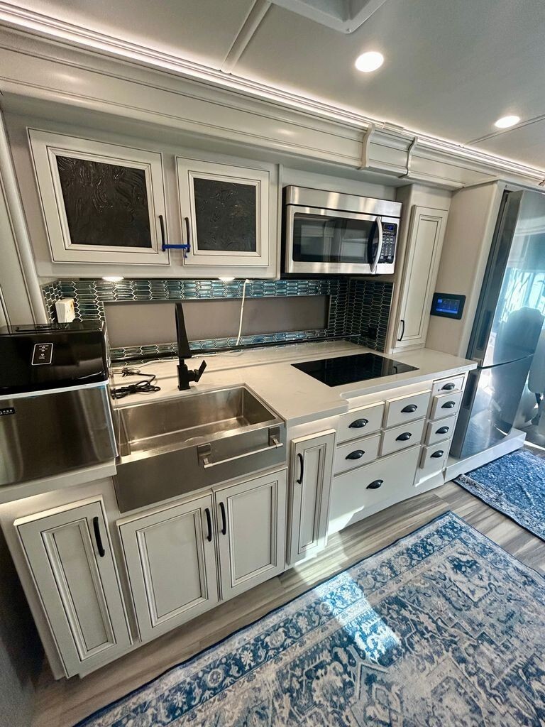 All-Electric Kitchen: 2-burner induction cooktop, convection microwave, residential fridge, and an added stand-alone ice maker.