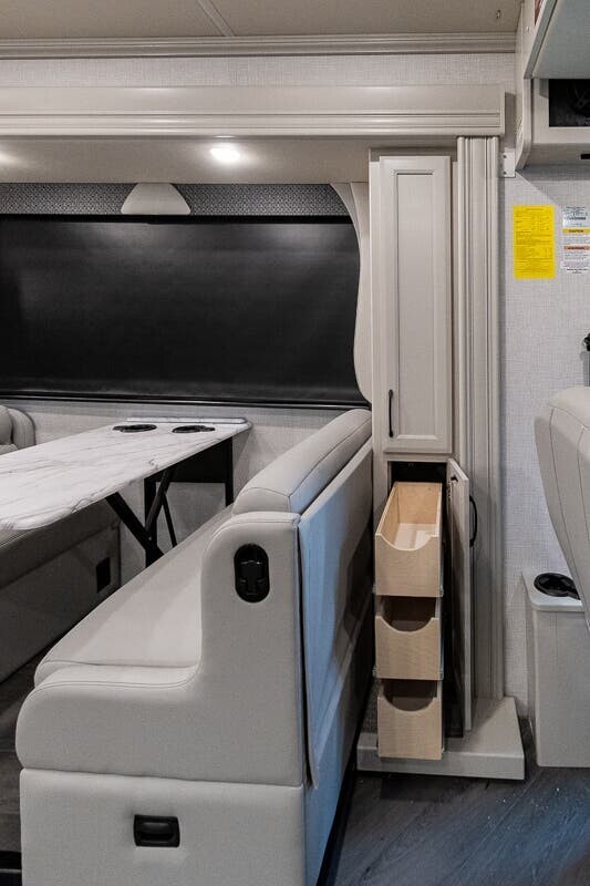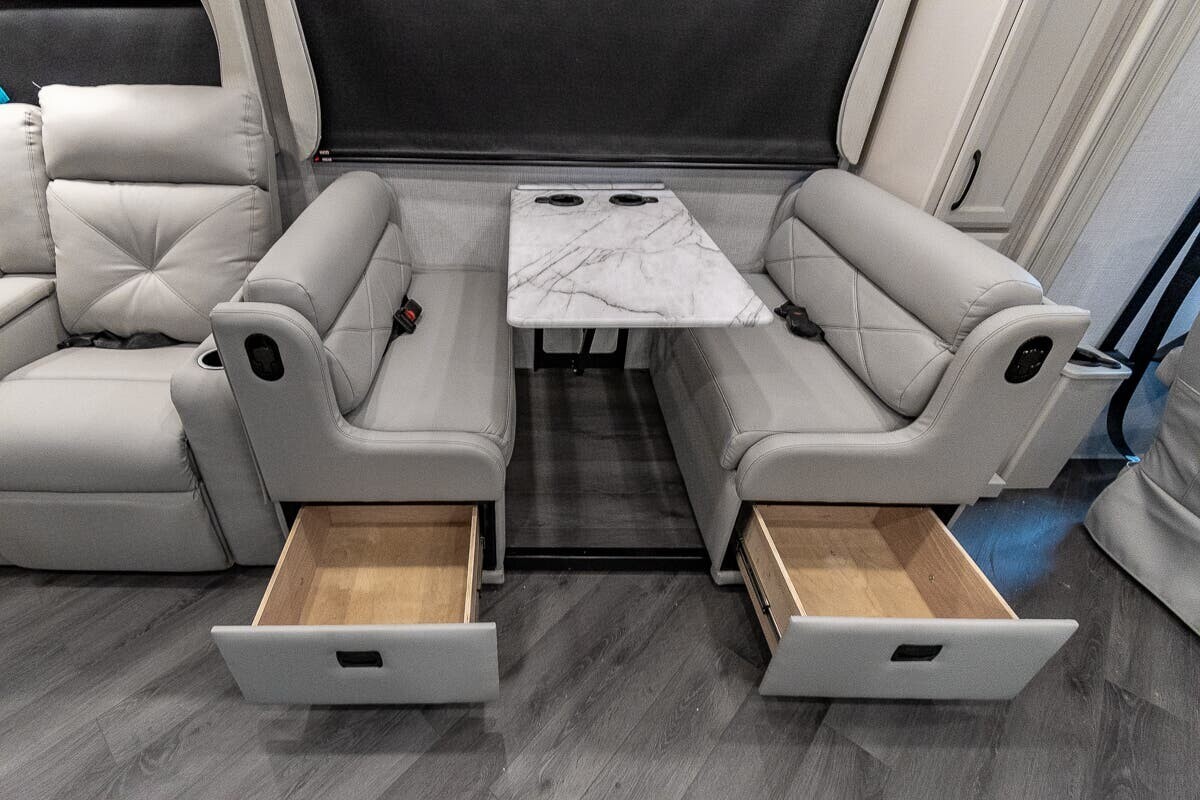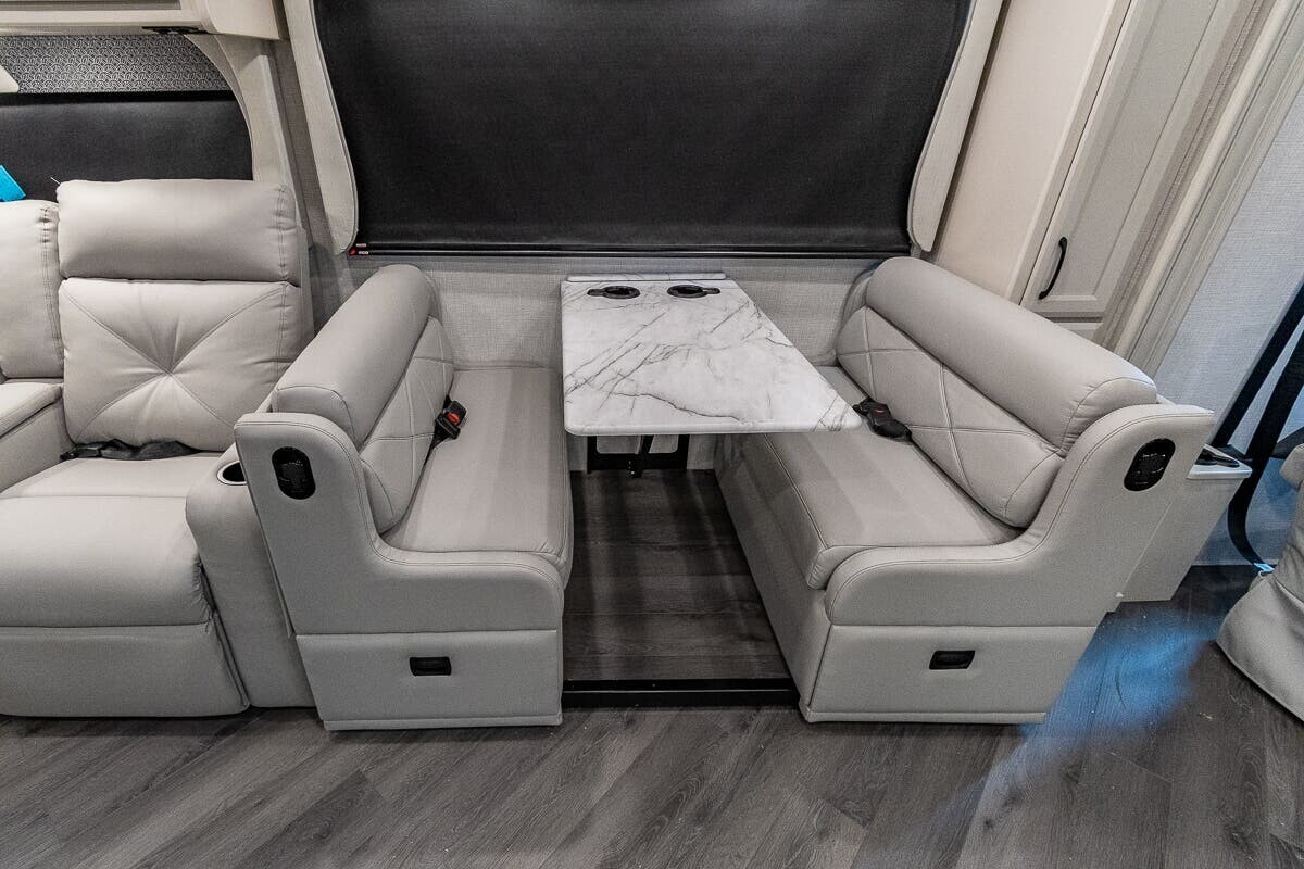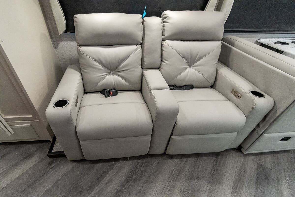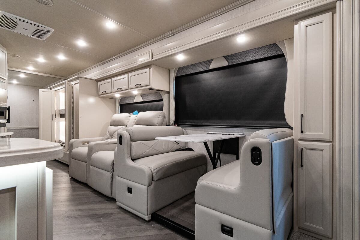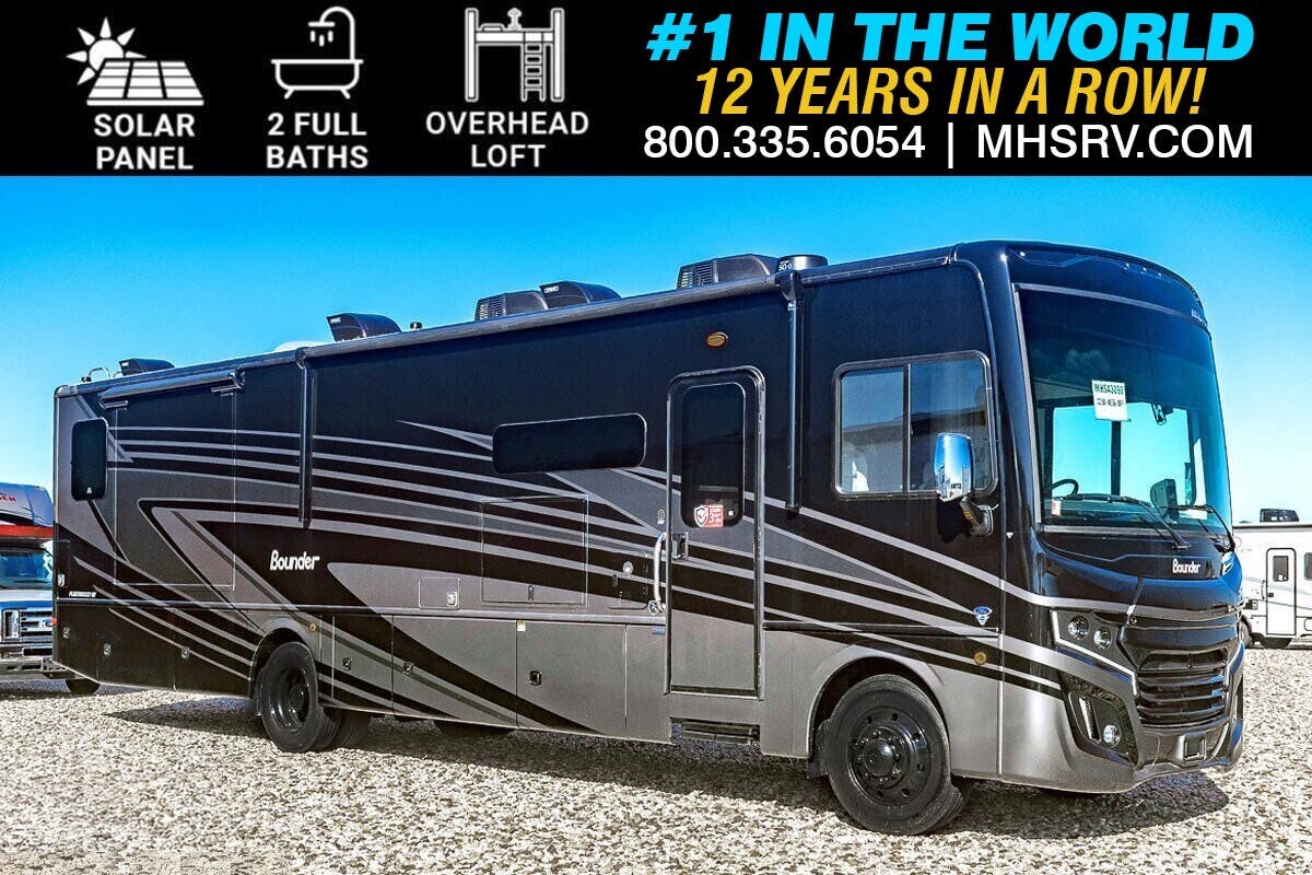 The 2025 Fleetwood Bounder 36F is a premier Class A motorhome designed for travelers seeking luxury and functionality on the open road. Measuring 38.75 feet in length, this spacious RV offers ample room for families and groups, comfortably sleeping up to ten people. Built on a sturdy Ford F53 chassis and powered by a robust 7.3L V8 engine delivering 335 horsepower and 468 lb-ft of torque, the 36F ensures a smooth and reliable driving experience. The exterior boasts a sleek design with full-body paint options, enhancing both aesthetics and durability. Inside, the intelligently designed floorplan features a fully equipped kitchen with solid-surface countertops, a stainless steel residential refrigerator, and a three-burner stovetop, making meal preparation effortless. Sleeping arrangements include a king-size bed in the private master bedroom, convertible bunk beds, a sofa bed, and a drop-down overhead bunk, accommodating up to