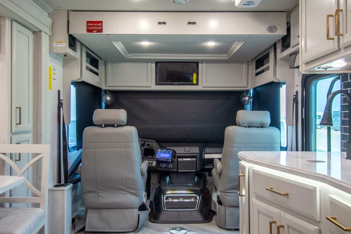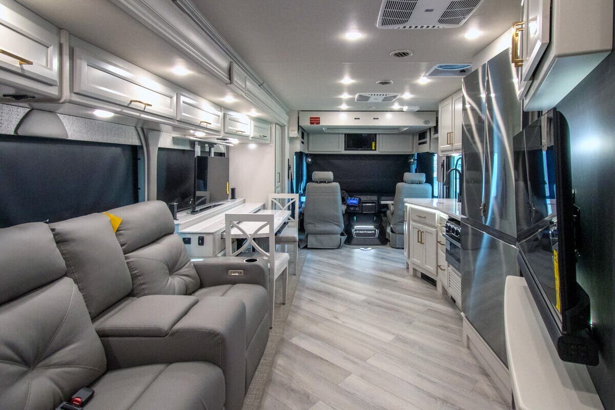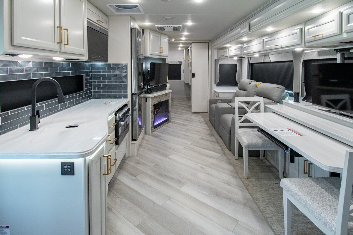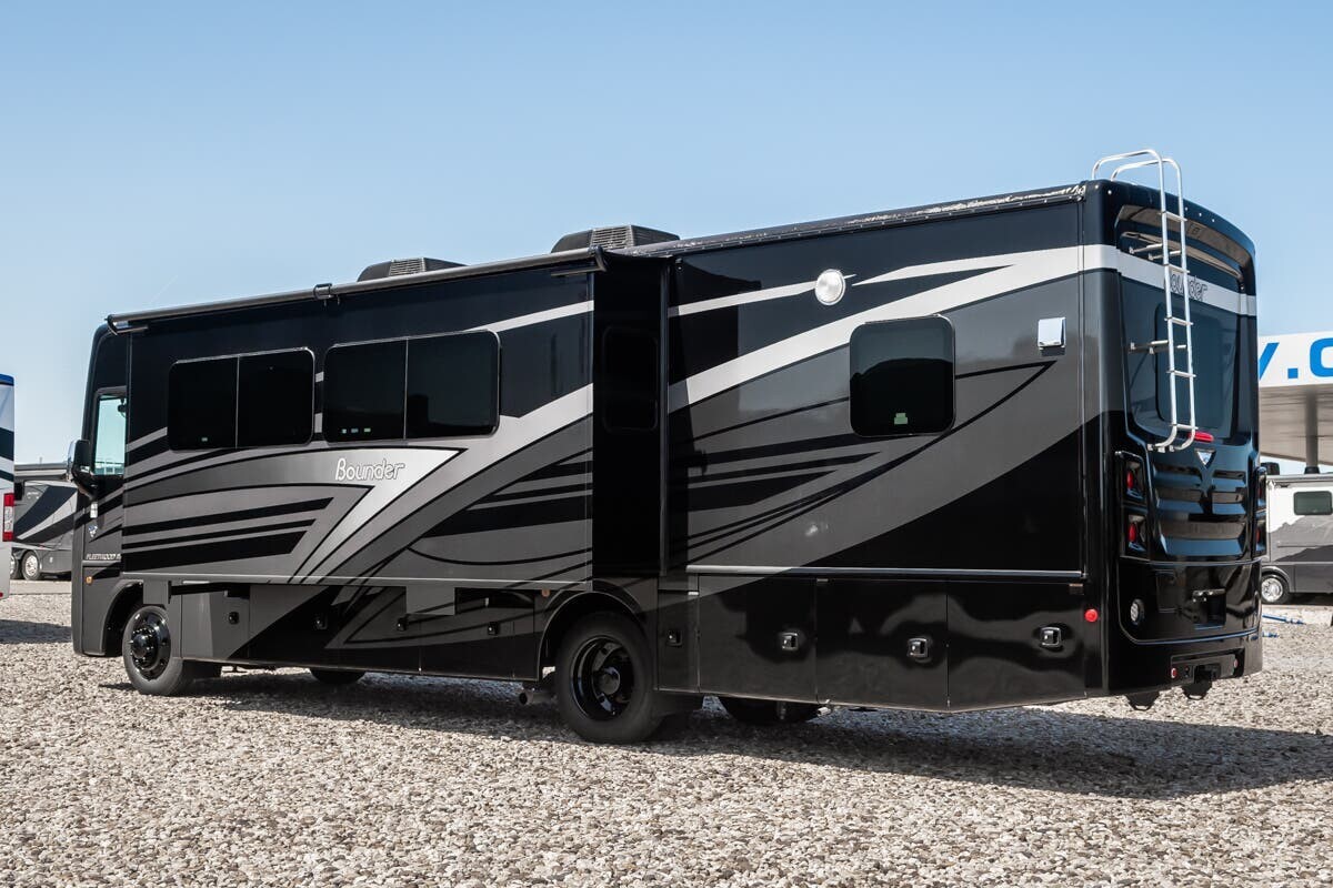 The 2025 Fleetwood Bounder 33C is a spacious and comfortable Class A motorhome designed for travelers seeking a reliable and enjoyable experience on the road. Measuring 34.25 feet in length, the 33C offers a well-thought-out floor plan that maximizes both living and storage space. a robust 7.3-liter V8 engine delivering 335 horsepower and 468 lb-ft of torque, this motorhome ensures a smooth and powerful drive across various terrains. With a towing capacity of 8,000 pounds, bringing along additional gear or a secondary vehicle is convenient.Inside, the 33C features a welcoming living area with plush seating, including two recliners and a comfortable sofa, all upholstered in durable vinyl. The open floor plan leads to a modern kitchen equipped with solid-surface countertops, a three-burner cooktop, a full-size stainless steel refrigerator, and a convection microwave, making meal preparation straightforward.