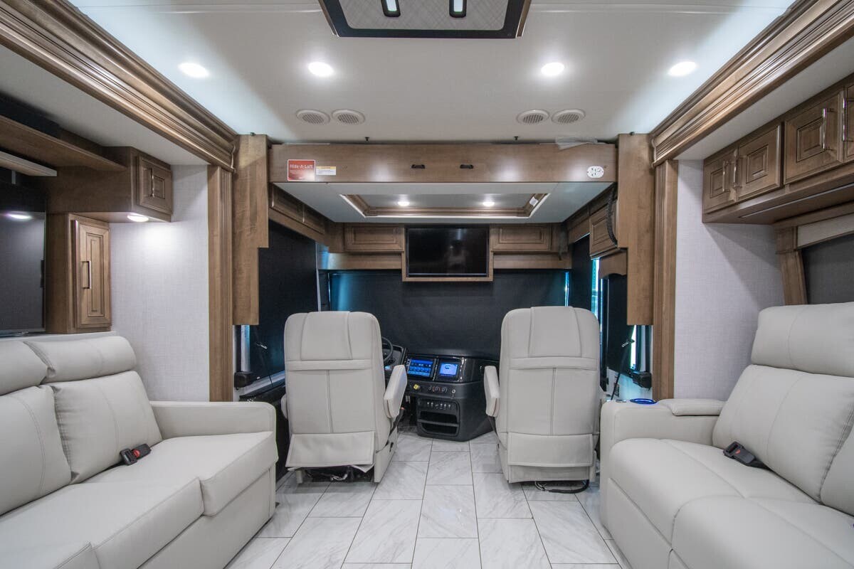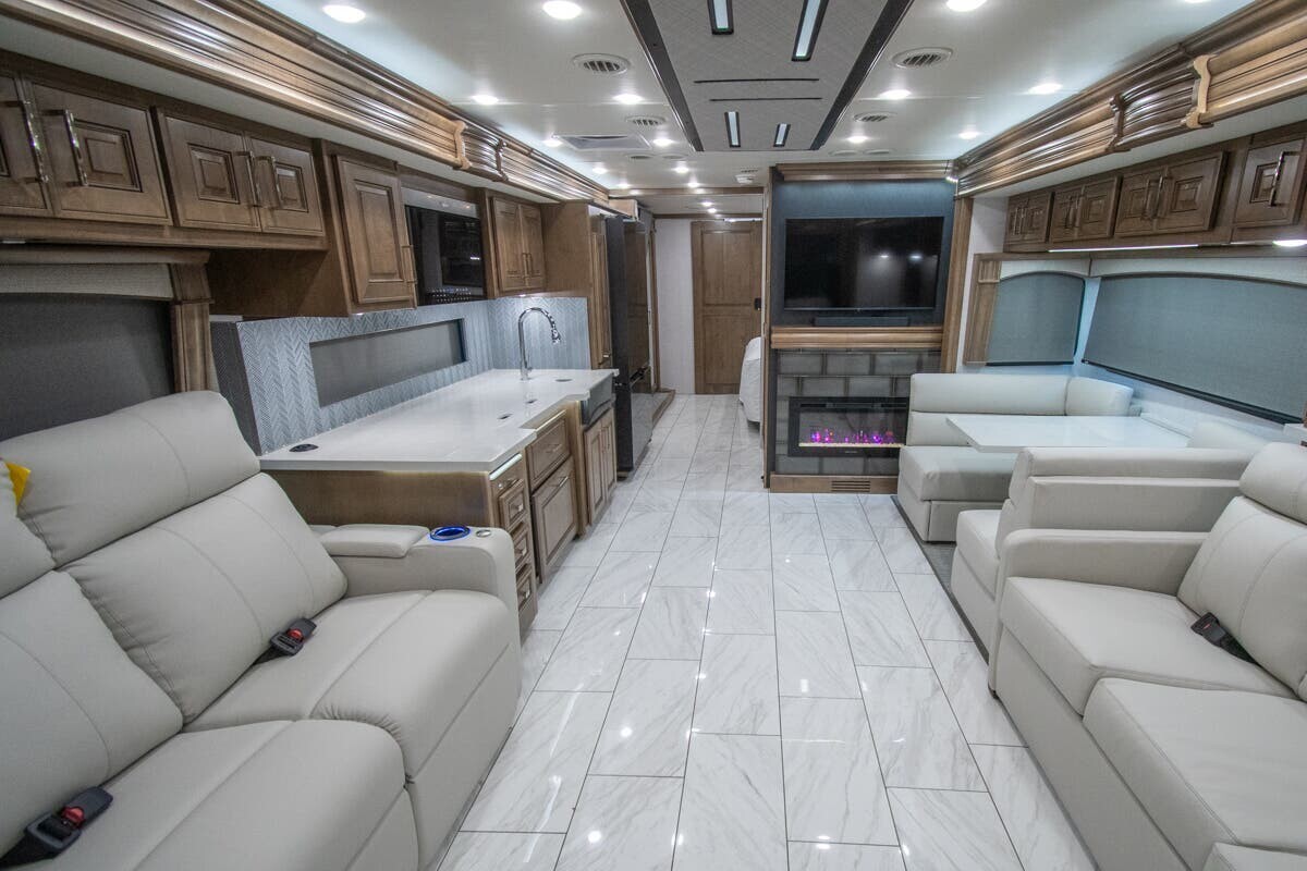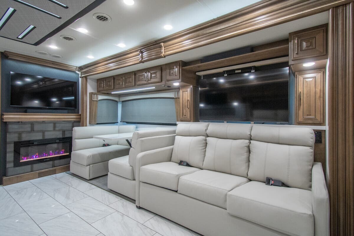 The 2025 Fleetwood Discovery LXE 40M is a luxury motorhome designed for comfortable and stylish travel. Built on a Freightliner XCM chassis and powered by a 380-horsepower Cummins I6 diesel engine, it offers a smooth and efficient drive. Measuring just over 40 feet in length, the 40M provides ample space for relaxation and entertainment. The interior features porcelain tile flooring, hardwood cabinetry, and polished solid surface countertops. The living area includes plush seating and a pop-up LED TV, while the kitchen is equipped with a residential refrigerator, convection microwave, and a two-burner induction cooktop. The master suite boasts a king-size bed, dual wardrobes, and a full rear bath with dual sinks, a tile shower with a seat, and a stackable washer and dryer. Additional amenities include a bath and a half, a fireplace, and multiple TVs, including an exterior entertainment center with a Bluetooth speaker. With its