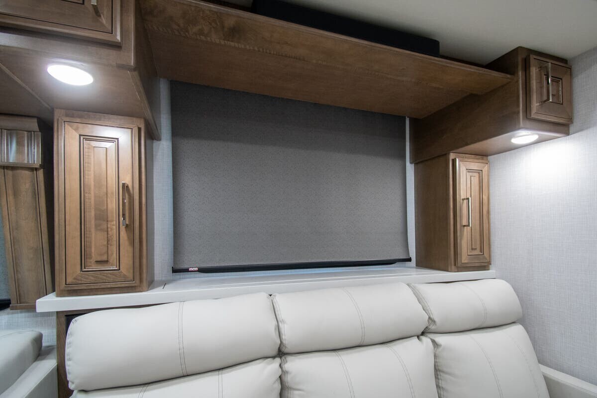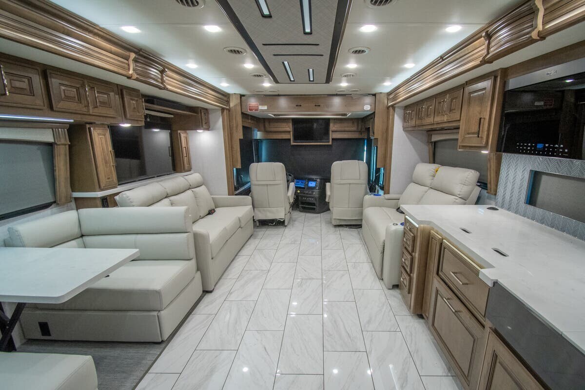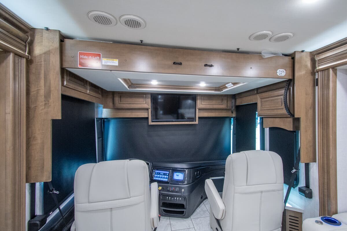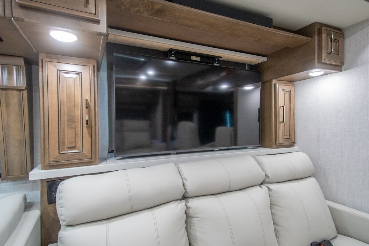 The 2025 Fleetwood Discovery LXE 40M is a luxury motorhome designed for comfortable and stylish travel. Built on a Freightliner XCM chassis and powered by a 380-horsepower Cummins I6 diesel engine, it offers a smooth and efficient drive. Measuring just over 40 feet in length, the 40M provides ample space for relaxation and entertainment. The interior features porcelain tile flooring, hardwood cabinetry, and polished solid surface countertops. The living area includes plush seating and a pop-up LED TV, while the kitchen is equipped with a residential refrigerator, convection microwave, and a two-burner induction cooktop. The master suite boasts a king-size bed, dual wardrobes, and a full rear bath with dual sinks, a tile shower with a seat, and a stackable washer and dryer. Additional amenities include a bath and a half, a fireplace, and multiple TVs, including an exterior entertainment center with a Bluetooth speaker. With its
