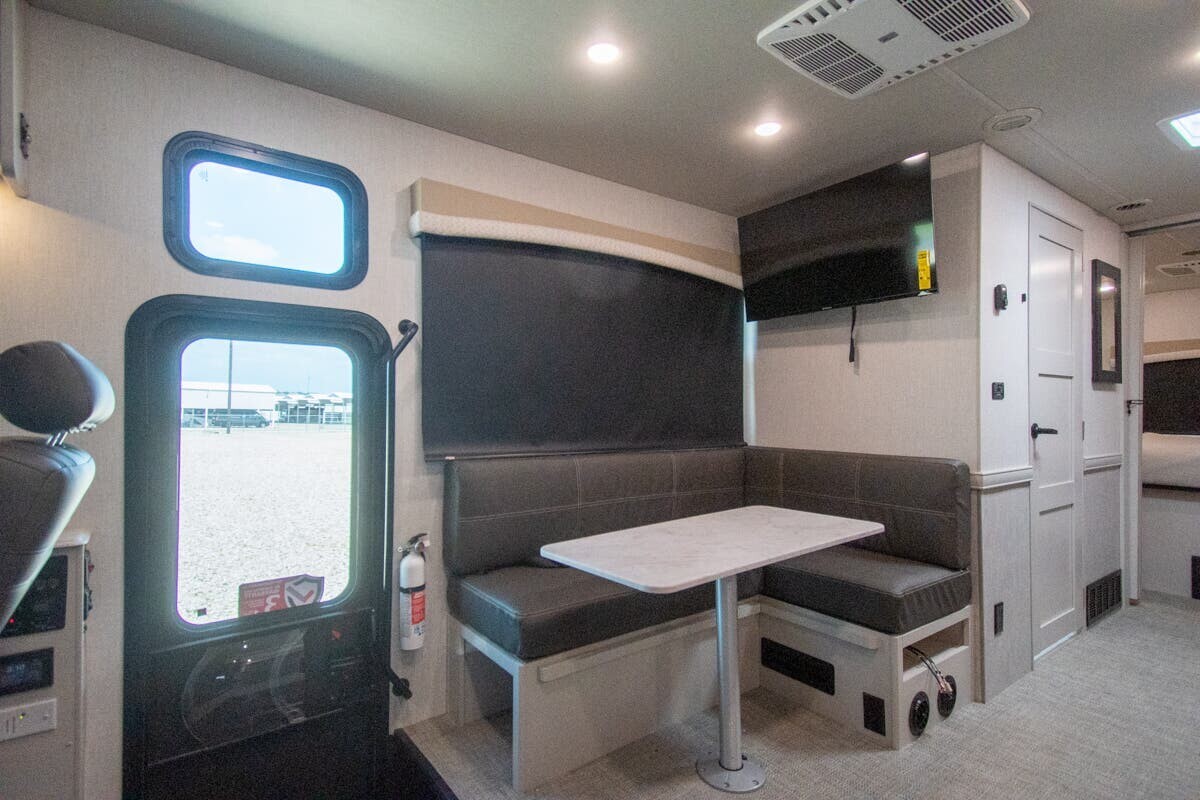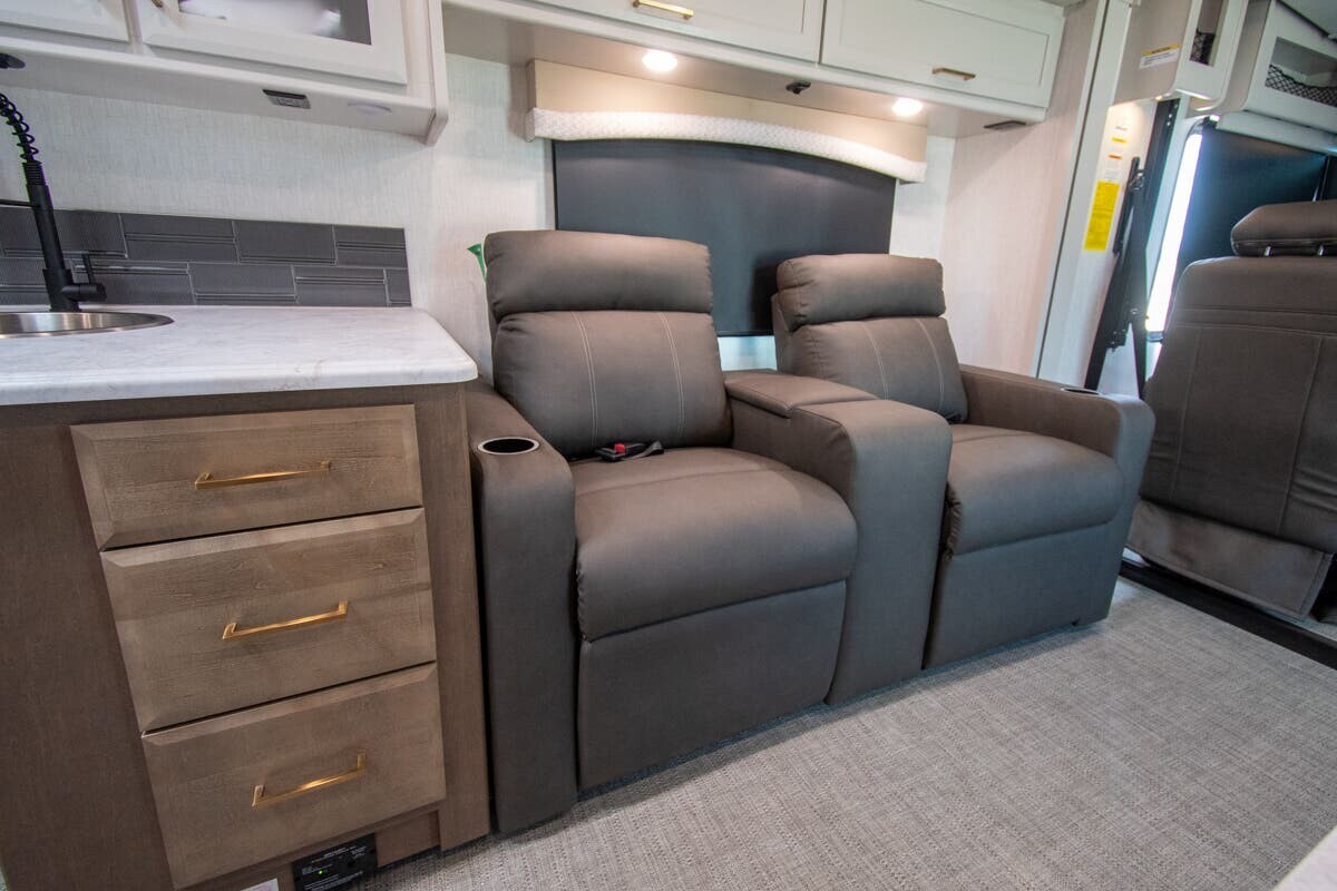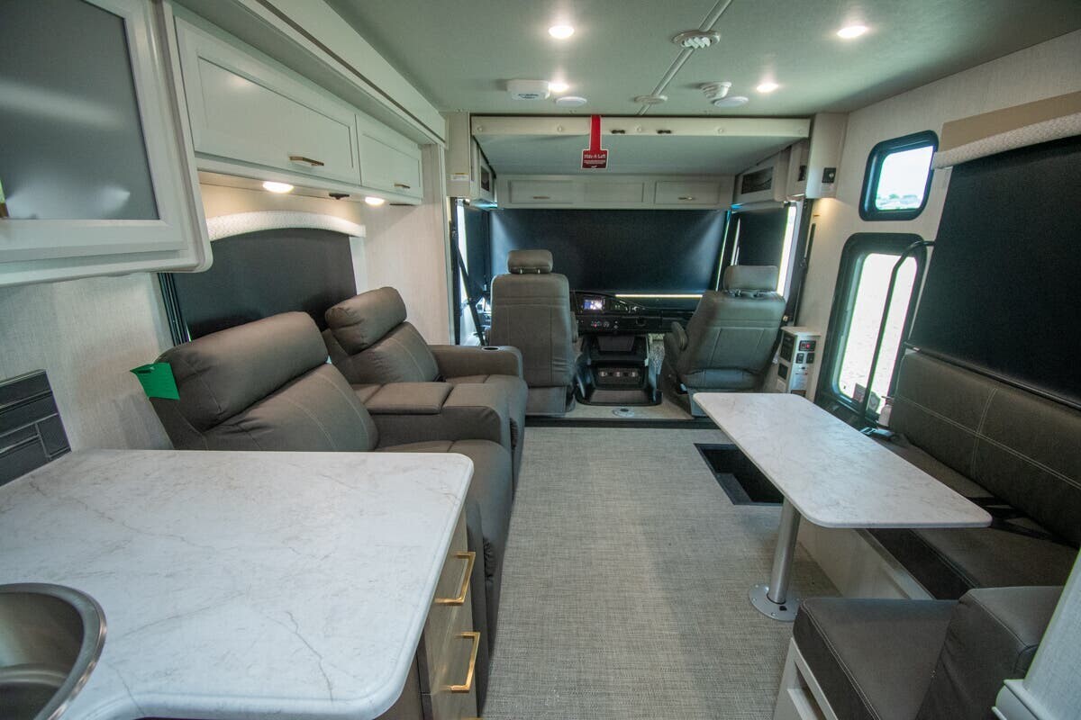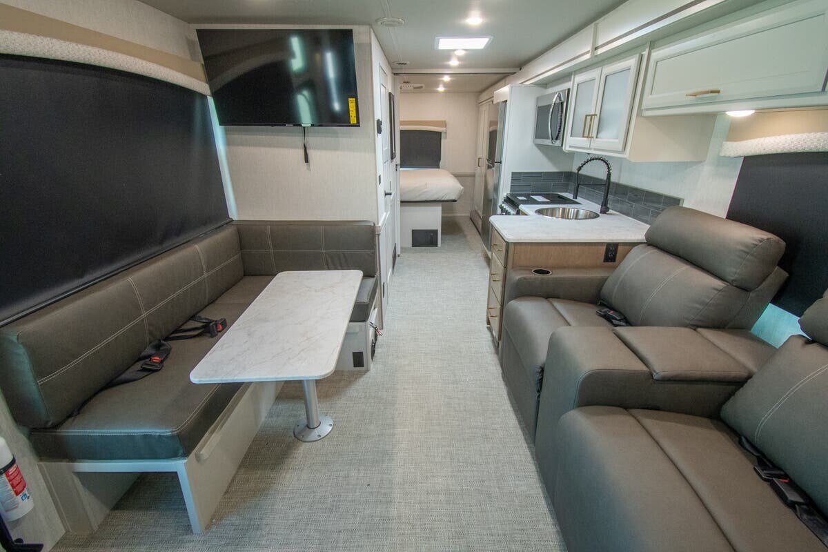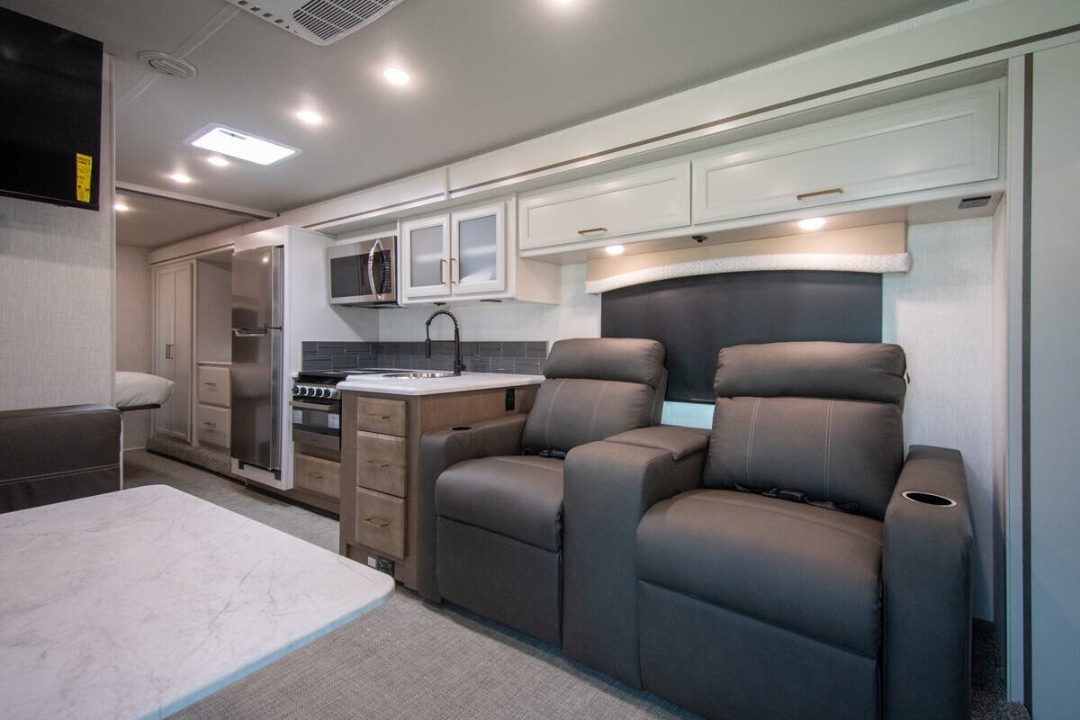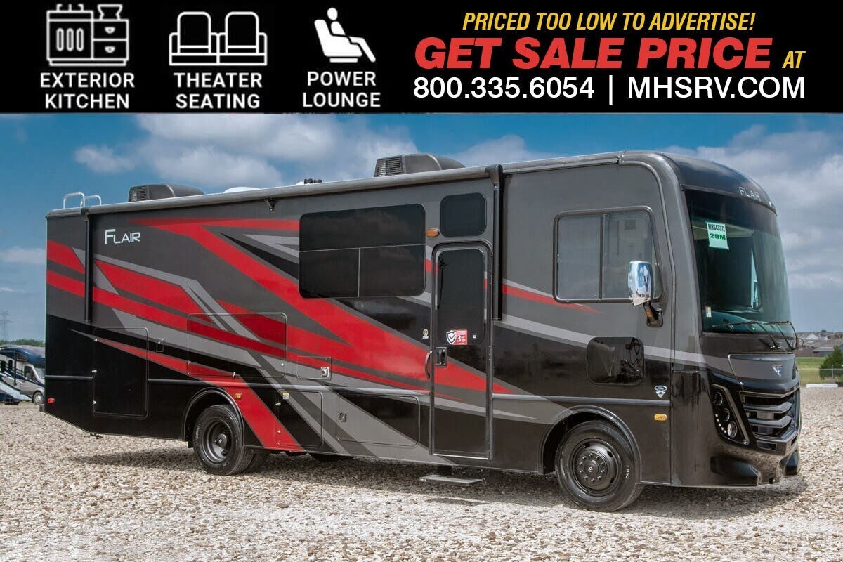 The 2025 Fleetwood Flair 29M is a top choice for travelers seeking comfort and convenience on the road. This Class A motorhome combines modern design with practical features, making it ideal for both short trips and extended adventures.**Exterior Features:**The Flair 29M boasts a sleek, aerodynamic profile that enhances driving efficiency. Its durable aluminum body and fiberglass sidewalls are adorned with elegant graphics, adding a touch of style. A 20-foot power retractable awning with LED lighting provides ample outdoor living space, perfect for relaxation or entertaining. The exterior kitchen, equipped with a refrigerator, sink, and microwave, allows for convenient outdoor cooking. Ample storage compartments ensure you can bring along all your essentials.**Interior Comfort and Amenities:**Inside, the Flair 29M offers a spacious and thoughtfully designed living area. The open floor plan includes an L-shaped dinette