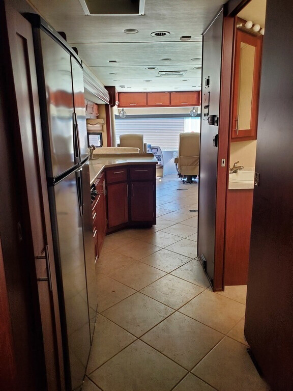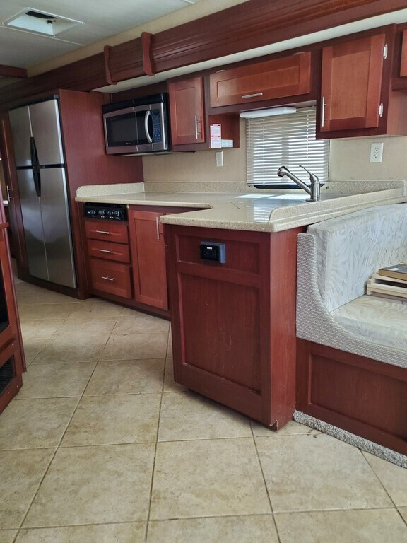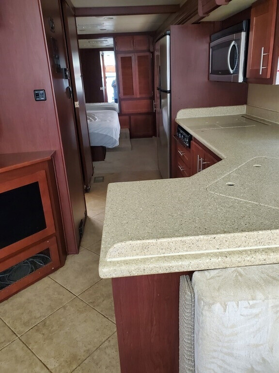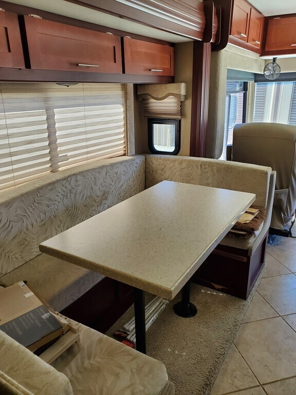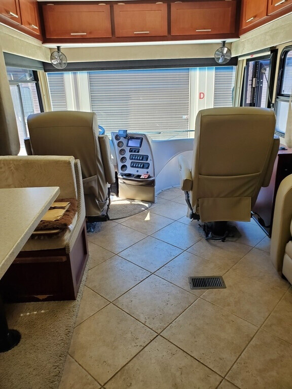 New upgraded marine and hospital grade fabrics in captain’s chairs and fold out sofa, Wilderness RV king size mattress for the bedroom,