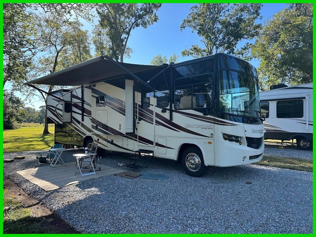 This Georgetown is powered by a 6.8L V10 engine and a 5-speed automatic transmission with 39,000 miles. The overall length is 34.33 feet, and it comes equipped with 3 power-retractable slide-outs, a 17-foot power awning, 2 A/C units, an Onan generator, and room to sleep up to 6. This unit has been well-maintained.