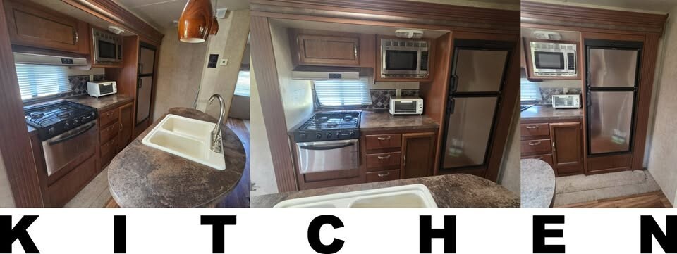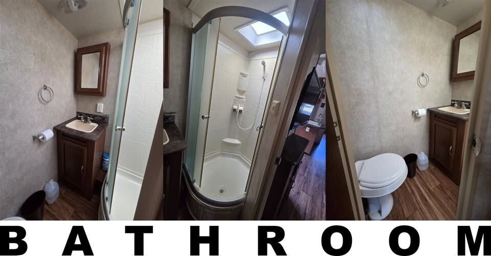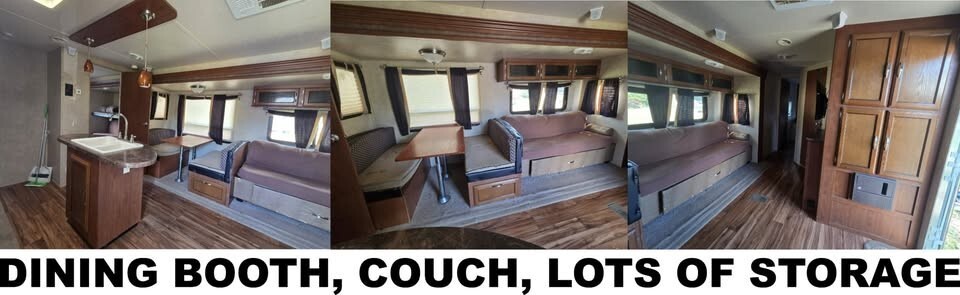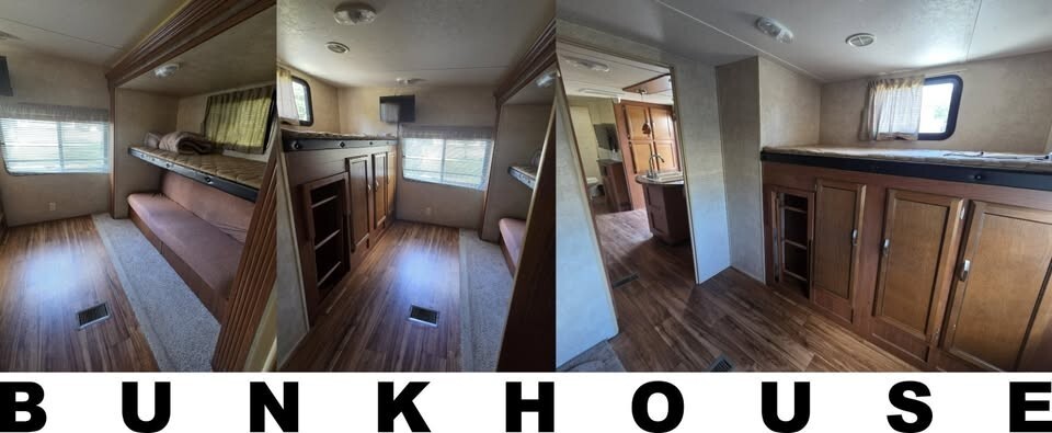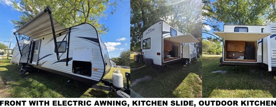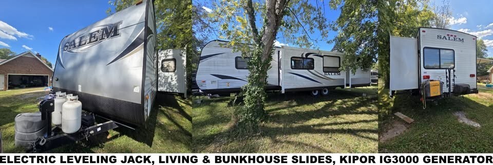 Bumper pull, 8500 pounds dry weight. 30-amp electric service. Three slides (kitchen, living, bunkhouse) provides LOTS of living space. Electric leveling jack, stabilizer jacks, & awning for easy, push-button set-up. Features a queen bed, bunkhouse sleeps 3 comfortably, dinette booth converts to bed, couch coverts to bed. Sleeps up to 10. Spacious full kitchen with propane stove and oven, electric/propane refrigerator, island and twin basin sink. Bathroom with standing shower. TV with BluRay/CD player in living area. TVs in master bedroom and bunkhouse. Outdoor kitchen features a small refrigerator, sink, lots of storage, and rear-bumper mounted propane grill. Storage under bed with access from outside and access to propane water heater. Large roof-mounted A/C (not sure of model or BTU capacity). Central, vented heat. KIPOR IG3000 quiet gas generator. Starts with the turn of a key or a rope pull. Needs carburetor cleaned in order to run properly. Large black and grey water tanks with interior gauges to monitor the levels inside. Comes with leveling blocks, two 30-amp power cords, and a full weight distribution and anti-sway hitch system.