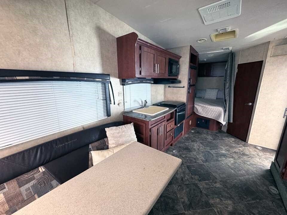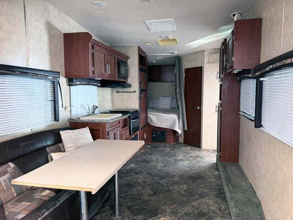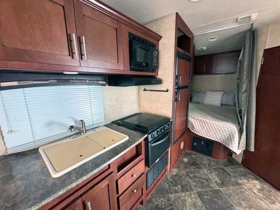 Enjoy the convenience of a fully equipped kitchen with a double sink, microwave, and 3-burner range. The queen bed at the front provides restful comfort after long days outdoors. With 86 gallons of fresh water, onboard fuel storage, and an aerodynamic design, this unit is ready for off-grid getaways or RV park stays alike.