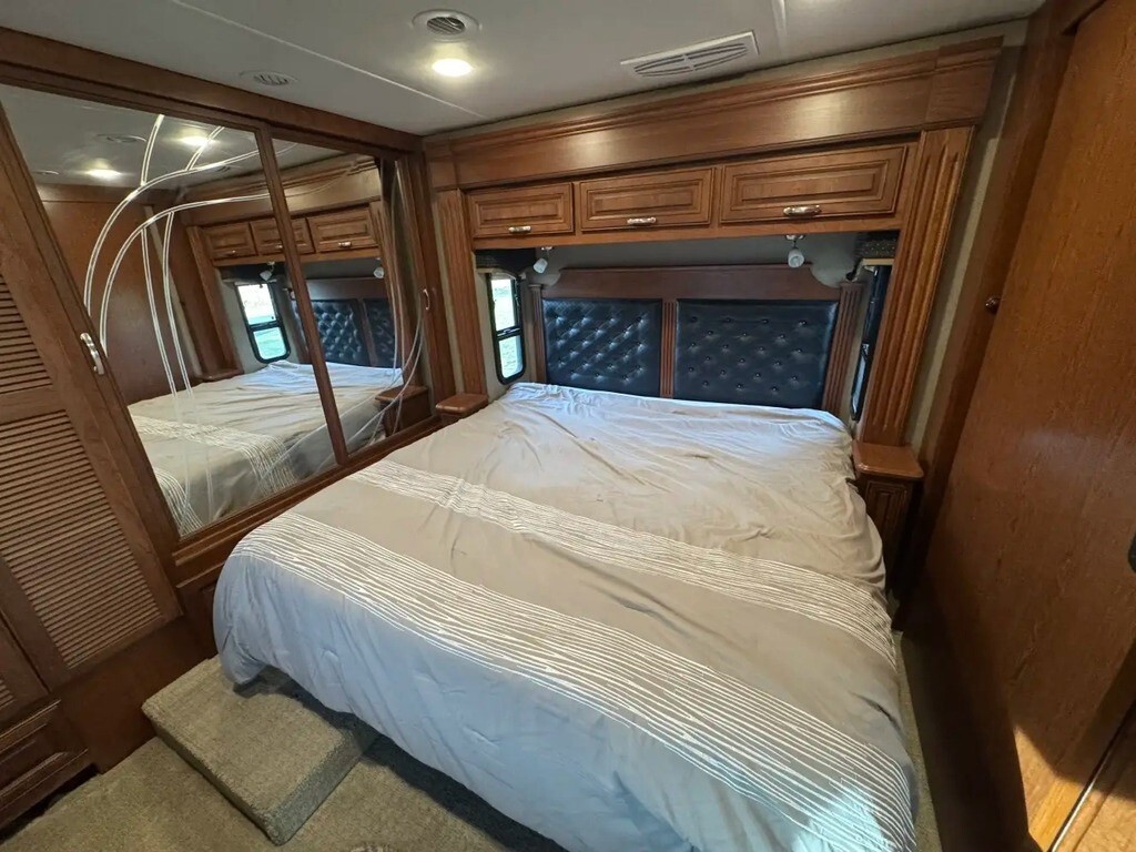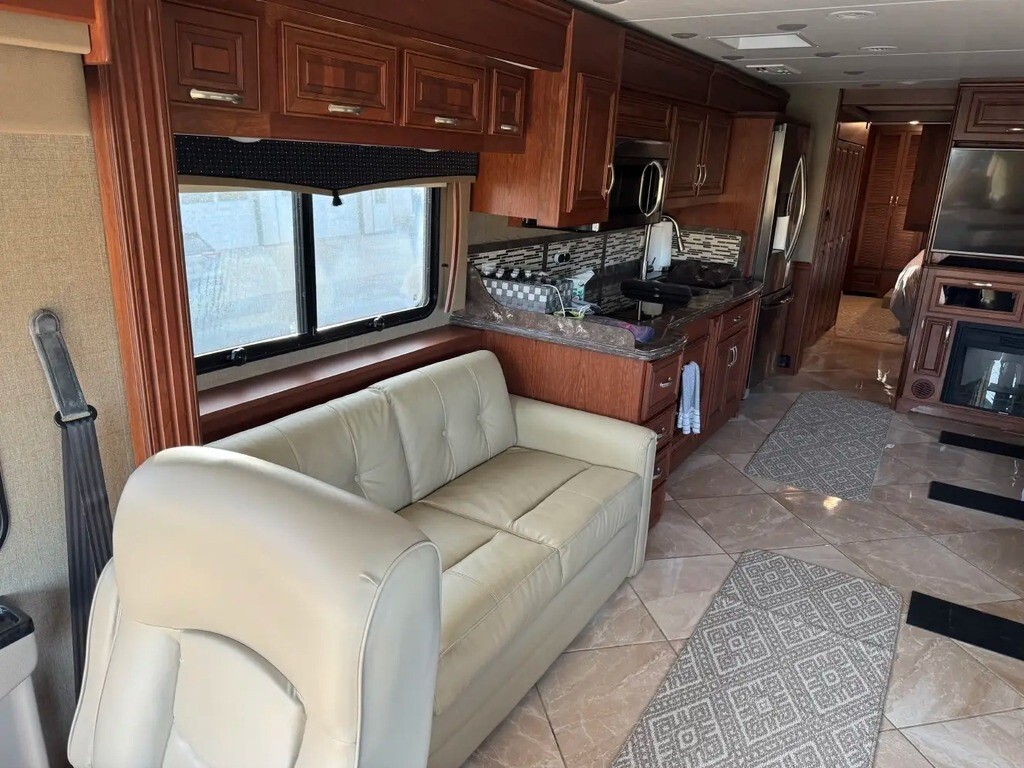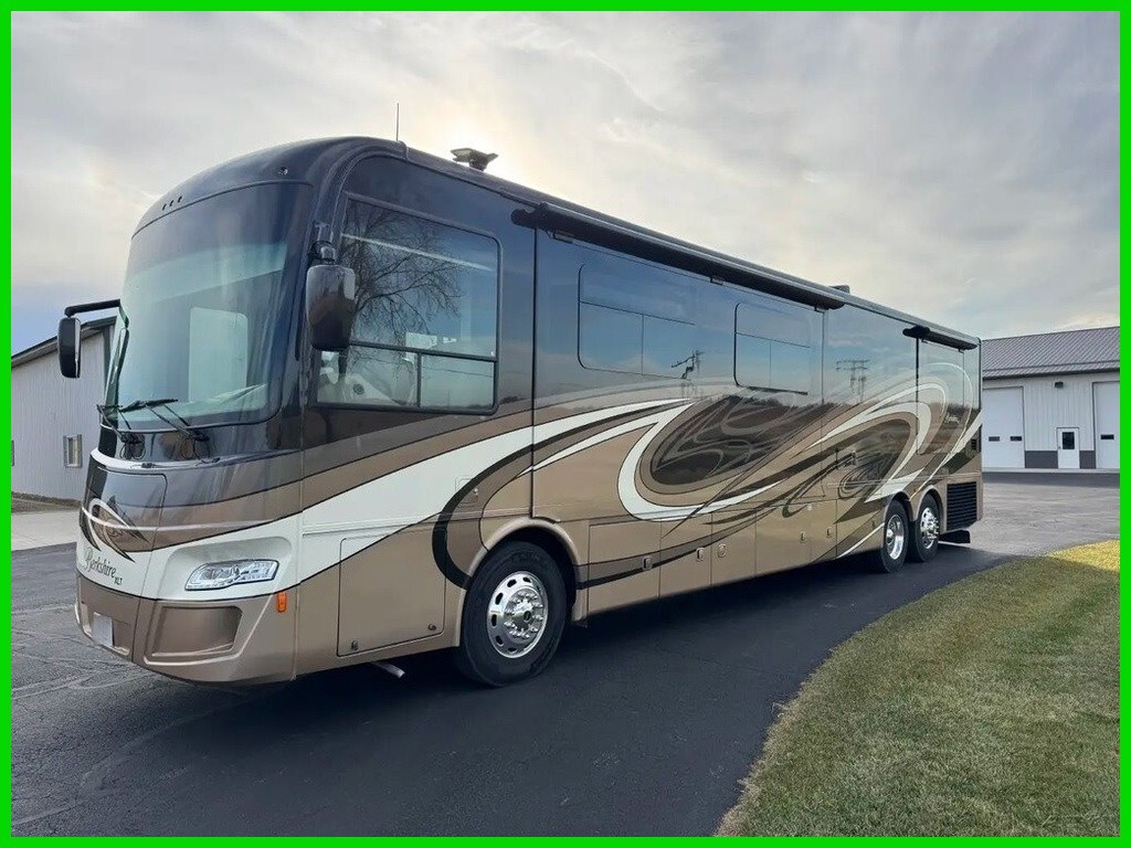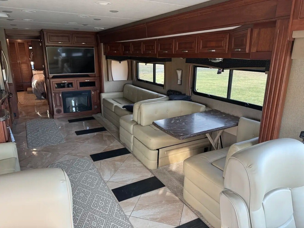 This Forest River is powered by a 450HP Cummins diesel engine and a 6-speed automatic transmission with 40,918 miles. The overall length is 42.83 feet, and it comes equipped with 4 power-retractable slide-outs, a 15.8-foot power awning, 3 A/C units, a diesel generator, bunk beds, a fireplace, an outdoor entertainment system, and room to sleep up to 10. This unit has been well-maintained.