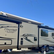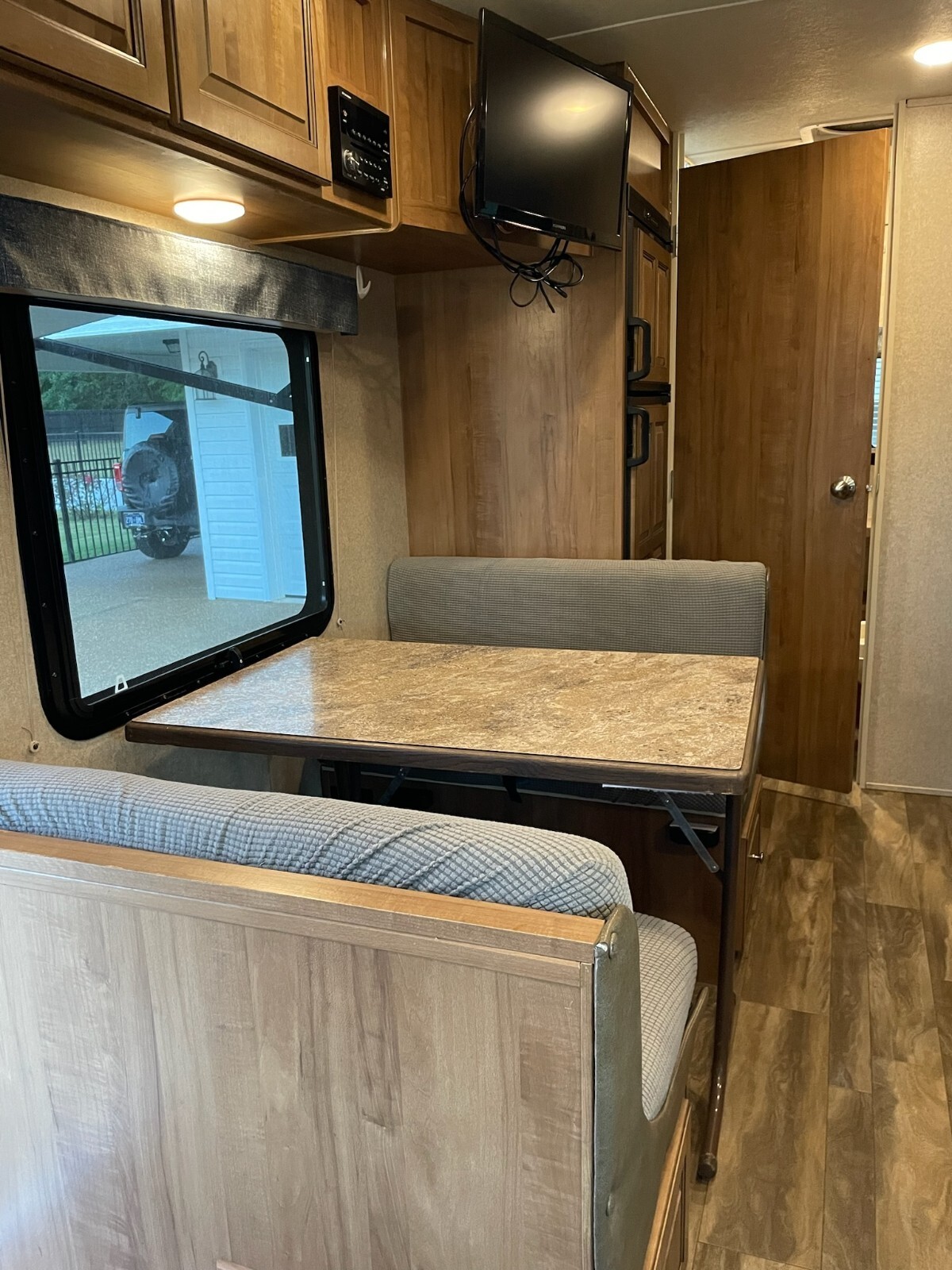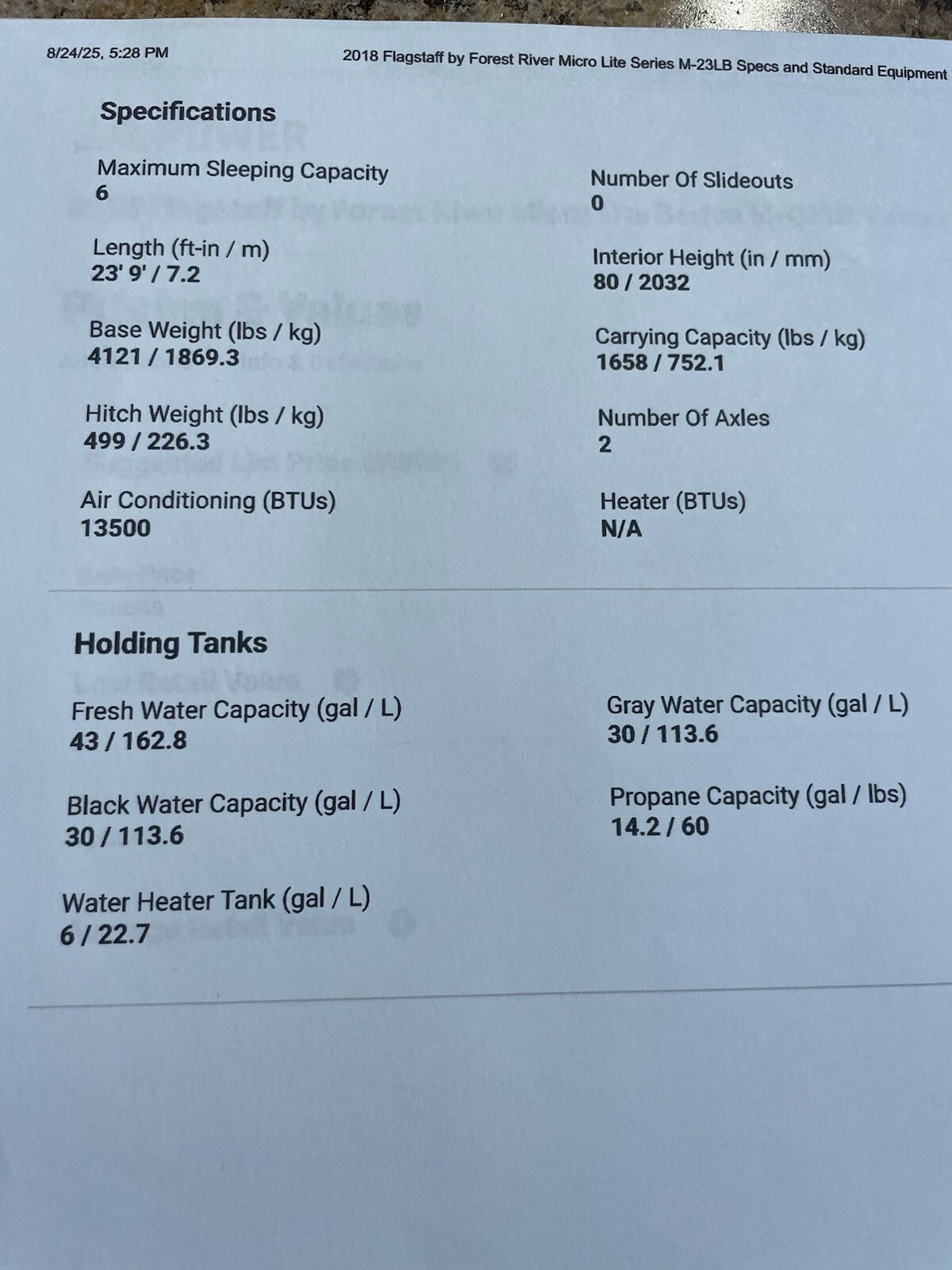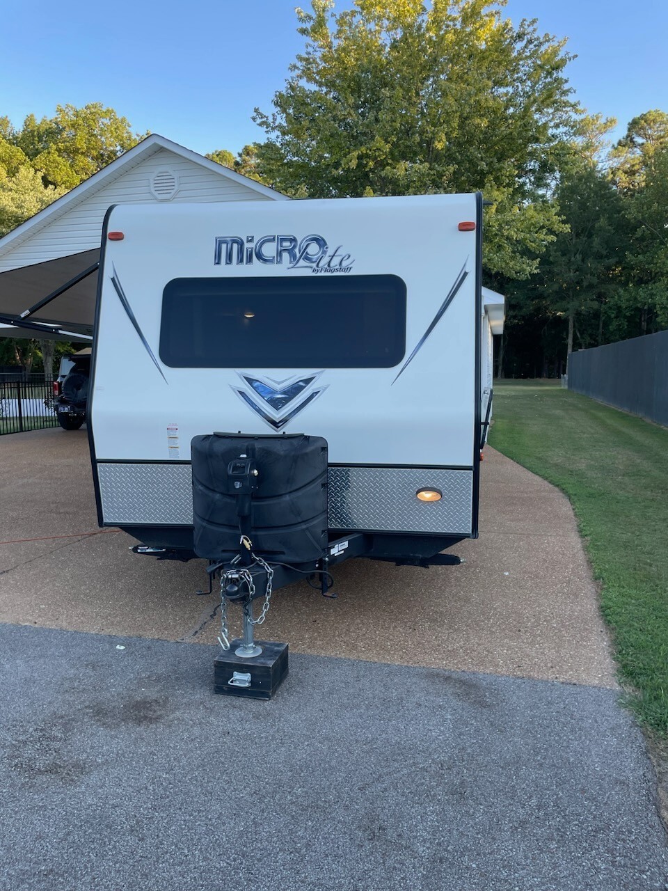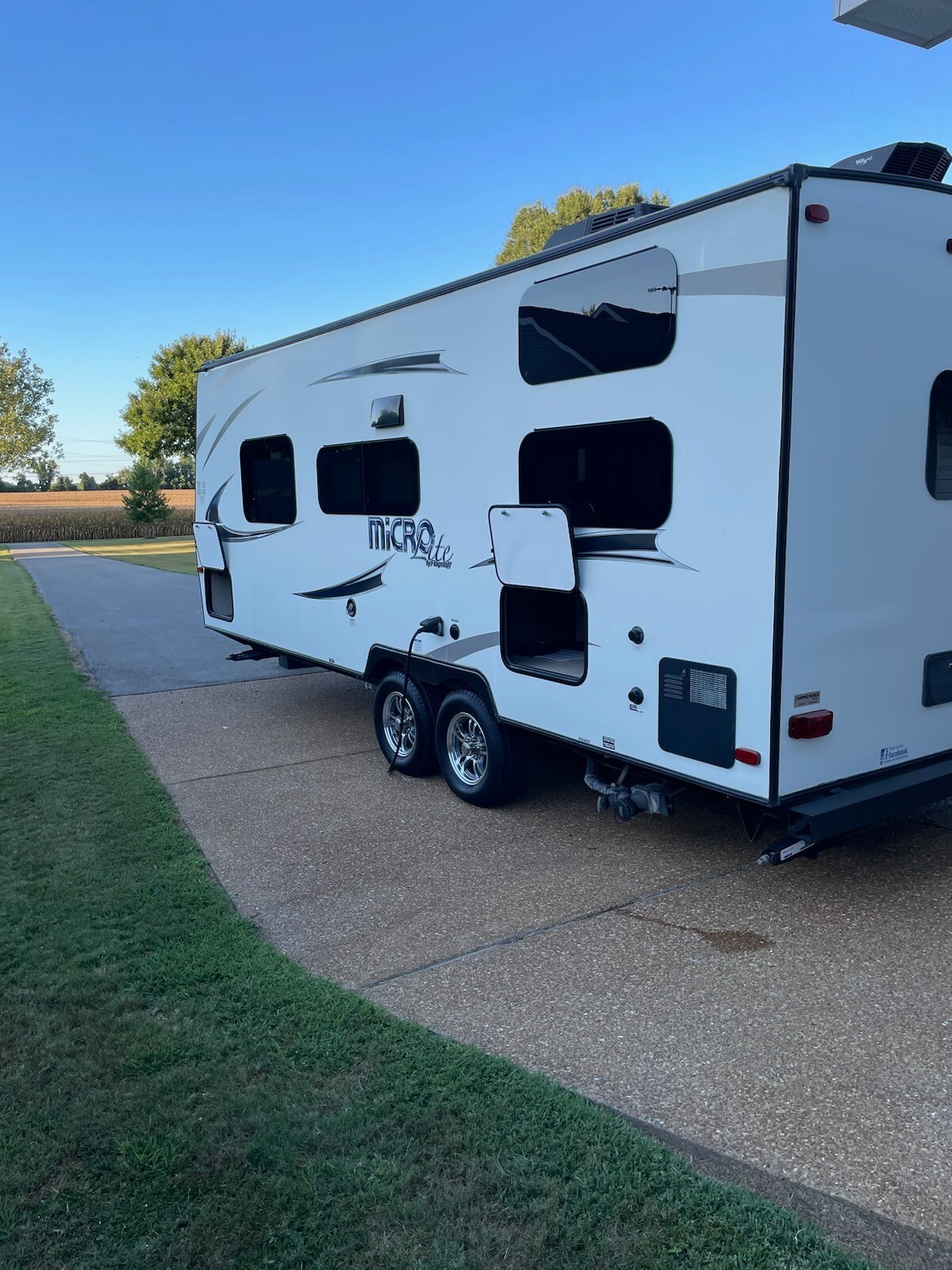2018 Flagstaff Micro Lite 23LB. 1/2 ton towable. Gently used but very clean. Everything works. Comes with accessories: weight distributing hitch, electric tongue jack, drinking water hose, outside grill, leveling pads, water pressure regulator, RV surge protector, electric awning, aluminum wheels, outside shower, tinted windows, and TV. Sleeps 5 to 6 people with master bed, rear bunks, and dinette makes an extra bed. New mattress on master bed.