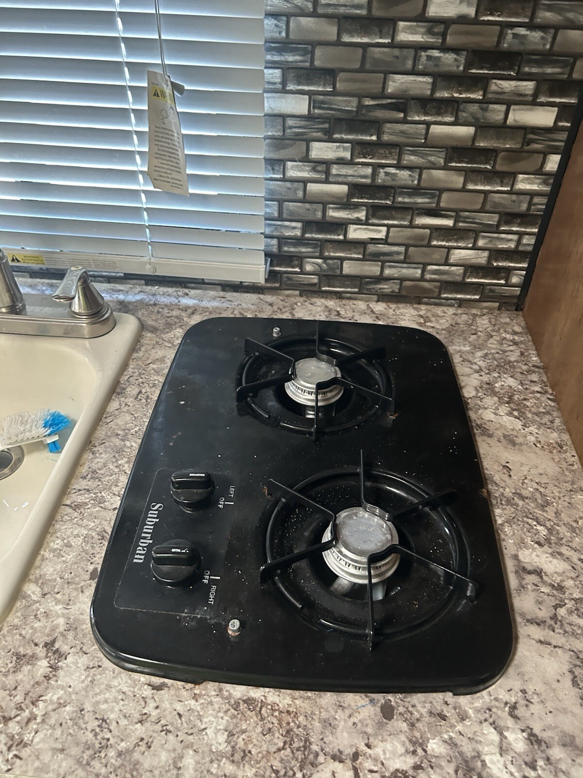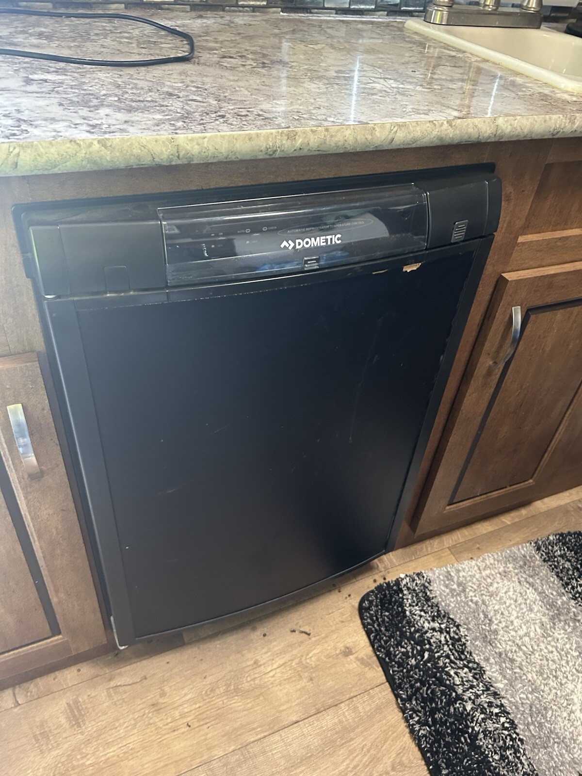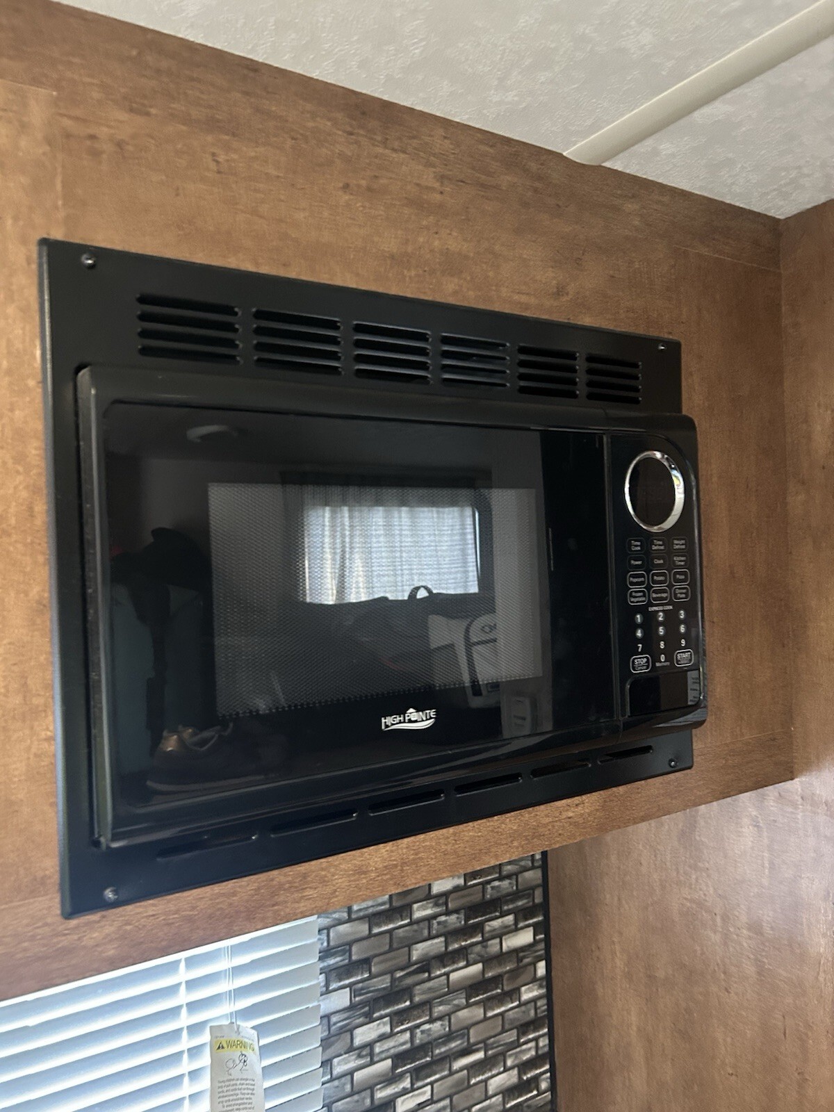 Microwave. Refrigerator. Stove top. Shower stall. Toilet.