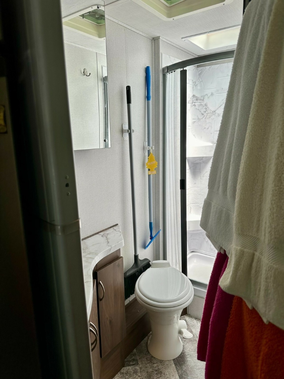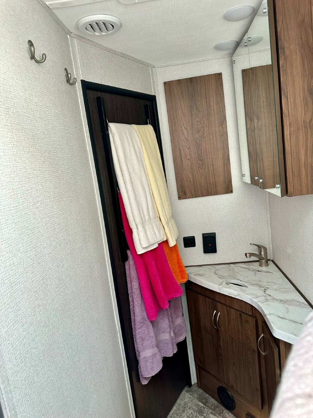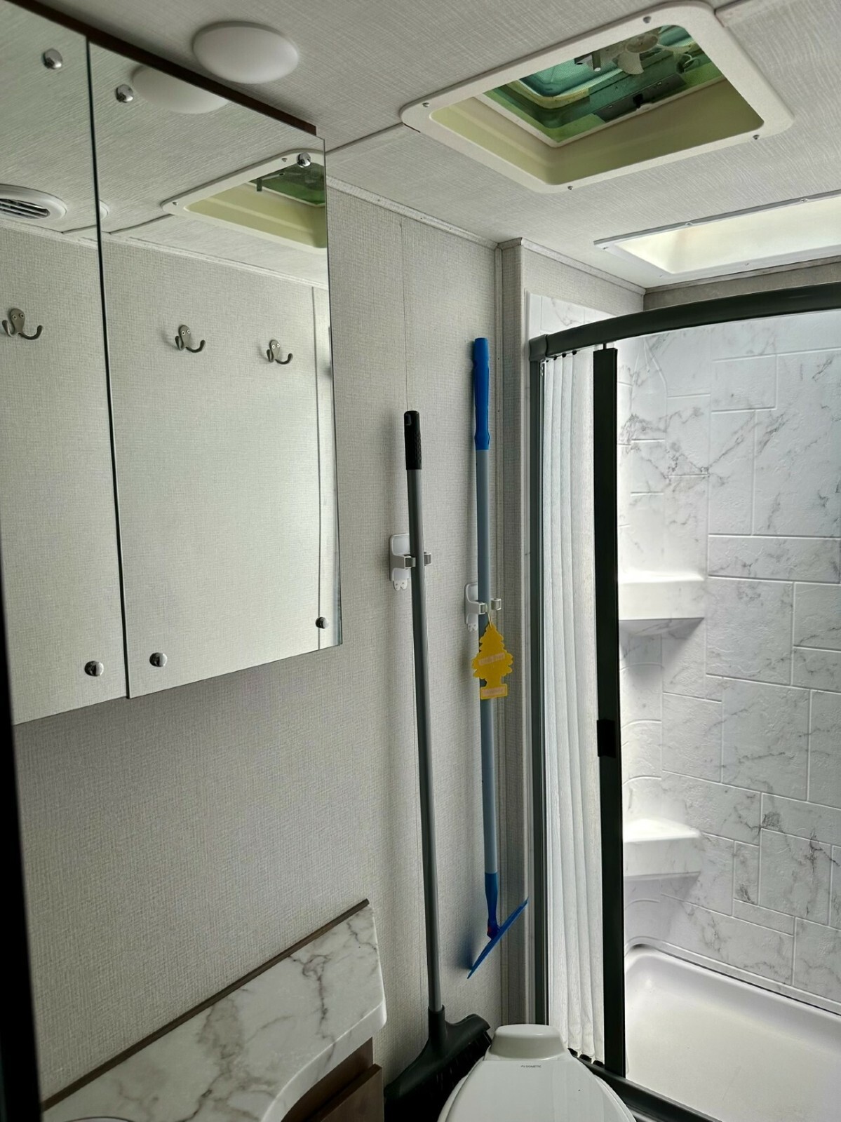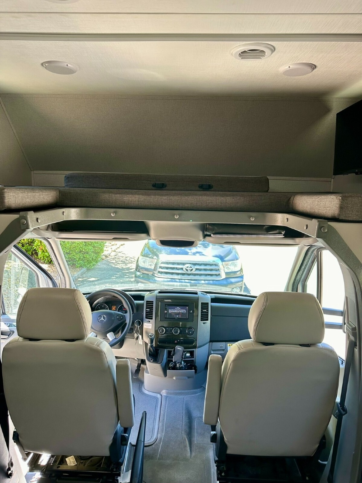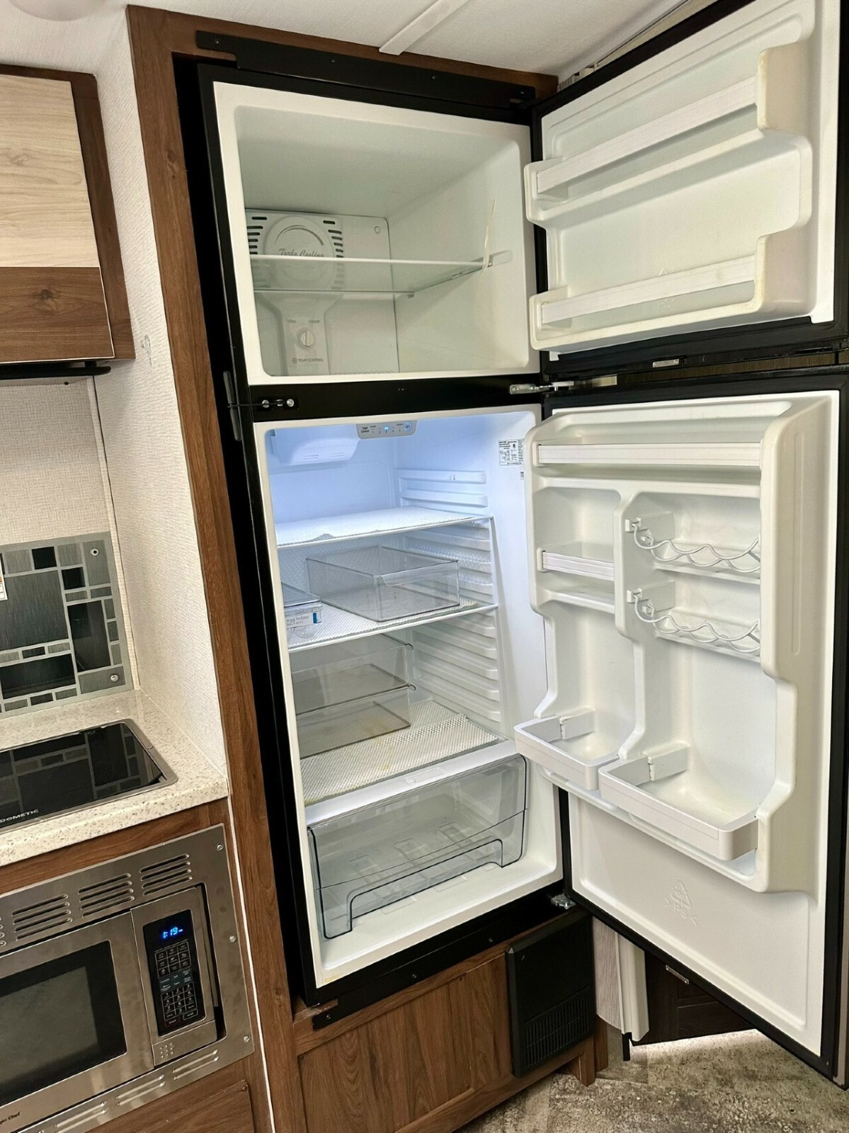 Relax in style with leather driver and passenger swivel seats.Prepare delicious meals in the well-equipped kitchen featuring solid surface countertops, a convection microwave, and a spacious refrigerator.Enjoy the outdoors under the adjustable electric awning with LED light strip, perfect for evenings spent under the stars.Peace of Mind on Every Journey: