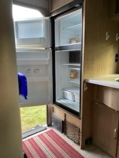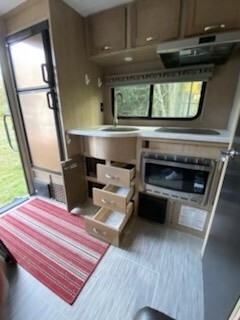 Inside, you’ll find a cozy, thoughtfully laid-out interior with residential-style cabinetry, hardwood drawers, and expandable cargo netting for extra storage. The kitchen is ready for camp cooking with a two-burner stove, a microwave/convection oven, mid-size 3.7 cu. ft. 3-way refrigerator (electric/propane) and sink with cover/cutting board.
