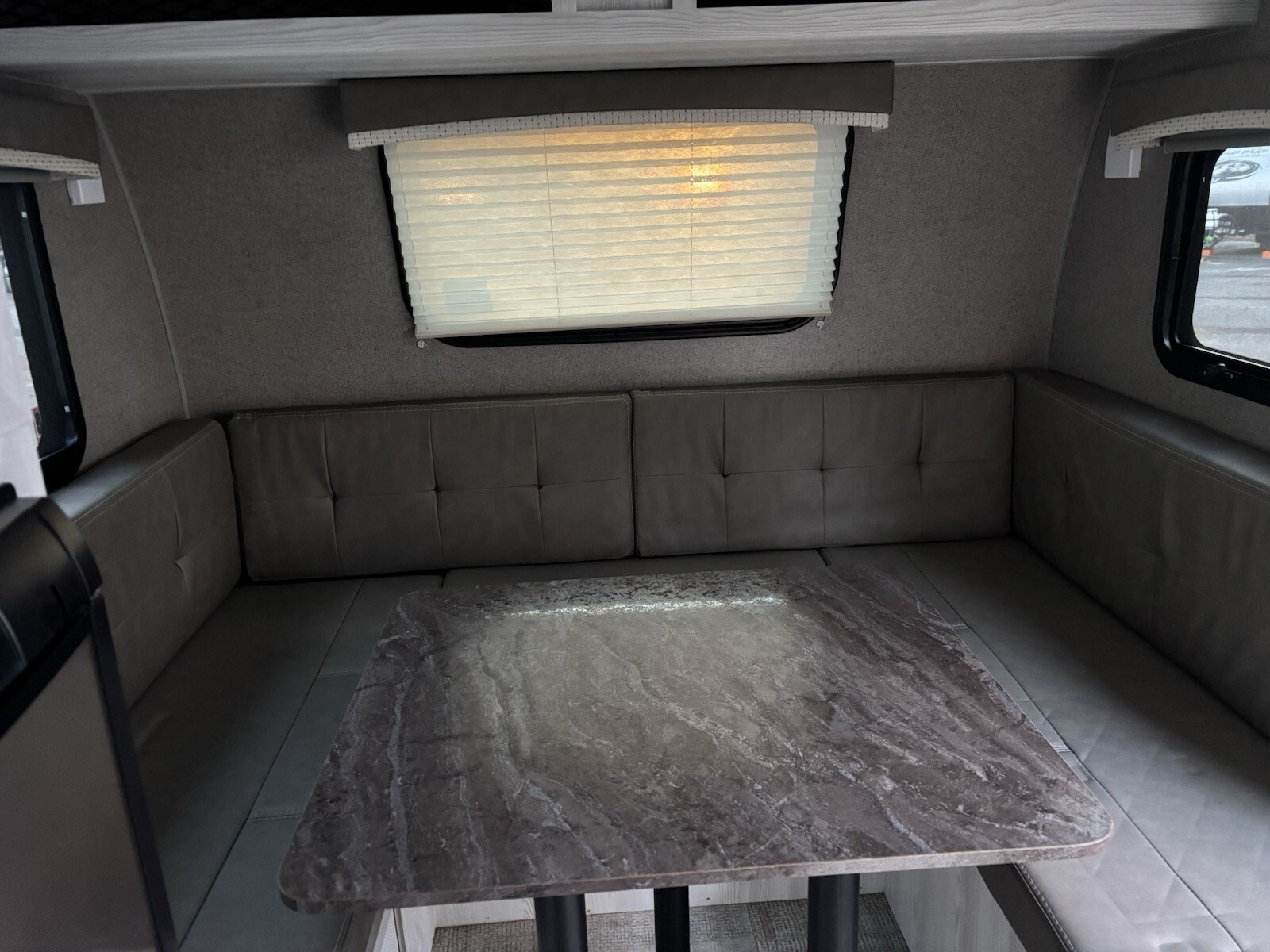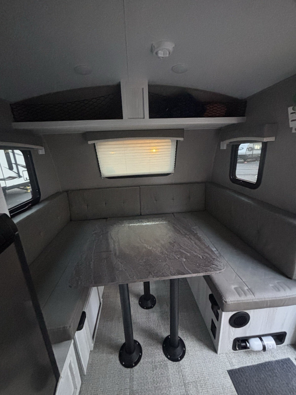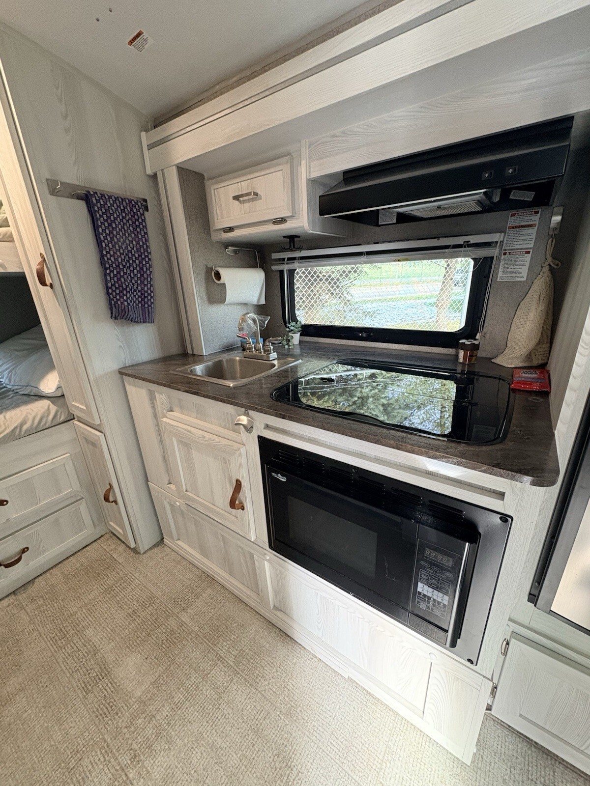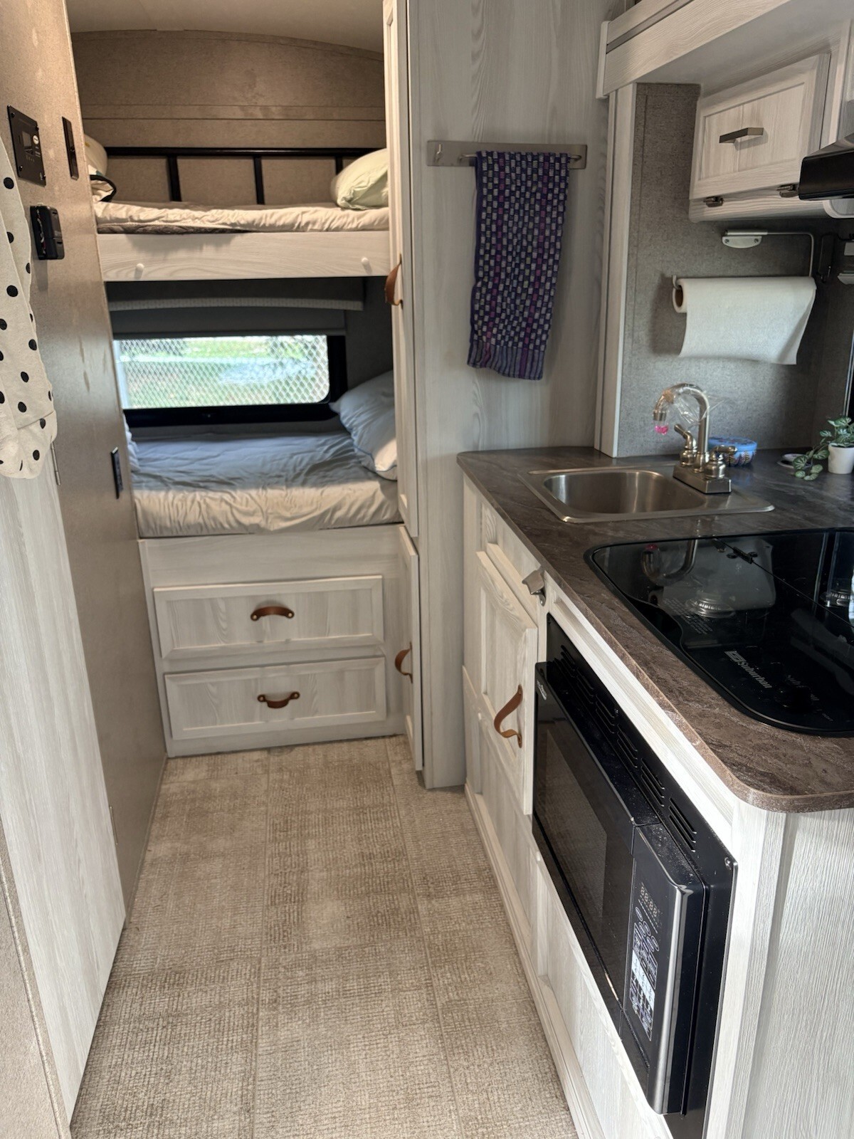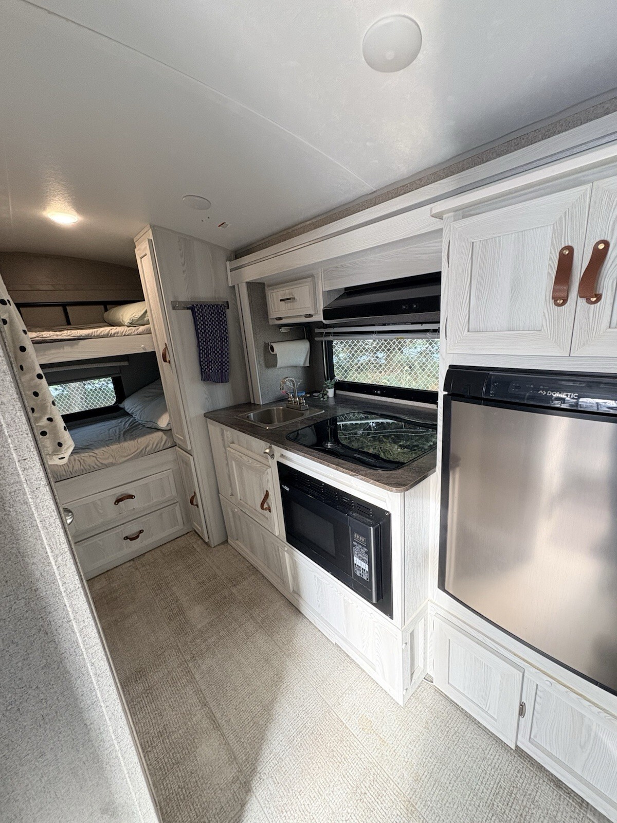 Sleeps 4• Bunk beds• Convertible U-shaped dinette• Full bathroom (toilet & shower)• Kitchen with fridge, microwave, and stove• Outdoor griddle & mini fridge• Solar panel• Plenty of interior & exterior storage