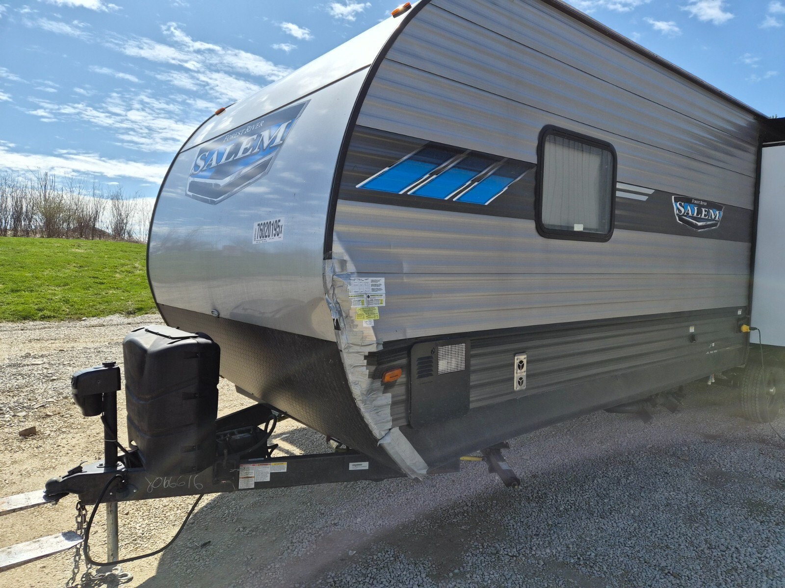 Just got this camper from insurance company due to minor driver side front corner damage as you can see. Nice easy spot to repair,3-4 hours to open up corner and fix wood,smooth siding back.Will look pretty good. Link below to nice video walk through of this model.