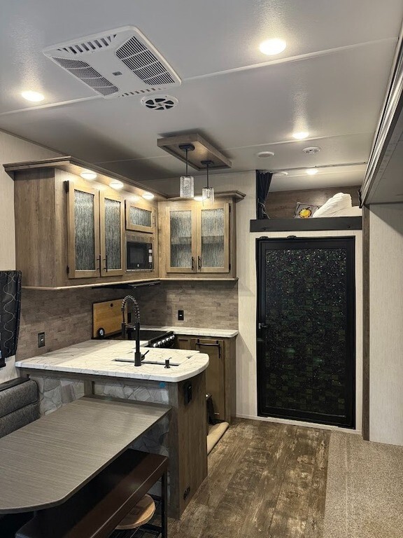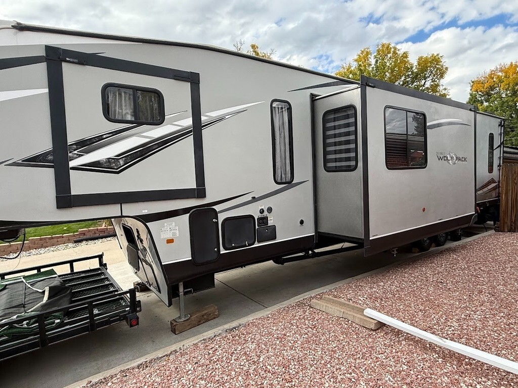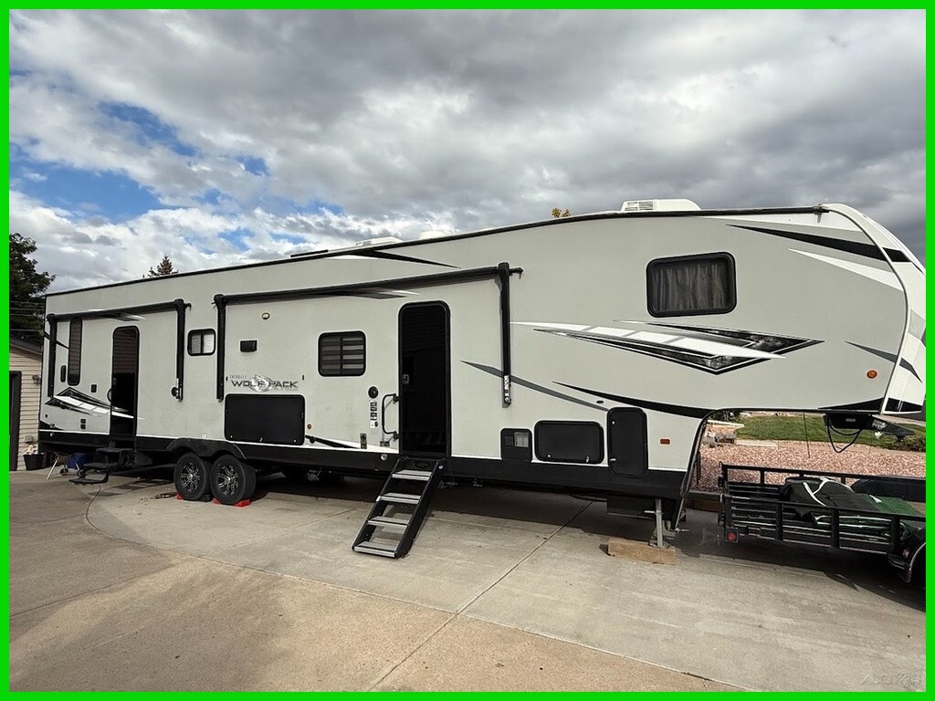 2021 Forest River Cherokee Wolf Pack 365PACK16 Platinum Fifth Wheel Toy Hauler For Sale in Centennial, CO 80122 This Forest River has an overall length of 43.58 feet and comes equipped with 2 power-retractable slide-outs, 2 power awnings, 2 A/C units, a generator, solar, a 15.83-foot garage, 1½ baths, a fireplace, an outdoor kitchen, and plenty of room to sleep 8. This unit has been well-maintained. Kitchen/Living Area Features 3-Burner Stove/Oven Overhead Fan Microwave Full-Size Fridge/Freezer Sink & Faucet Pantry/Storage Space Bench Seat