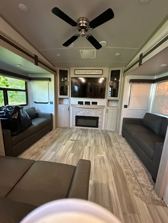 2021 Forest River Rockwood Ultra Lite 2898KS This 2021 Forest River Rockwood Ultra Lite 2898KS fifth wheel is spacious, clean, and in excellent condition throughout. The layout features four slide-outs and a rear living design that makes the interior bright and open. Inside, you’ll find two fold-out sleeper couches, a reclining loveseat, a fireplace with a 50” Smart TV, and a full kitchen with a high-top table and chairs. The bedroom includes a TV, queen bed, and large closet. Additional highlights include dual air conditioners, LED awning lights, a Bluetooth sound system with outdoor speakers, hitch and wiring for towing a boat, and ample storage throughout. Comes with an inline water filtration system with filters, a new 30-foot 50-amp cord, and a Sunbeam cooktop grill. This