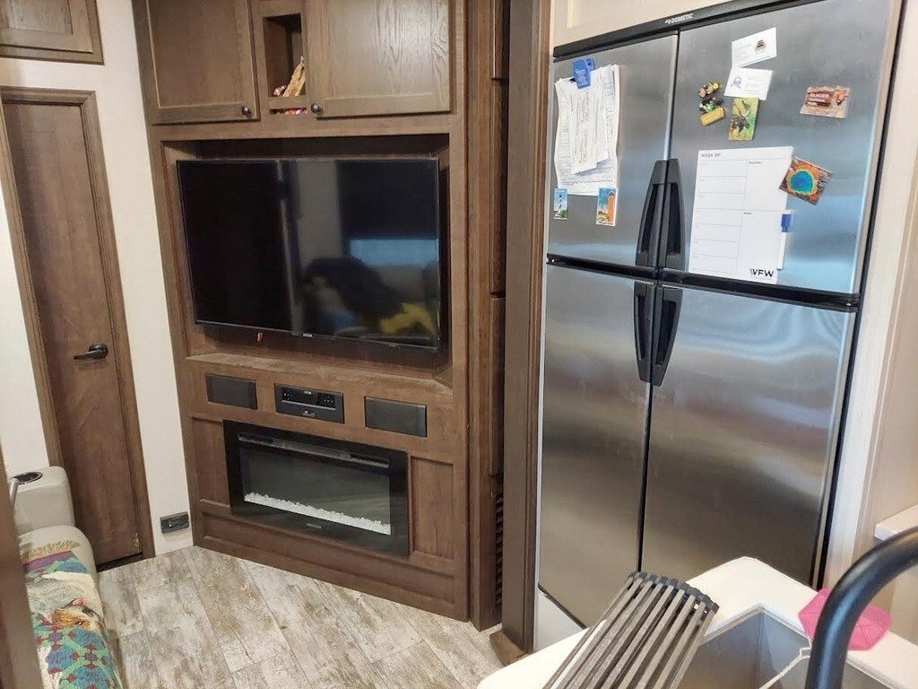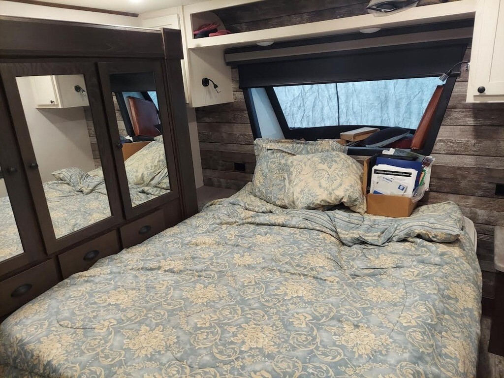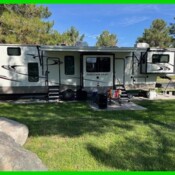 This Forest River has an overall length of 37.83 feet and comes equipped with 3 power-retractable slide-outs, an 18-foot power patio awning, 2 A/C units, a generator, a 11-foot garage, 1½ baths, a fireplace, and plenty of room to sleep 8. This unit has been well-maintained.