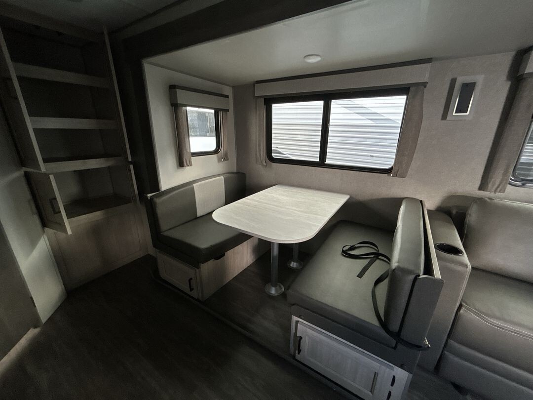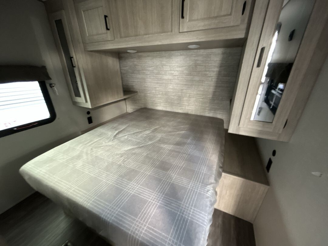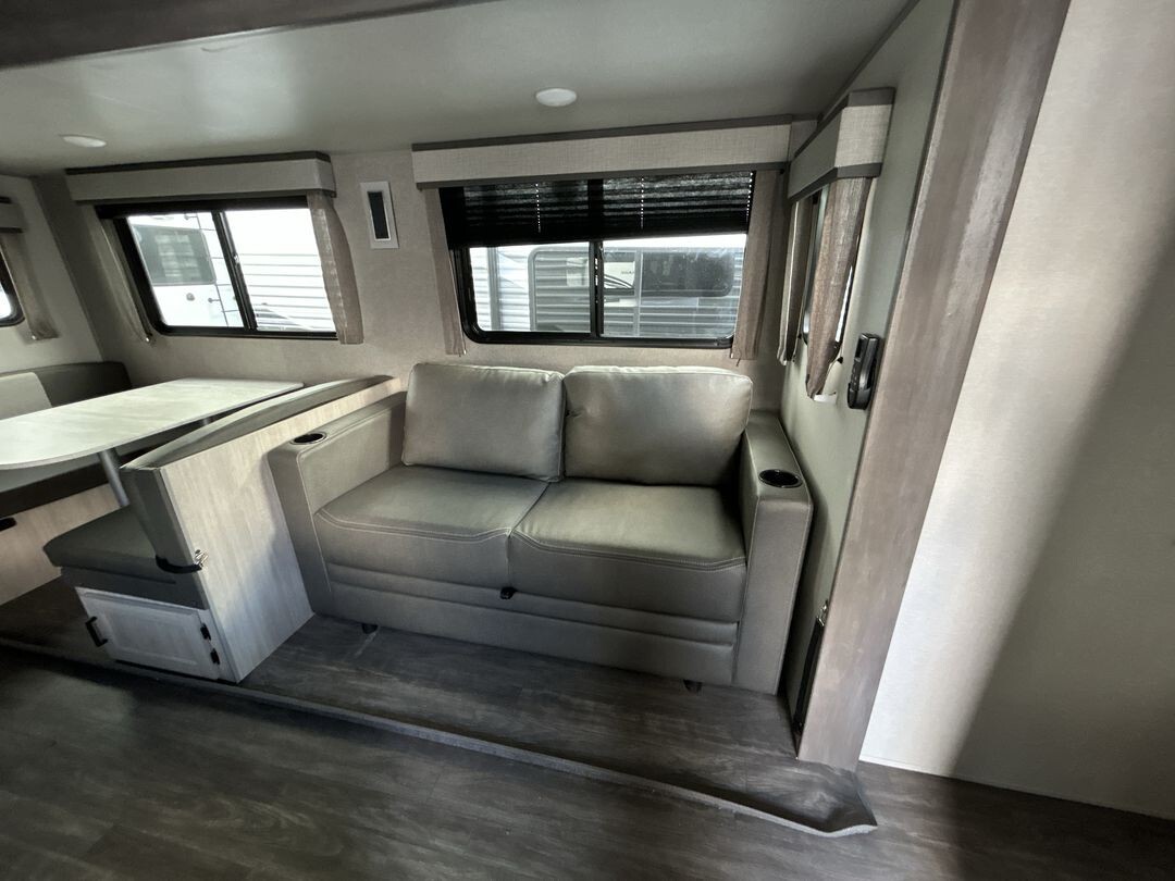 The Forest River Aurora 24RBS is a great choice for travelers seeking comfort and convenience on the road. This travel trailer is designed with quality construction and thoughtful features to enhance your camping experience.Measuring approximately 28 feet in length, the 24RBS offers a spacious interior layout. The aerodynamic exterior design not only looks appealing but also contributes to better fuel efficiency. The durable fiberglass exterior is easy to maintain and built to withstand various weather conditions.Inside, the 24RBS features an open floor plan that maximizes space and functionality. Large windows allow natural light to fill the living area, creating a welcoming atmosphere. The living room includes a comfortable sofa and a booth dinette, both of which can be converted into additional sleeping areas if needed. An entertainment center with a flat-screen TV and built-in sound system provides entertainment options