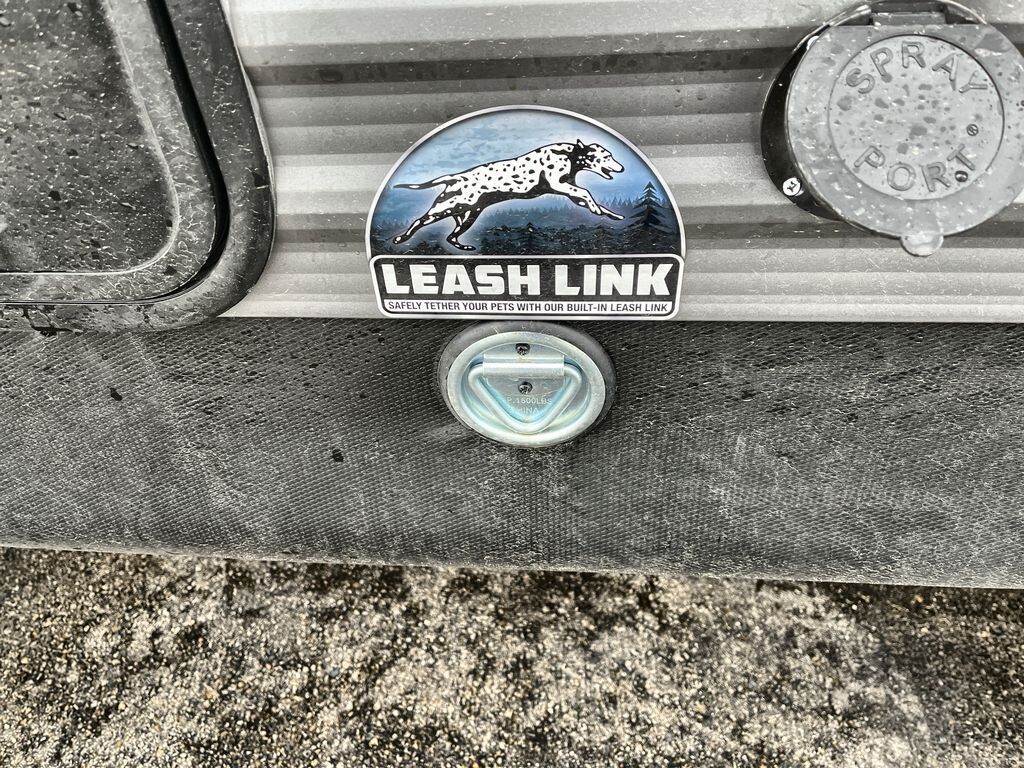 The well-appointed kitchen includes a three-burner cooktop, stainless steel GE 12V refrigerator, and a deep undermount farm-style sink with a high-rise faucet, making meal preparation a breeze. The U-shaped dinette and plush sofa in the living area offer comfortable seating and can convert
