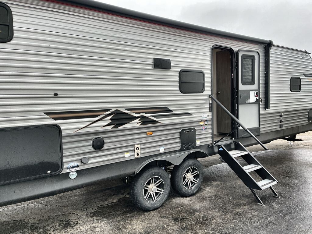 Introducing the 2025 Forest River Aurora 29TQS, a travel trailer designed to elevate your camping experience with comfort and modern amenities. Measuring 36 feet in length, this model offers ample space for families and groups, comfortably sleeping up to nine people. The rear private bunkhouse features a set of queen bunk beds with storage totes underneath and a linen closet, providing a cozy retreat for guests or children. The front private bedroom boasts a 60" x 74" queen bed with dual wardrobes, ensuring a restful night's sleep.