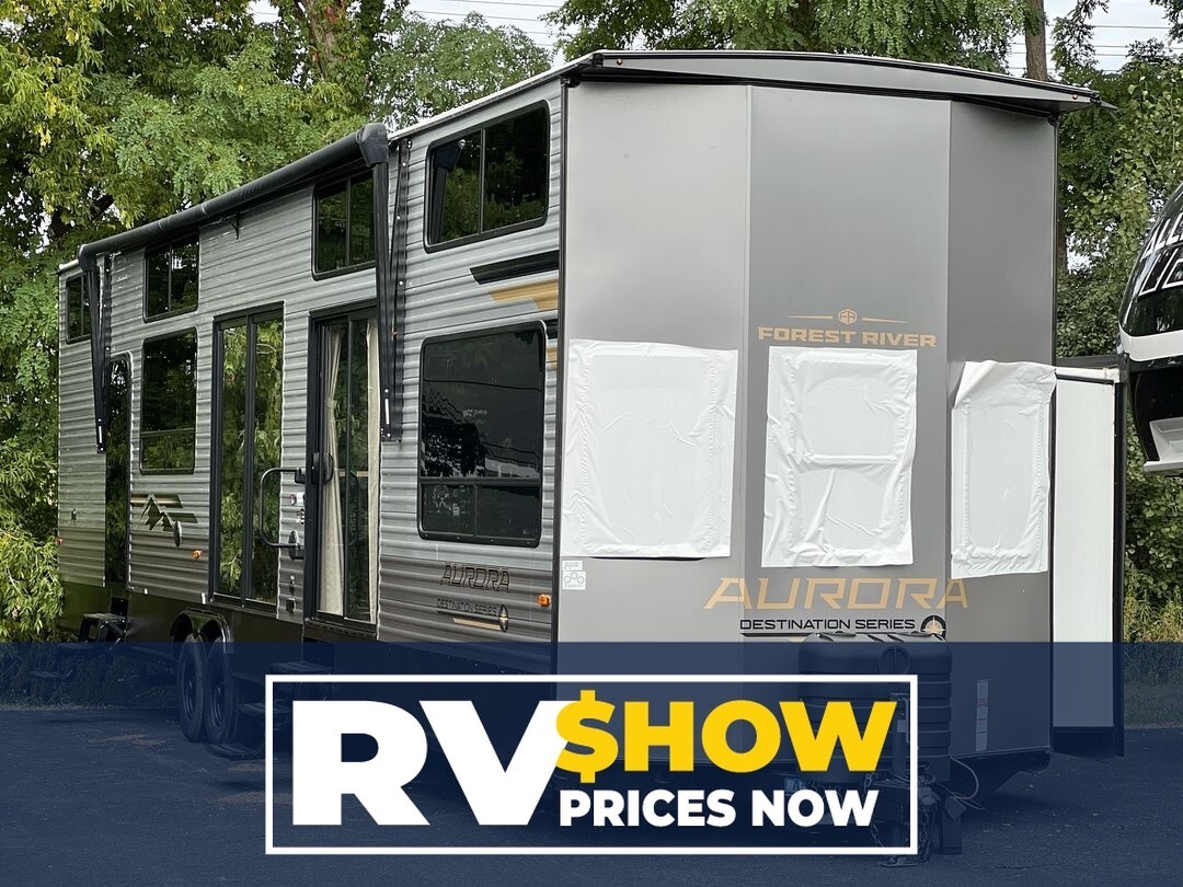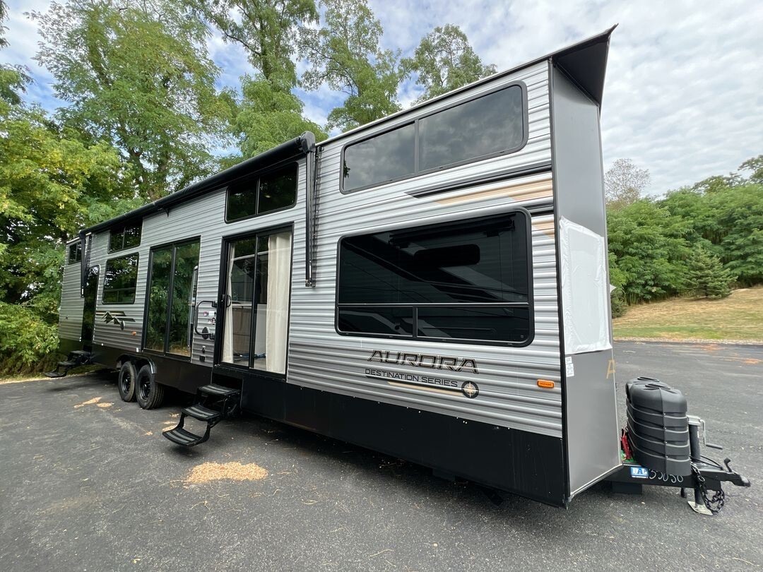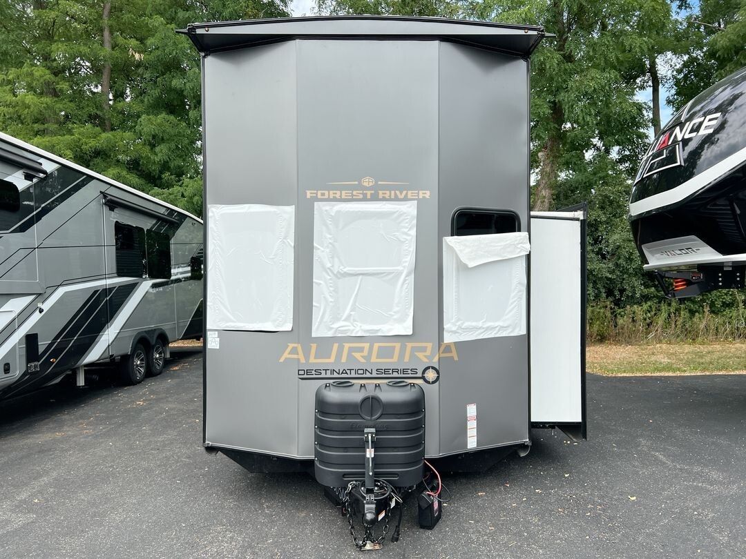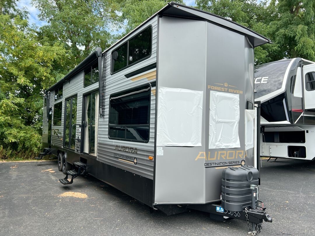 The Forest River Aurora Destination 42CONDO is a spacious and luxurious destination trailer designed for extended stays, offering the comforts of home combined with the freedom of the open road. Measuring 45.42 feet in length and 8.42 feet in width, this RV provides ample space for families or couples seeking a premium RV experience.The exterior of the 42CONDO features a sleek, modern design with durable construction. Large panoramic windows allow natural light to flood the interior while offering stunning views of your surroundings. A spacious 26-foot retractable awning provides the perfect outdoor relaxation and entertainment area, and multiple storage compartments accommodate all your travel essentials.Inside, the 42CONDO boasts an open floor plan that enhances the sense of space. The fully equipped kitchen includes modern appliances such as a full-size electric refrigerator, microwave, and a three-burner stove with an