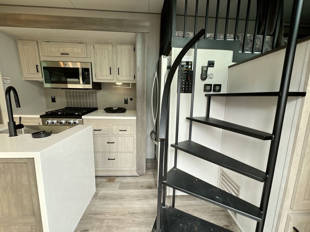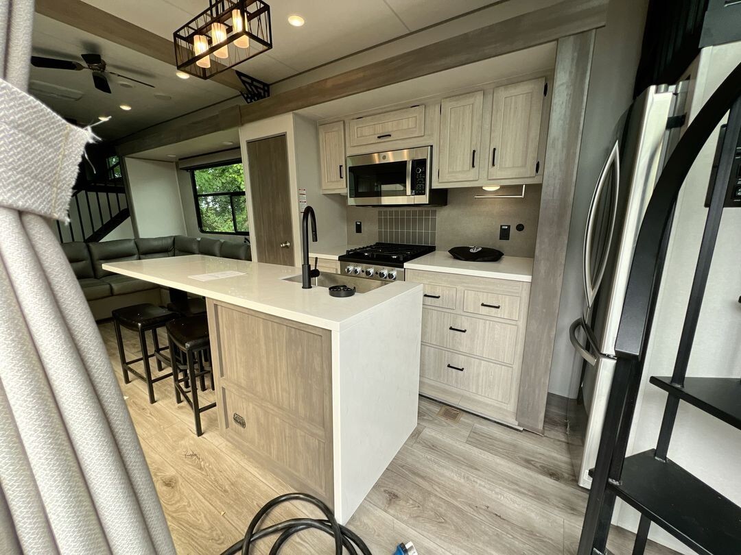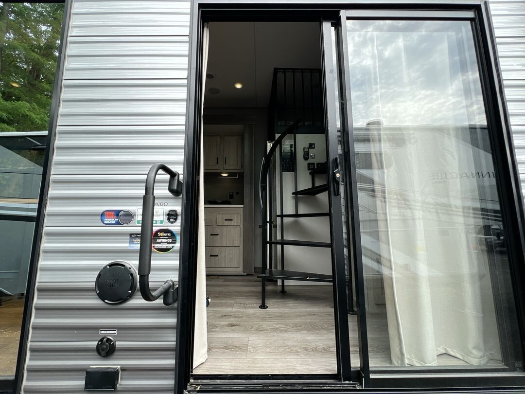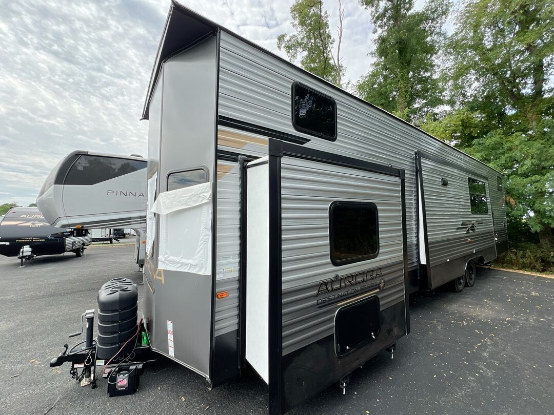 The Forest River Aurora Destination 42CONDO is a spacious and luxurious destination trailer designed for extended stays, offering the comforts of home combined with the freedom of the open road. Measuring 45.42 feet in length and 8.42 feet in width, this RV provides ample space for families or couples seeking a premium RV experience.The exterior of the 42CONDO features a sleek, modern design with durable construction. Large panoramic windows allow natural light to flood the interior while offering stunning views of your surroundings. A spacious 26-foot retractable awning provides the perfect outdoor relaxation and entertainment area, and multiple storage compartments accommodate all your travel essentials.Inside, the 42CONDO boasts an open floor plan that enhances the sense of space. The fully equipped kitchen includes modern appliances such as a full-size electric refrigerator, microwave, and a three-burner stove with an