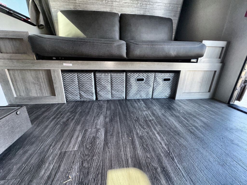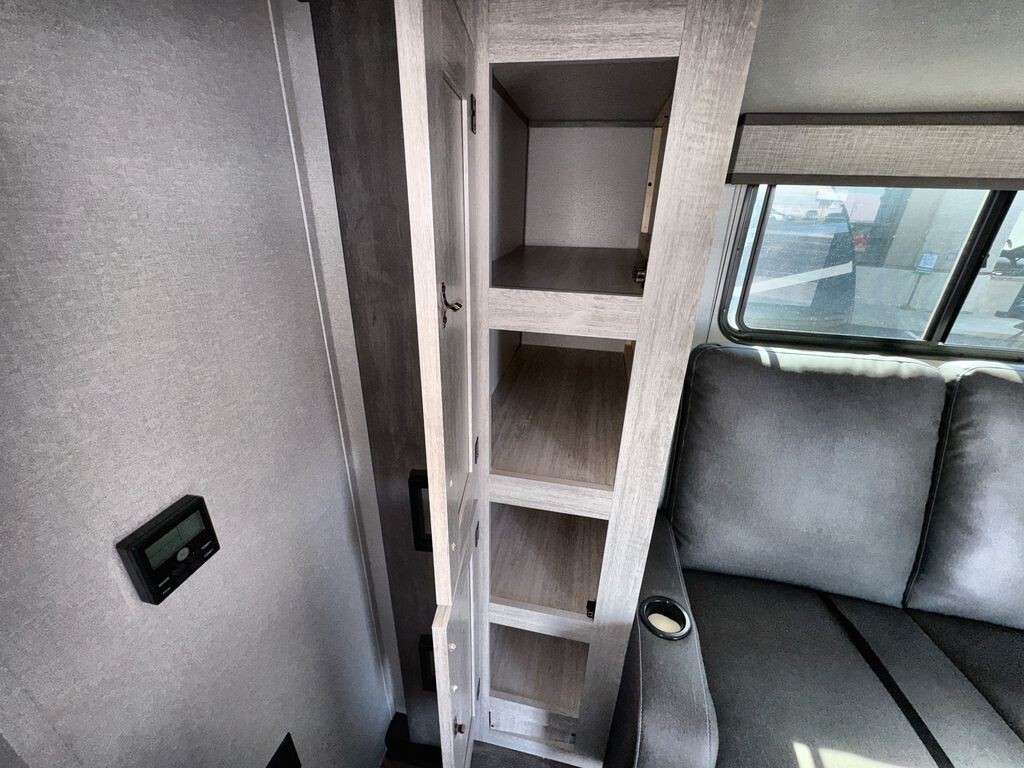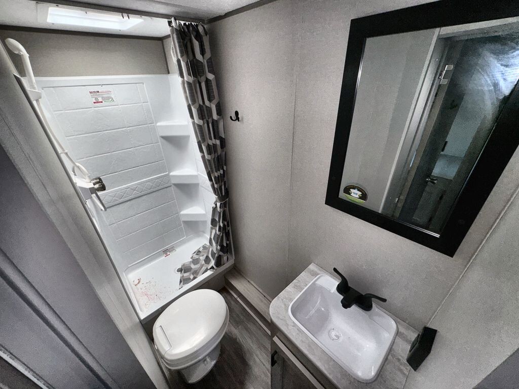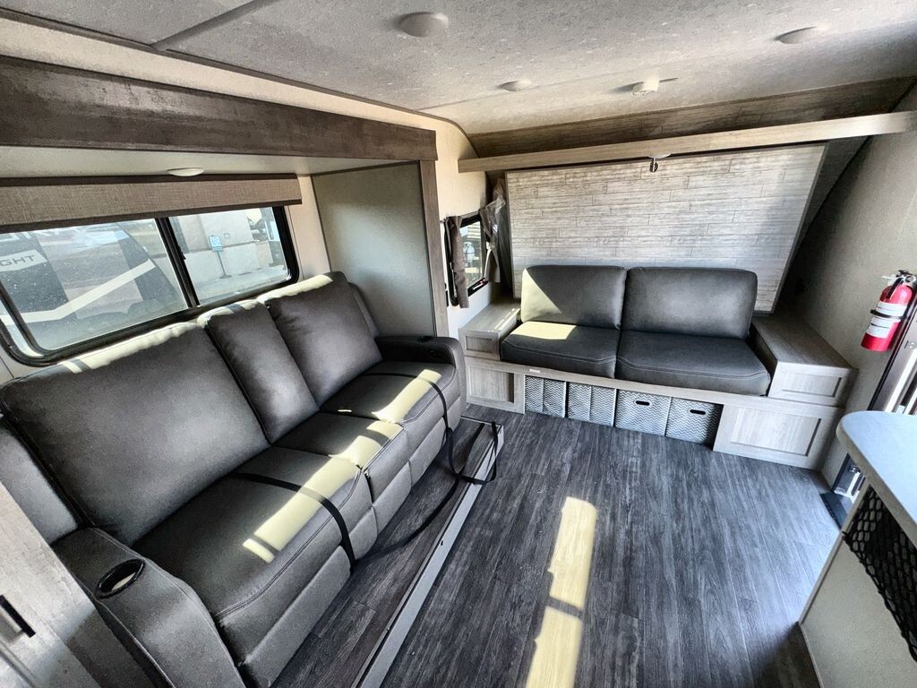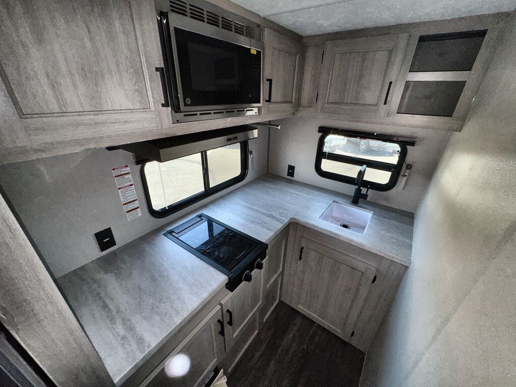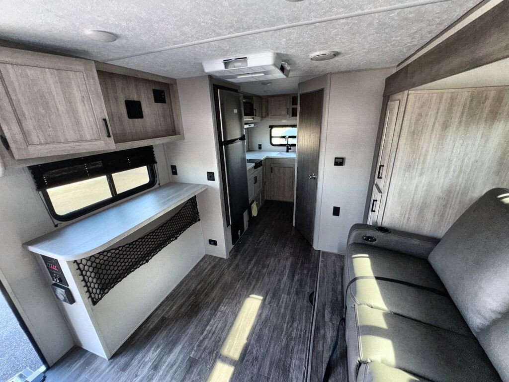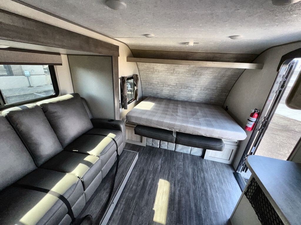 The 2025 Forest River Aurora Light 18RBS is a travel trailer designed for comfort and convenience. Measuring 23 feet 6 inches in length and weighing approximately 4,605 pounds, the 18RBS is easy to tow with many SUVs and light trucks.Inside, the 18RBS features a thoughtfully designed layout that maximizes space and functionality. The living area includes a comfortable theater seating slide-out, providing ample room to relax after a day of exploration. A bar top with storage and two stools offers a cozy dining space, while the rear corner kitchen is equipped with a 10.7 cu. ft. 12V refrigerator, a two-burner gas range, and a microwave, making meal preparation a breeze.The sleeping area boasts a versatile Murphy bed, allowing you to transform the space from a bedroom to a living area effortlessly. Dual nightstands and overhead cabinets provide convenient storage for personal items. The full bathroom includes a shower, sink, and toilet,