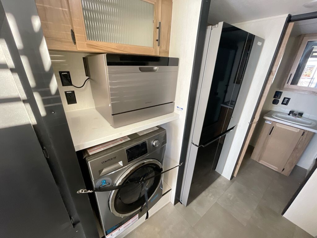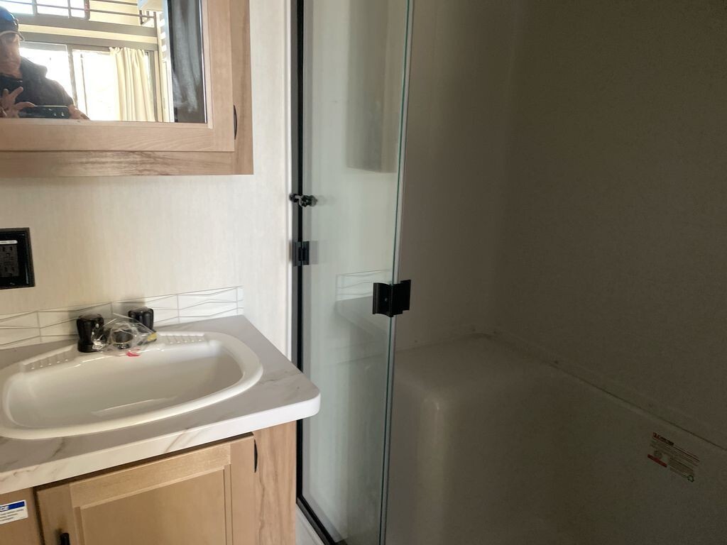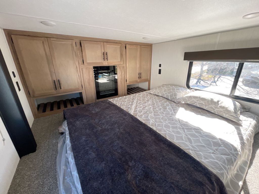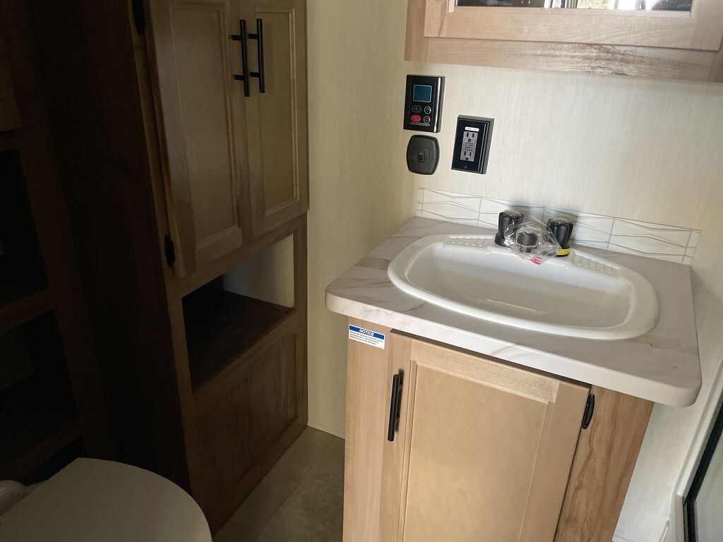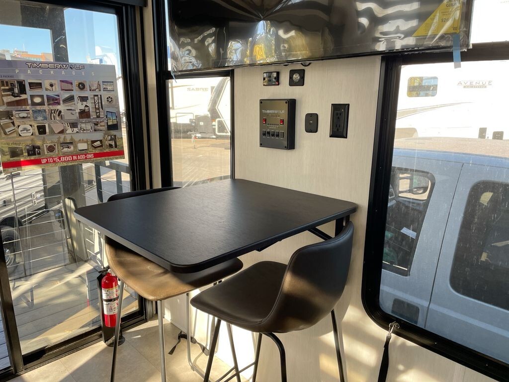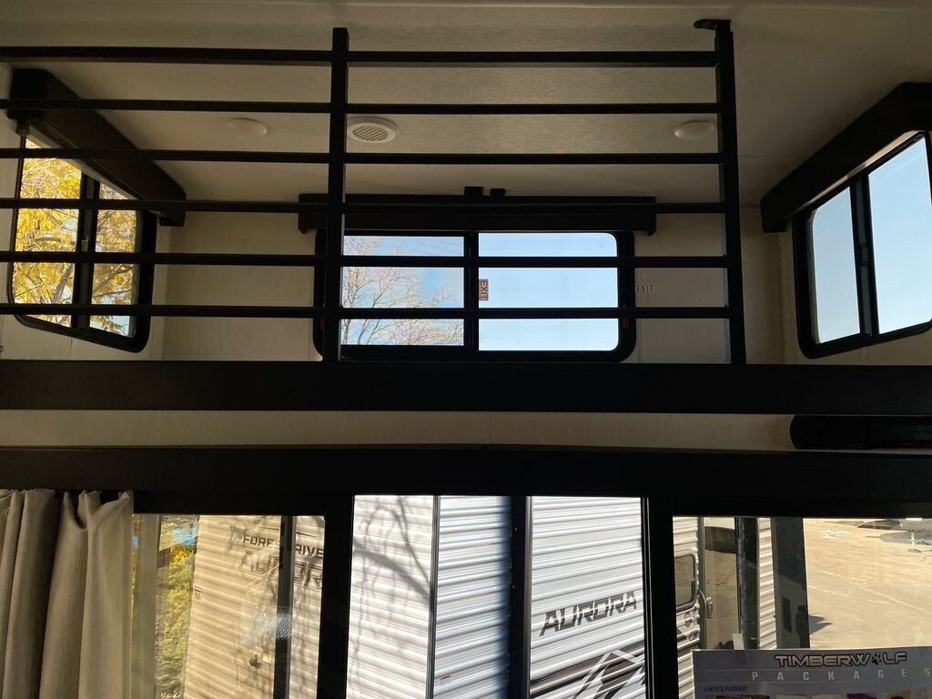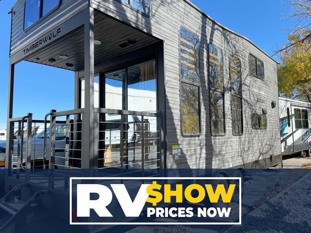 The 2025 Forest River Cherokee Timberwolf 16ML is a destination trailer designed for comfort and extended stays. Its mini-loft layout offers extra sleeping or storage space while maintaining an open main living area. The exterior features sleek lines and durable construction, enhancing towing efficiency and stability. Inside, the thoughtfully designed floor plan includes a hide-a-bed sofa, high-top dining table, and lounge chair, all set against stylish décor. The loft area, accessible via steps, features a queen bed, cabinets, and a fireplace, creating a warm retreat. The fully-equipped kitchen boasts an upgraded appliance package, including a cooktop, microwave oven, and spacious refrigerator. The residential farm-style black stainless steel sink and countertops add elegance, while ample storage keeps essentials within reach. The bathroom features an extra-large shower with a full surround and seat, a vanity, and a