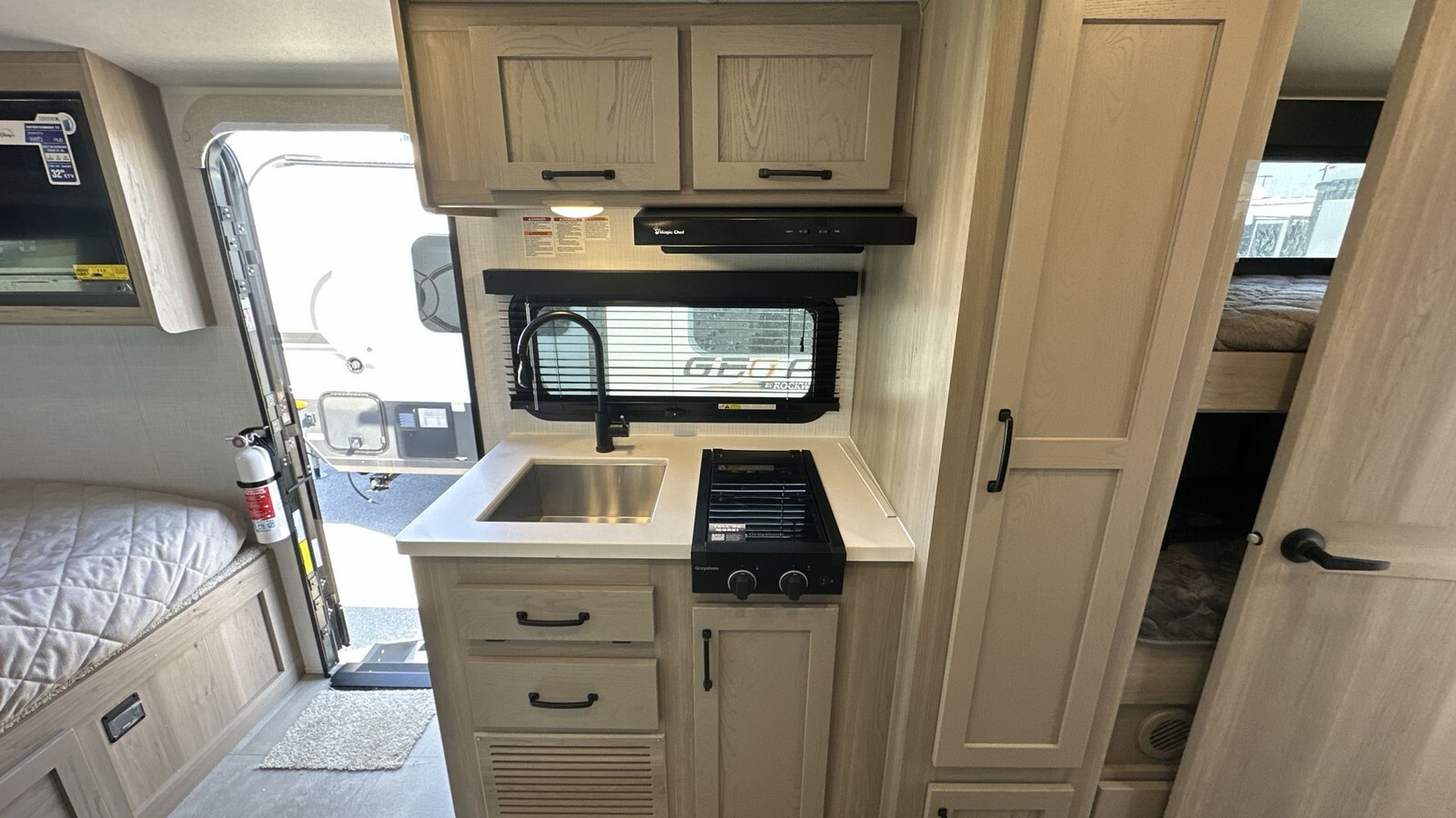 Inside, the 20BH offers a well-designed living space that maximizes comfort and functionality. The main sleeping area features a cozy queen-sized bed, providing a restful retreat after a day of exploration. Additionally, the bunk beds are perfect for accommodating children or guests, ensuring ample sleeping arrangements for the whole family. The dinette area can also convert into an extra sleeping space, adding to the trailer's versatility.