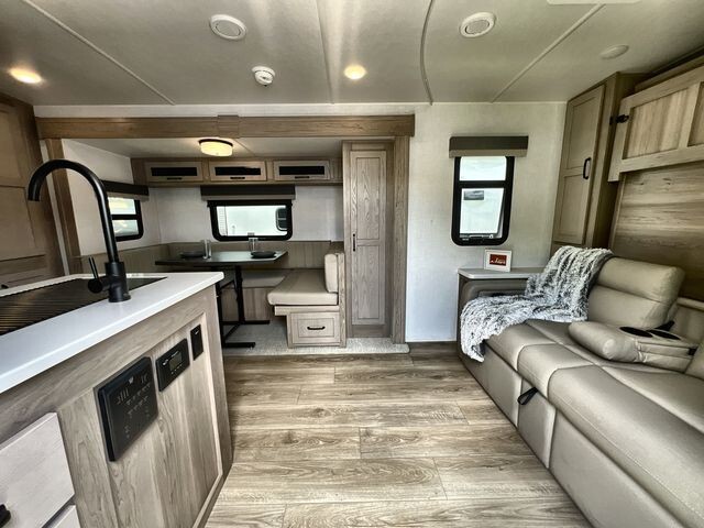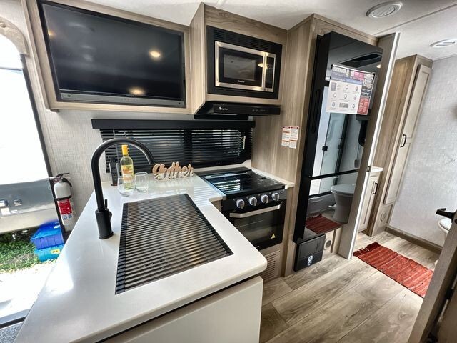 Inside, the 2214S features a well-appointed living area with a U-shaped dinette that provides ample seating for meals and relaxation. The dinette can also convert into an additional sleeping space, accommodating up to four people comfortably. The kitchen is equipped with a three-burner high-output gas range with a flush mount glass top cover, a microwave oven, and a 12V refrigerator, ensuring you have all the essentials for meal preparation on the road. Solid surface kitchen countertops and an under-mount single bowl kitchen sink with a