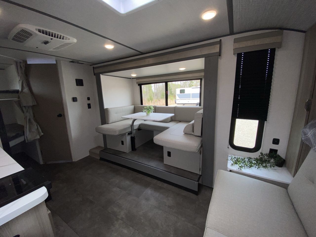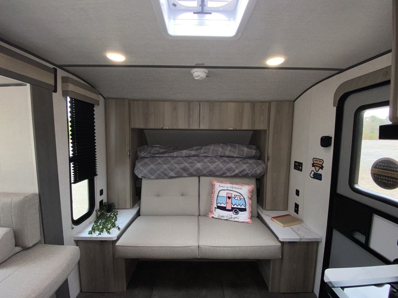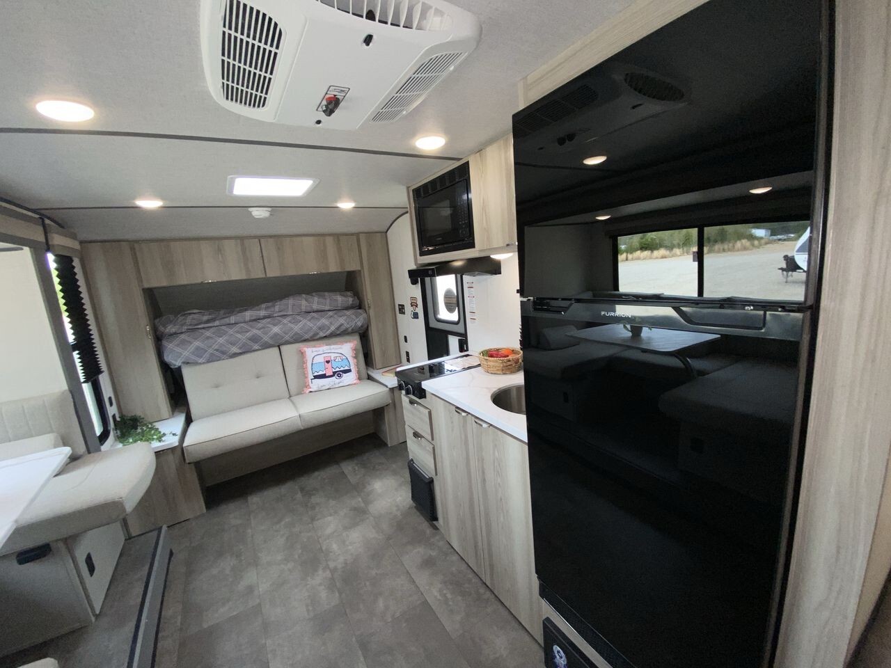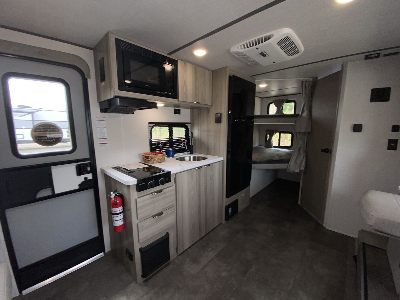 The 2025 Forest River Wildwood FSX 178BHSK is a versatile travel trailer designed to enhance your camping adventures. Measuring 22 feet 11 inches in length, this model offers a perfect balance of compactness and spaciousness, making it easy to tow and maneuver. Inside, the 178BHSK comfortably sleeps up to eight people. The front features a queen Murphy bed that transforms into a seating area during the day, optimizing living space. At the rear, double-over-double bunk beds provide ample sleeping arrangements for family or guests. The U-shaped dinette, located within the slide-out, offers a cozy spot for meals and can convert into additional sleeping space if needed. The kitchen is equipped with modern appliances, including a two-burner cooktop with a glass cover, microwave, and a large 11 cubic foot frost-free refrigerator. Seamless countertops and a residential high-rise kitchen faucet add to the kitchen's functionality and