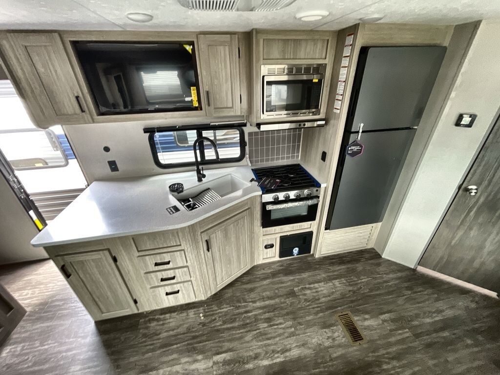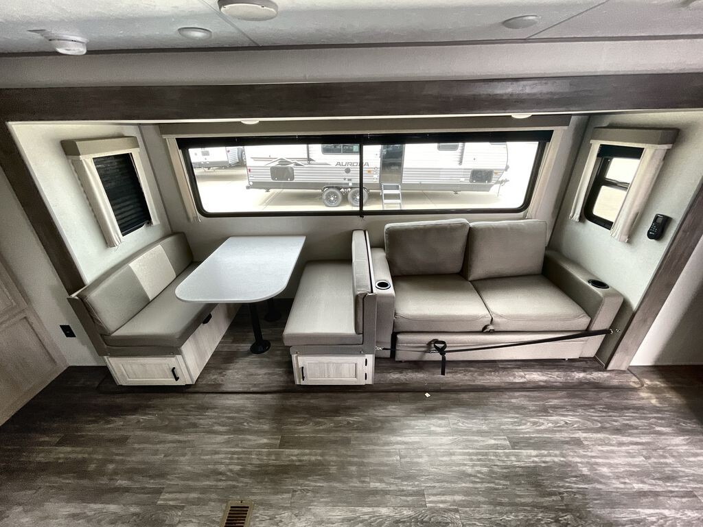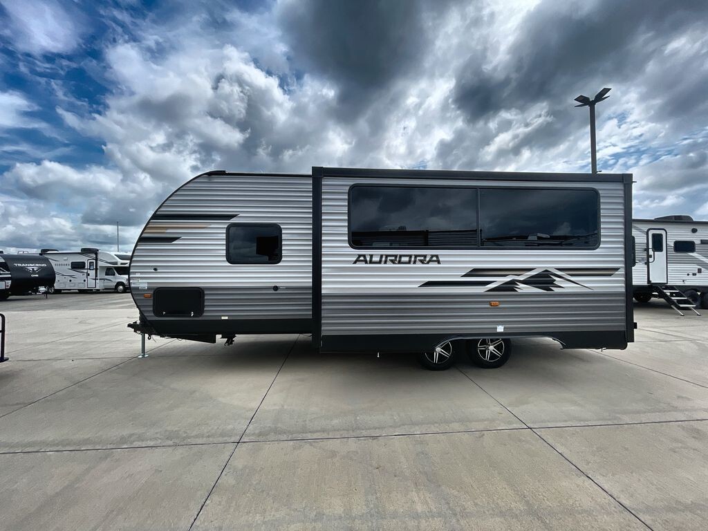 The Forest River Aurora 24RBS is a great choice for travelers seeking comfort and convenience on the road. This travel trailer is designed with quality construction and thoughtful features to enhance your camping experience.Measuring approximately 28 feet in length, the 24RBS offers a spacious interior layout. The aerodynamic exterior design not only looks appealing but also contributes to better fuel efficiency. The durable fiberglass exterior is easy to maintain and built to withstand various weather conditions.Inside, the 24RBS features an open floor plan that maximizes space and functionality. Large windows allow natural light to fill the living area, creating a welcoming atmosphere. The living room includes a comfortable sofa and a booth dinette, both of which can be converted into additional sleeping areas if needed. An entertainment center with a flat-screen TV and built-in sound system provides entertainment options
