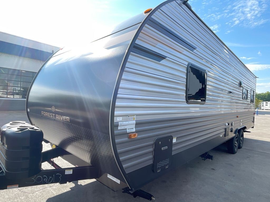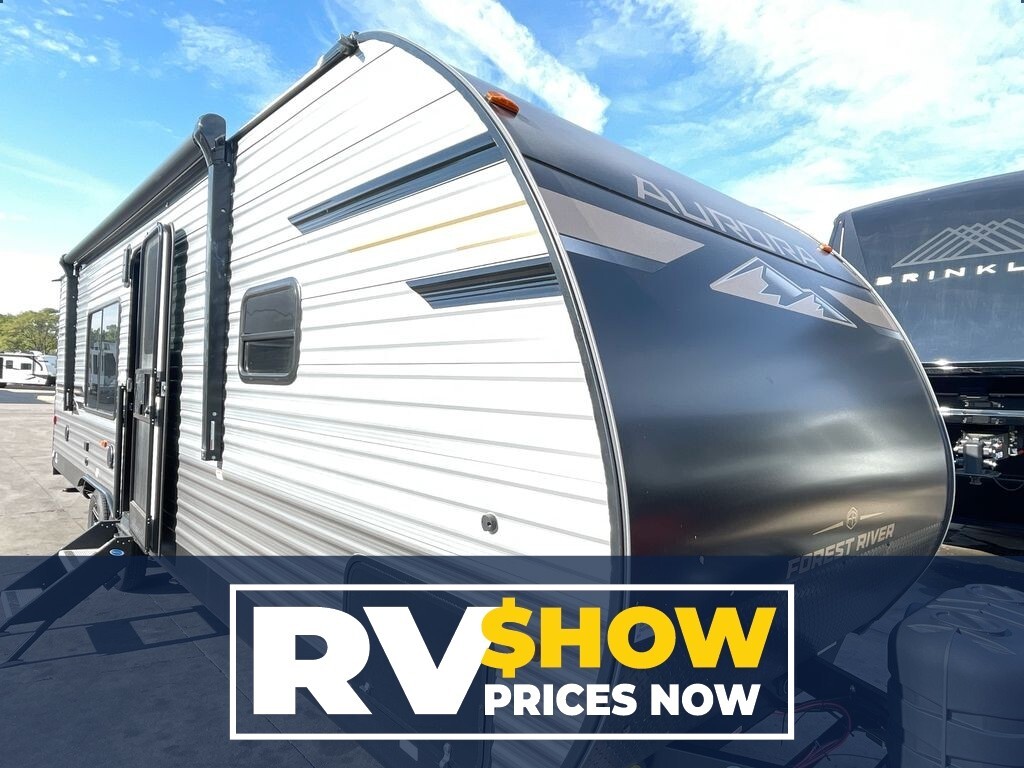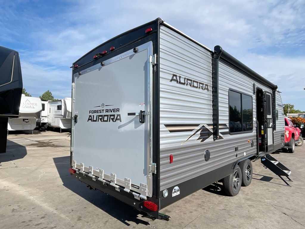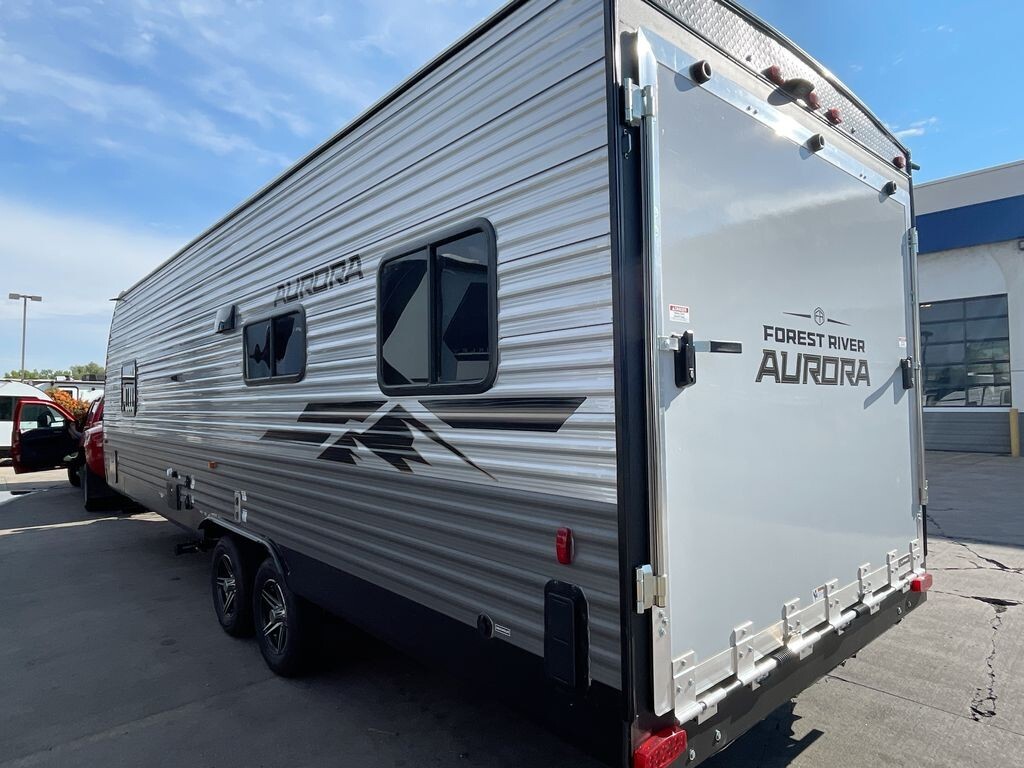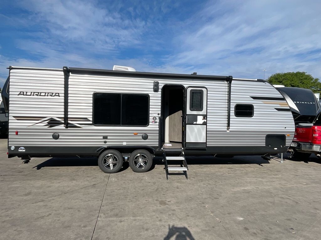 The Forest River Aurora 26ATH is a versatile toy hauler travel trailer designed to enhance your adventures with comfort and functionality. Measuring 30 feet in length and 8 feet in width, it offers ample space for both living and transporting your favorite outdoor gear.Built on a sturdy chassis, the Aurora 26ATH ensures stability and durability on the road. Its sleek, aerodynamic design not only improves fuel efficiency but also adds to its visual appeal. The exterior features a high-gloss gel coat fiberglass finish that maintains a modern look. A 15-foot power awning with LED lighting and outdoor speakers creates an inviting outdoor space for relaxation and entertainment.Inside, the Aurora 26ATH boasts a spacious, open floor plan that maximizes living space. The living area includes two fold-down sofas that provide comfortable seating and can convert into additional sleeping areas. The kitchen is well-equipped with a