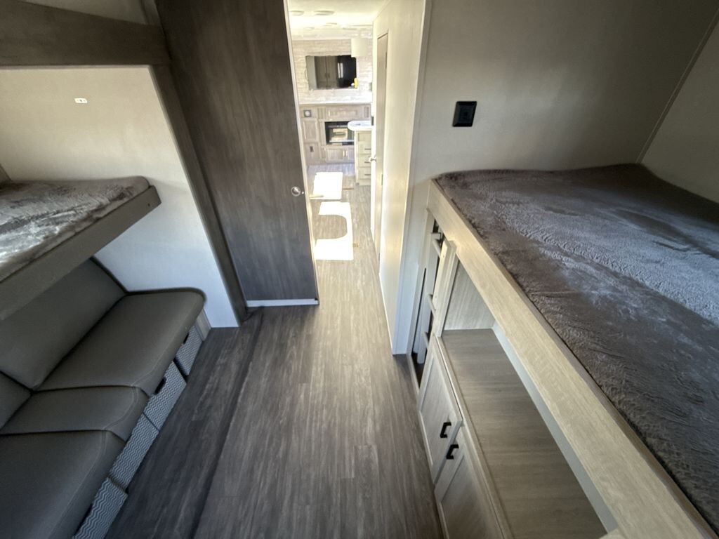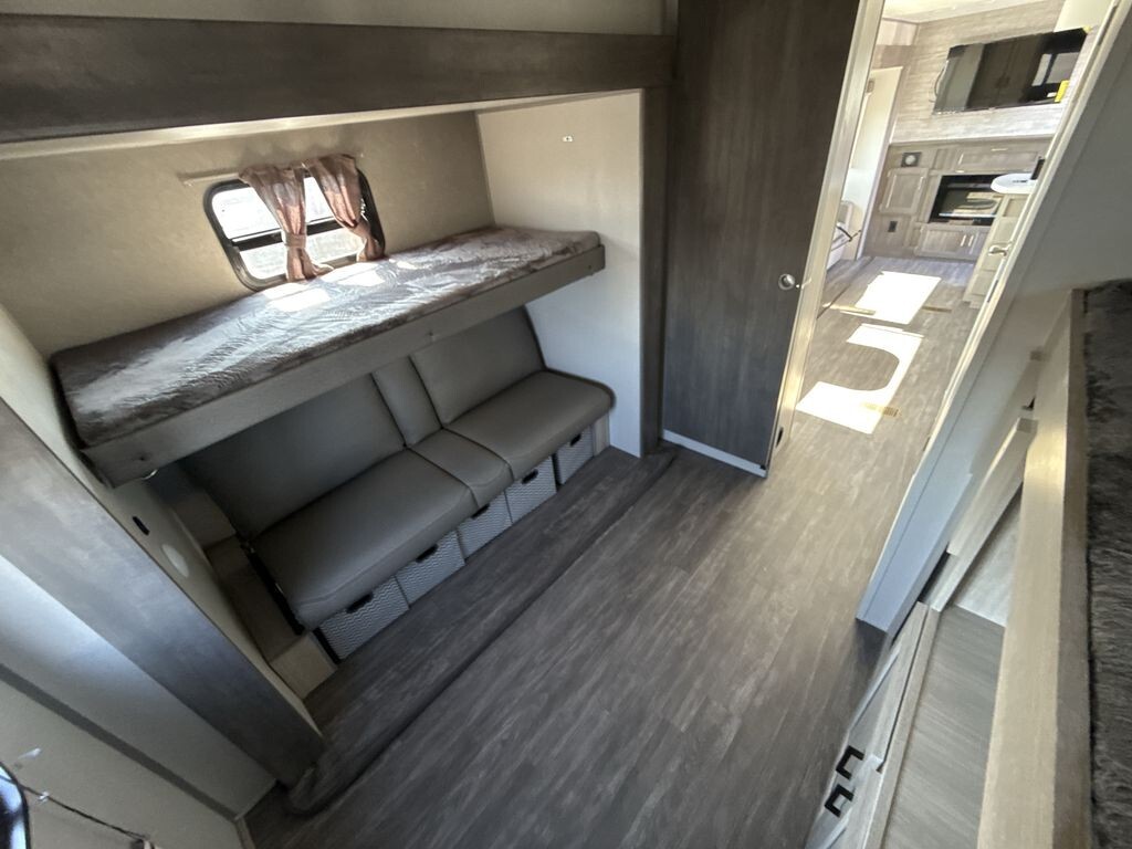The Forest River Aurora 34BHTS is a spacious and family-friendly travel trailer designed to enhance your camping adventures. With a length of 38 feet and a width of 8 feet, it offers ample room for relaxation and entertainment. The 34BHTS features a dedicated bunkhouse, providing separate sleeping quarters ideal for families with children or groups needing extra space. The open-plan living area includes three slide-outs, creating an expansive and inviting environment. The entertainment area is equipped with a comfortable sofa and a dinette, perfect for gatherings. The kitchen comes fully equipped with modern appliances, including a full-size refrigerator, microwave, and a three-burner stove, making meal preparation convenient. The interior design incorporates warm tones and high-quality materials, creating a cozy atmosphere. Large windows allow natural light to fill the space, enhancing the airy feel and providing scenic