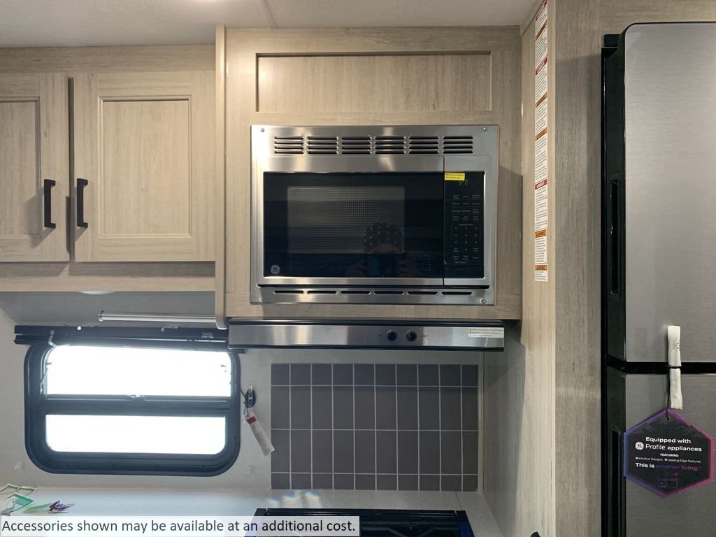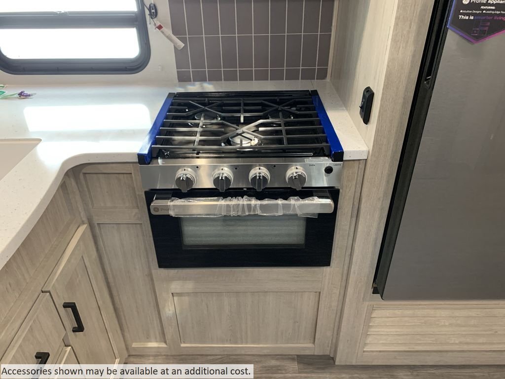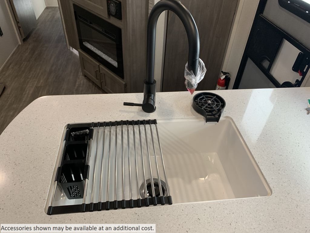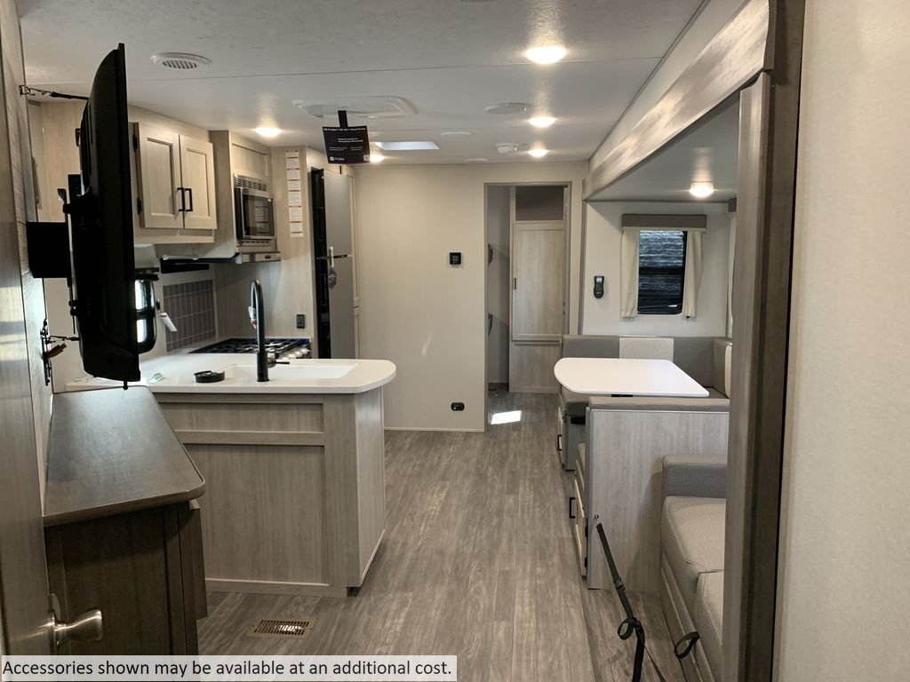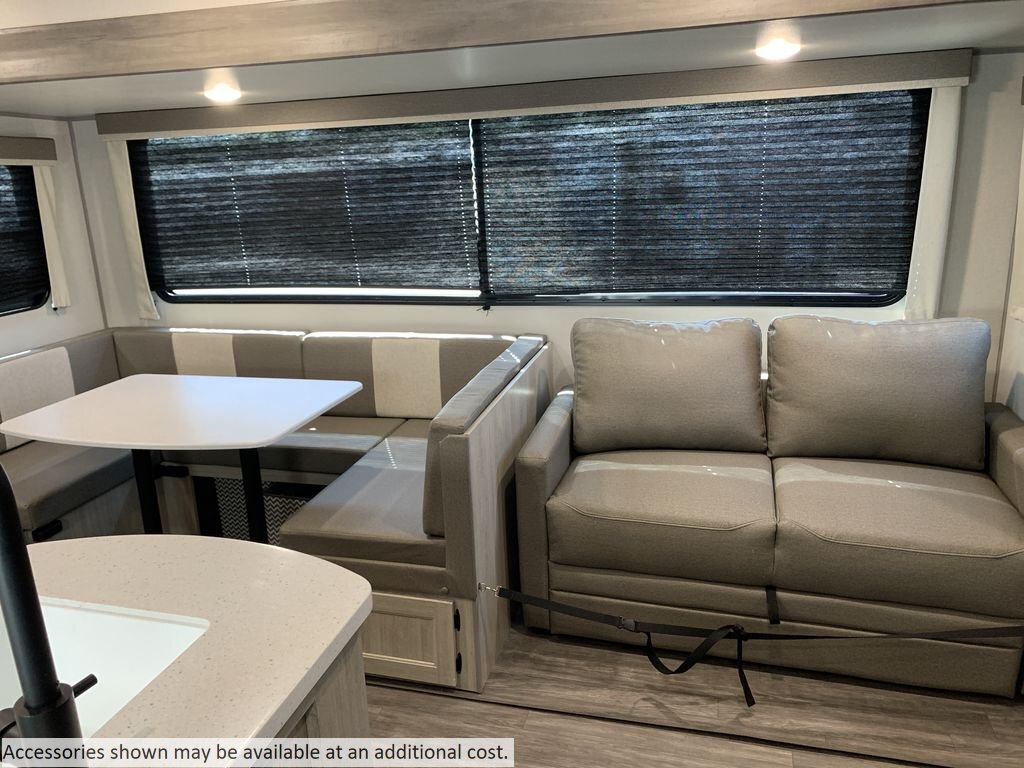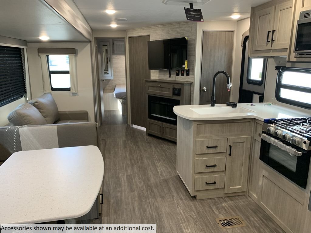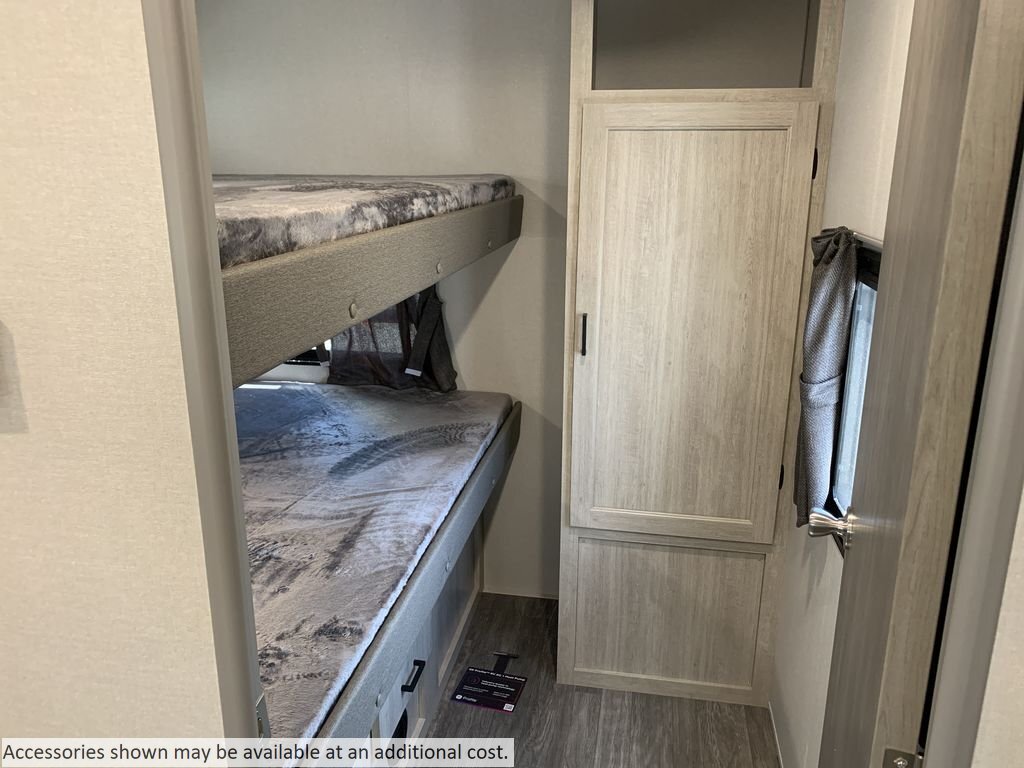 The rear private bunkhouse in this travel trailer is perfect for the kids or guests! It has a set of queenbunk bedswith storage totes underneath and a linen closet. The dual entry bathroom is convenient for all to access it and has a 34" x 34" radius shower with a skylight above for natural lighting as you get ready. The chef can prepare their best meals with the three burner cooktop and everyone can enjoy them at the U-shaped dinette. The sofa is across from the entertainment center with an optional fireplace to add for extra comfort. The front private bedroom has a 60" x 74"queen bed to lay your head on at night and wardrobes on either side of it to keep your clothes out of the way and looking their best, plus an entrance into the dual entry bathroom!