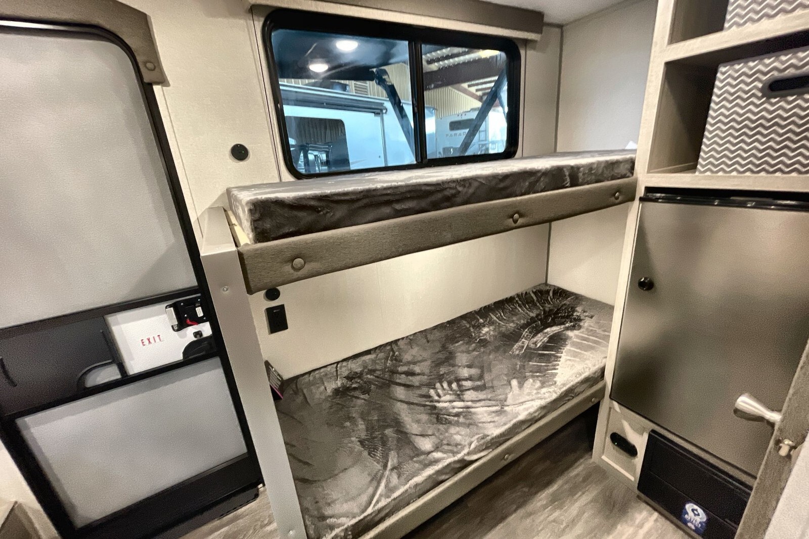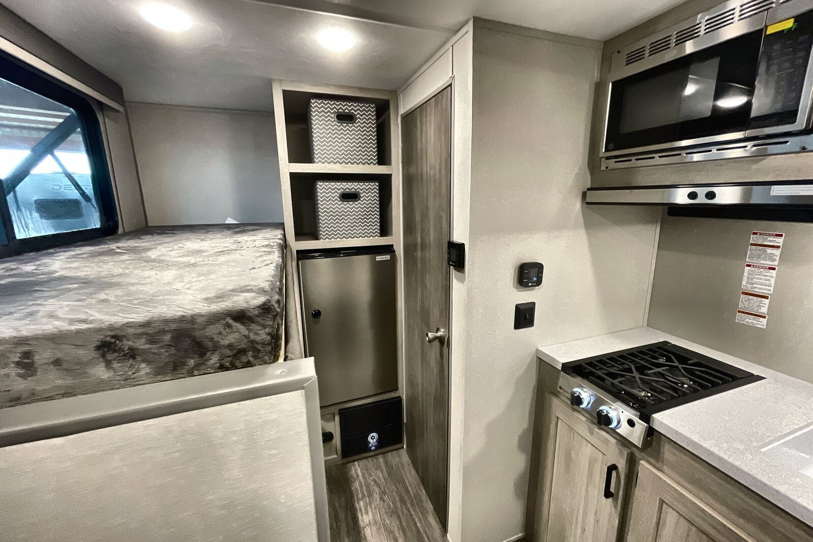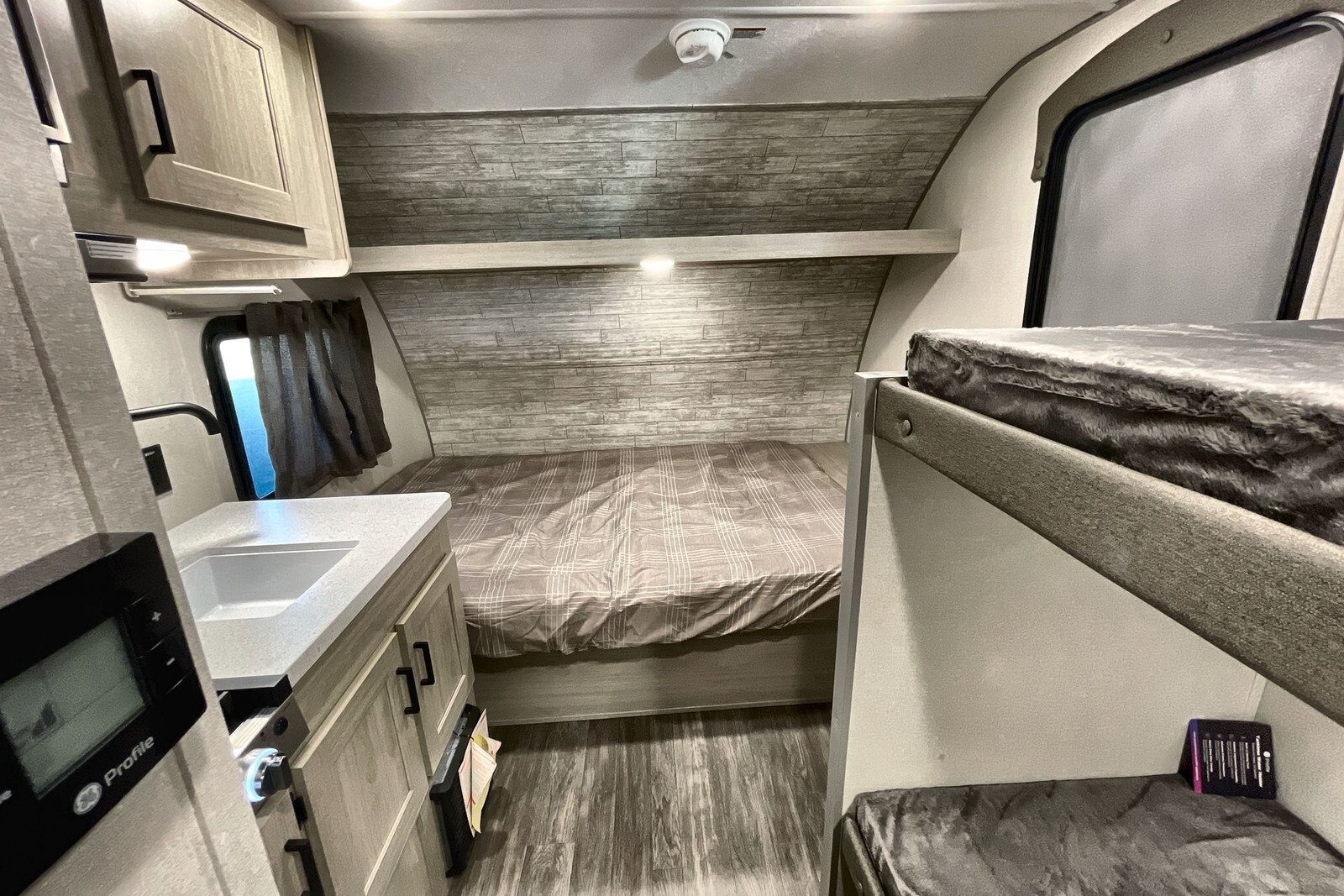 Inside, the 13BHX maximizes space with a thoughtful layout. The front features a comfortable 54" x 74" queen bed, providing a restful night's sleep. For additional sleeping
