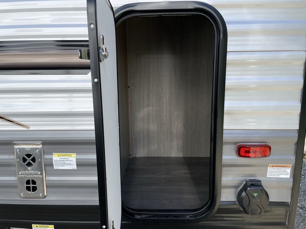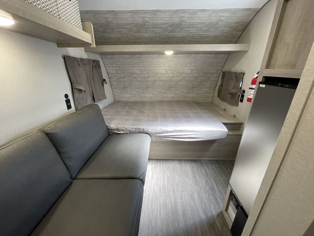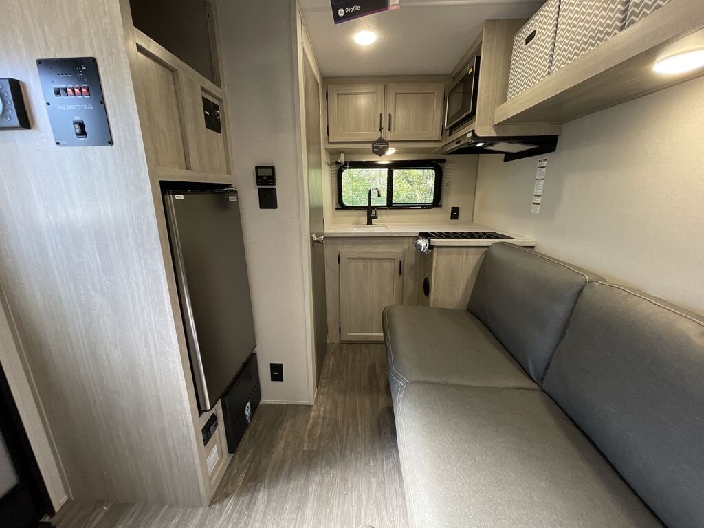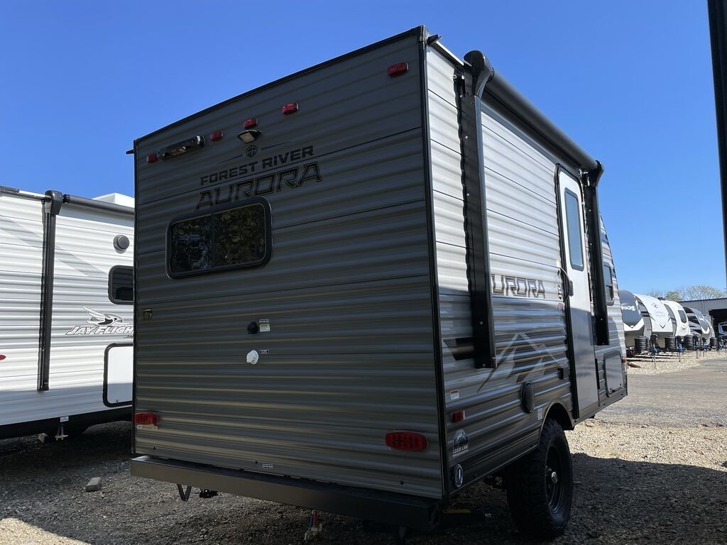 The 2025 Forest River Aurora Light 13RKX is a compact and lightweight travel trailer designed for easy towing and maneuverability, making it an excellent choice for both weekend getaways and extended trips. Measuring 16 feet in length and 7.5 feet in width, this RV offers a comfortable living space without compromising on essential features.The exterior of the 13RKX features a sleek, aerodynamic design with a durable aluminum structure and stylish decals that enhance both aesthetics and fuel efficiency. Its single-axle design and nitrogen-filled radial tires ensure smooth handling on the road. An electric awning with multicolor lights and remote control adds a touch of luxury to your outdoor experience.Inside, the 13RKX offers a thoughtfully designed living space that maximizes every inch. The front features a comfortable 54" x 74" queen bed, providing a restful night's sleep. Adjacent to the bed is a 60" jackknife sofa, which can