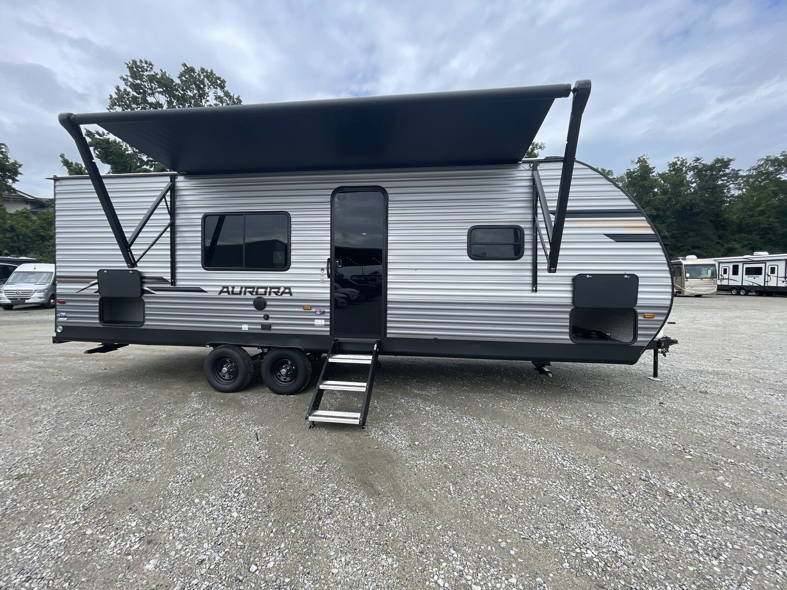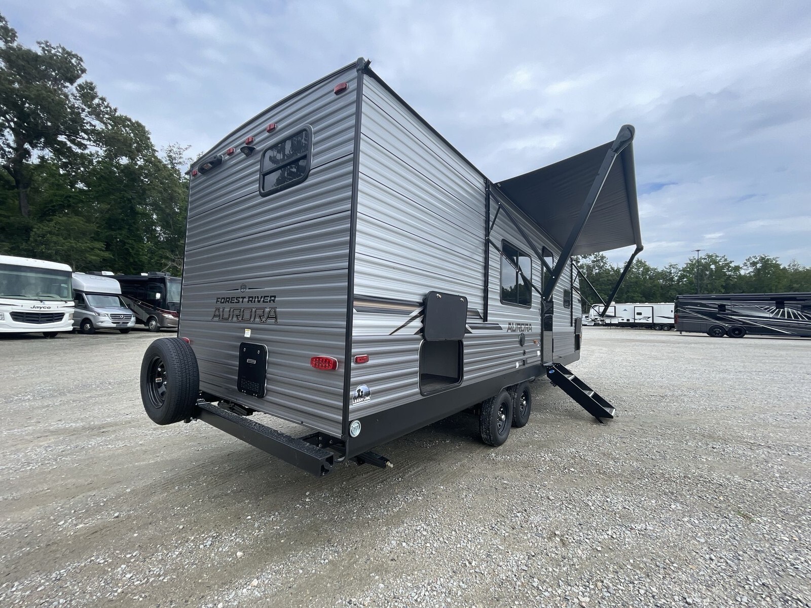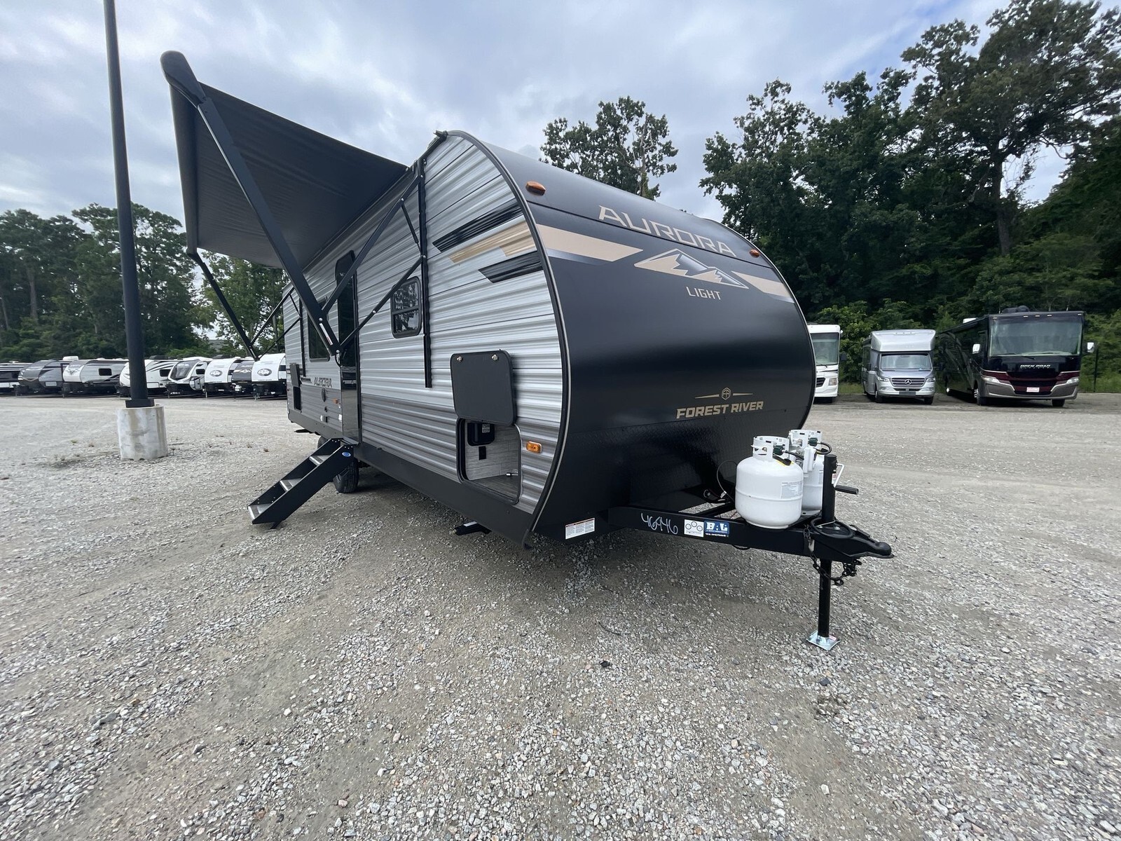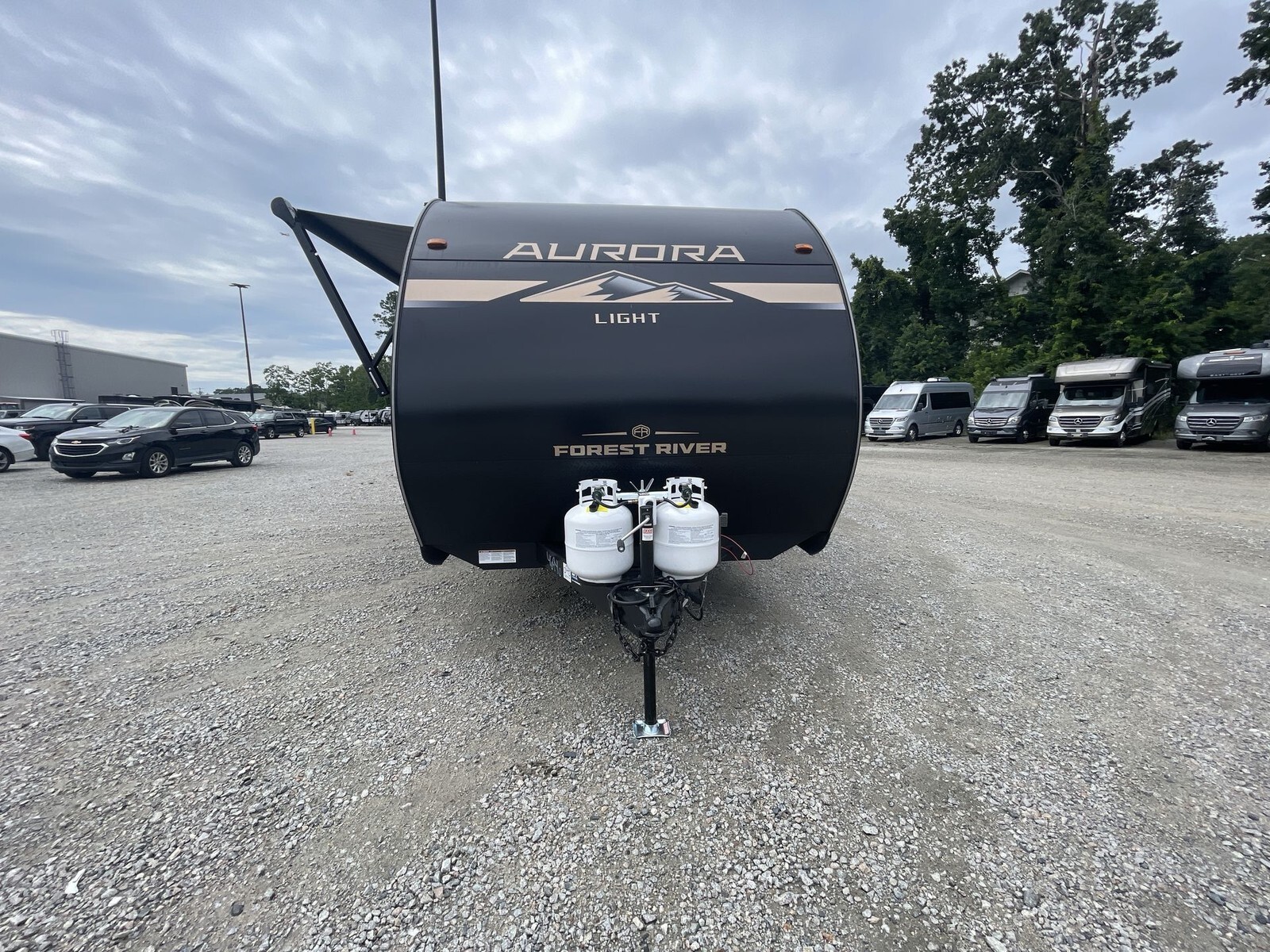 The Forest River Aurora Light 26BH is a travel trailer designed for families and adventure seekers, offering a comfortable and practical option for road trips and camping excursions. Measuring 29.25 feet in length and 8 feet in width, this model is easy to tow while providing ample space for up to 10 occupants.Inside, the 26BH features a thoughtfully designed floor plan that includes double-sized bunk beds at the rear, perfect for children or guests. The front semi-private bedroom offers a cozy queen-size bed with storage underneath, providing a restful retreat after a day of adventure. The main living area includes a sofa with armrests and cupholders that can be converted into a sleeping area, and a booth dinette that also converts into a bed, accommodating larger groups comfortably.The kitchen is well-equipped with a three-burner cooktop, microwave oven, and a 12V 10.7 cu. ft. refrigerator, making meal preparation convenient