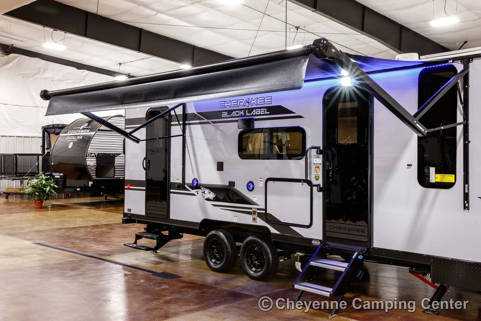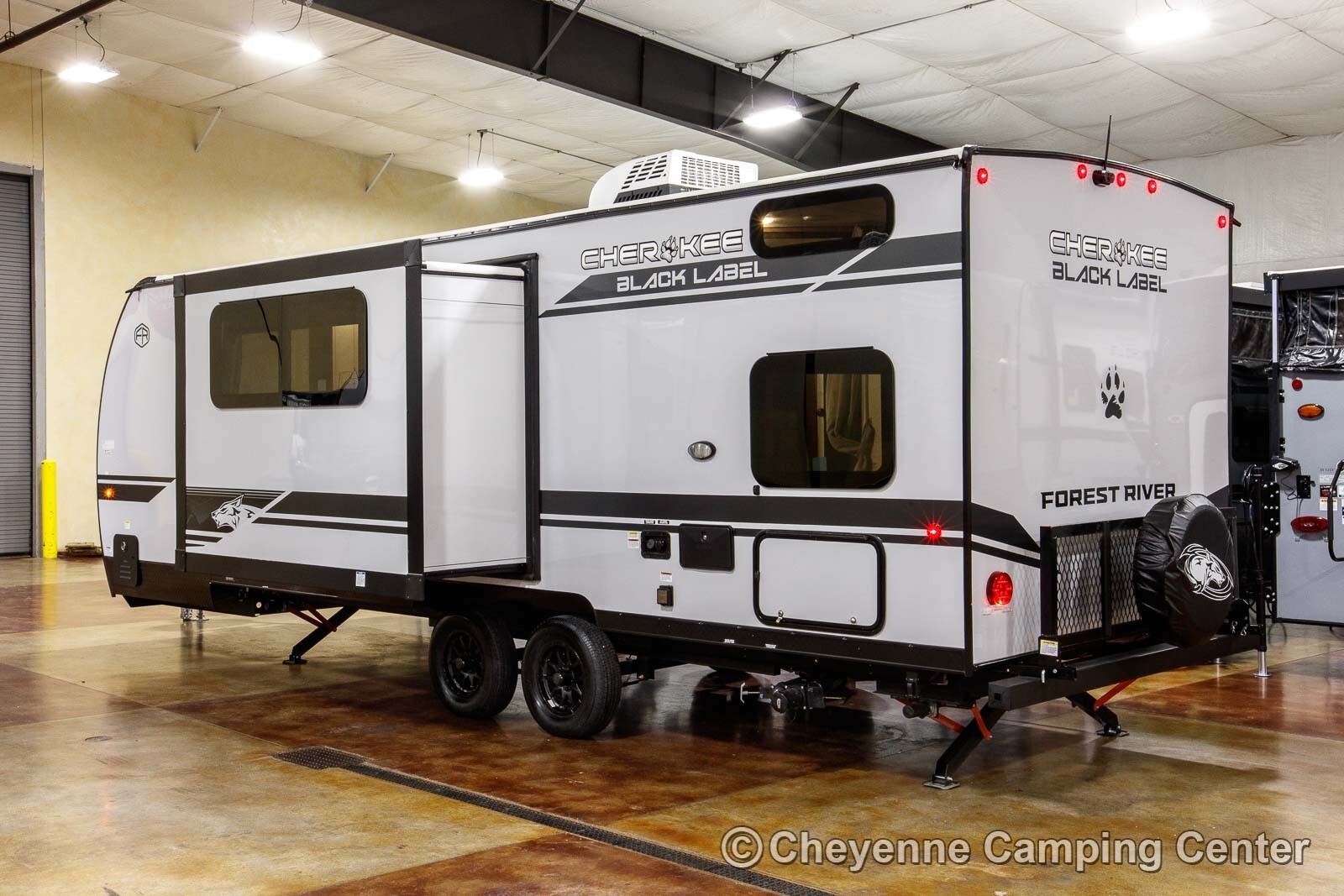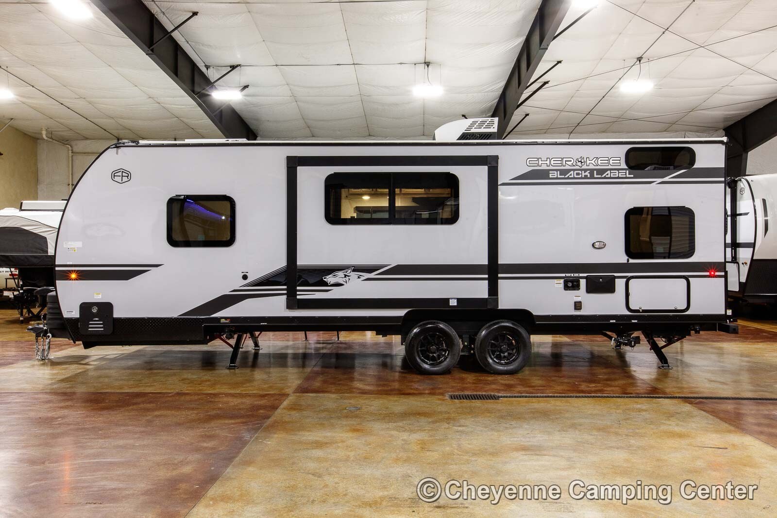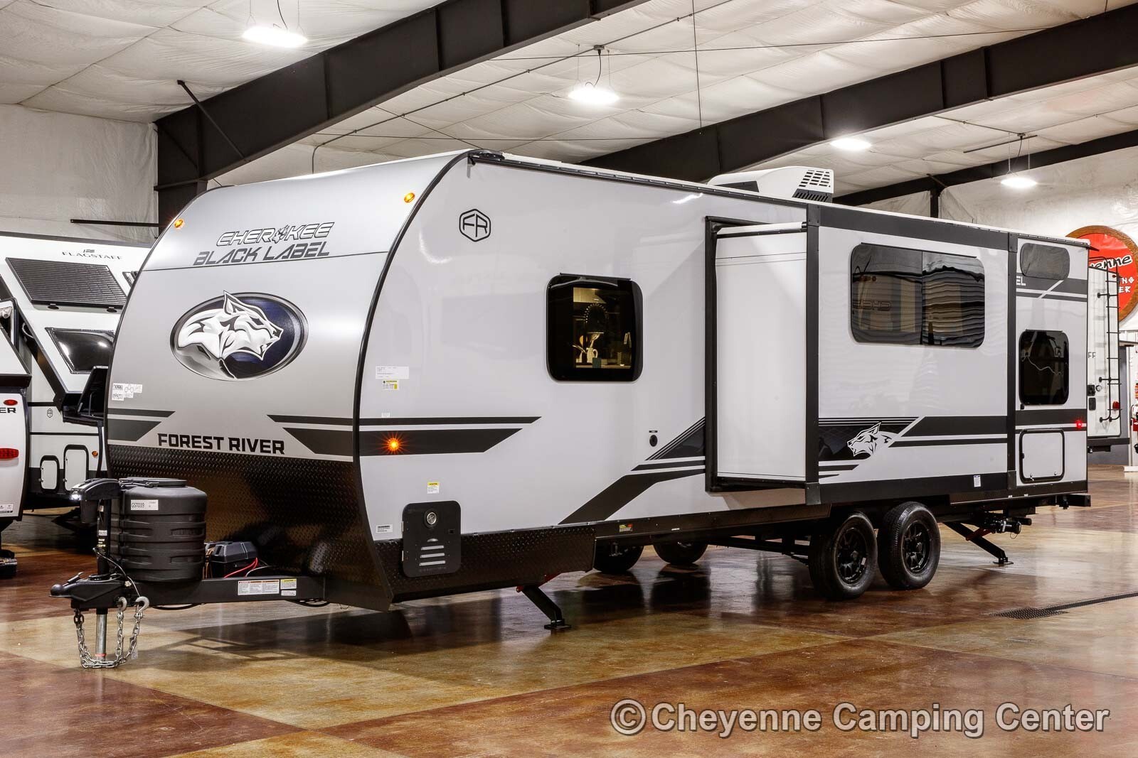 Other features include designer window shades, seamless countertops, battery disconnect, filled LP tanks, a 12V deep cycle battery, large “U” dinette, one year complimentary roadside assistance, one year manufacturer warranty, and much more! The Forest River Cherokee Grey Wolf Black Label 23DBHBL for sale at Cheyenne Camping Center is the ideal mid-sized family camper, combining style, comfort, and practicality for unforgettable adventures.