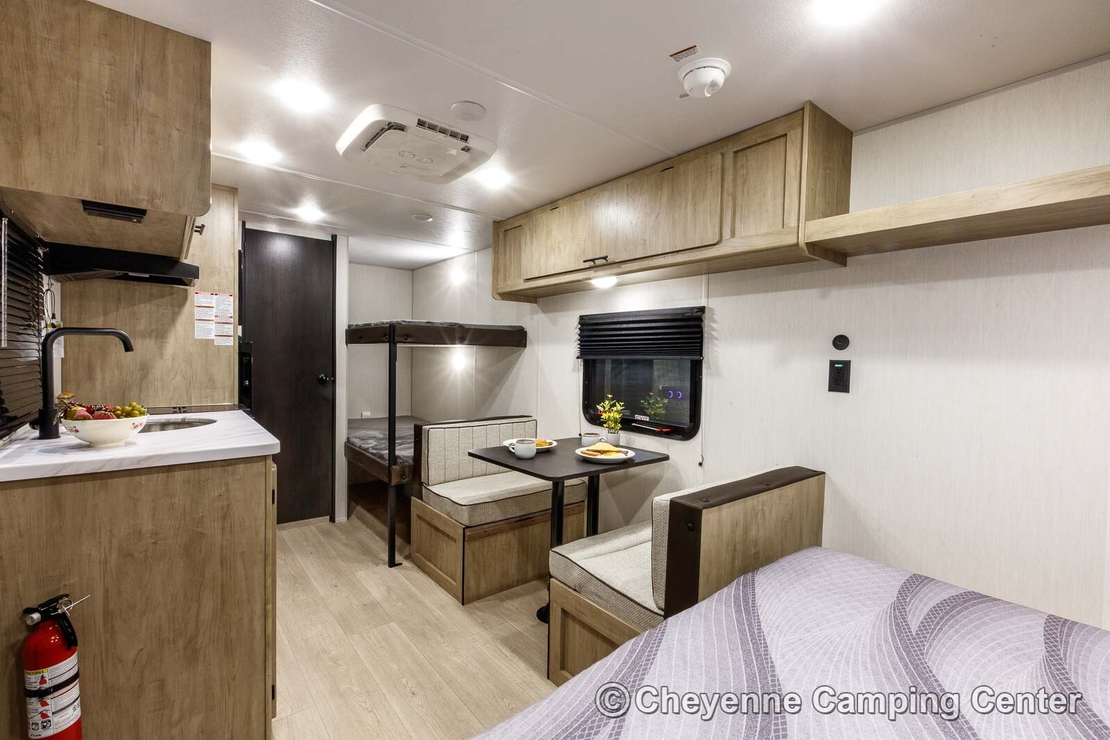 Inside, the well-planned layout features a front queen bed, rear bunk beds, and a convertible dinette, providing comfortable sleeping space for the whole family. Ample storage is available throughout, including cabinets and easy-access compartments under the bed and bunks, perfect for organizing camping gear in storage tubs. The kitchen comes fully equipped with a 12V refrigerator, microwave, cooktop, a round stainless sink, and a residential-style faucet. The bathroom includes a shower and toilet for the privacy and convenience of home on the road.