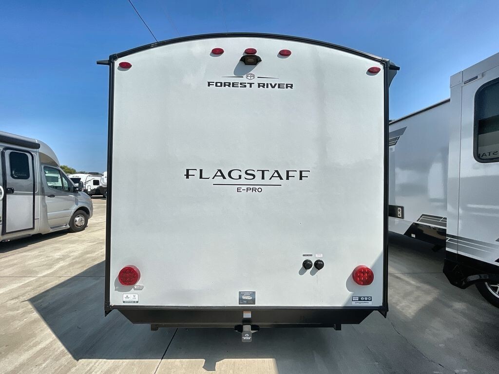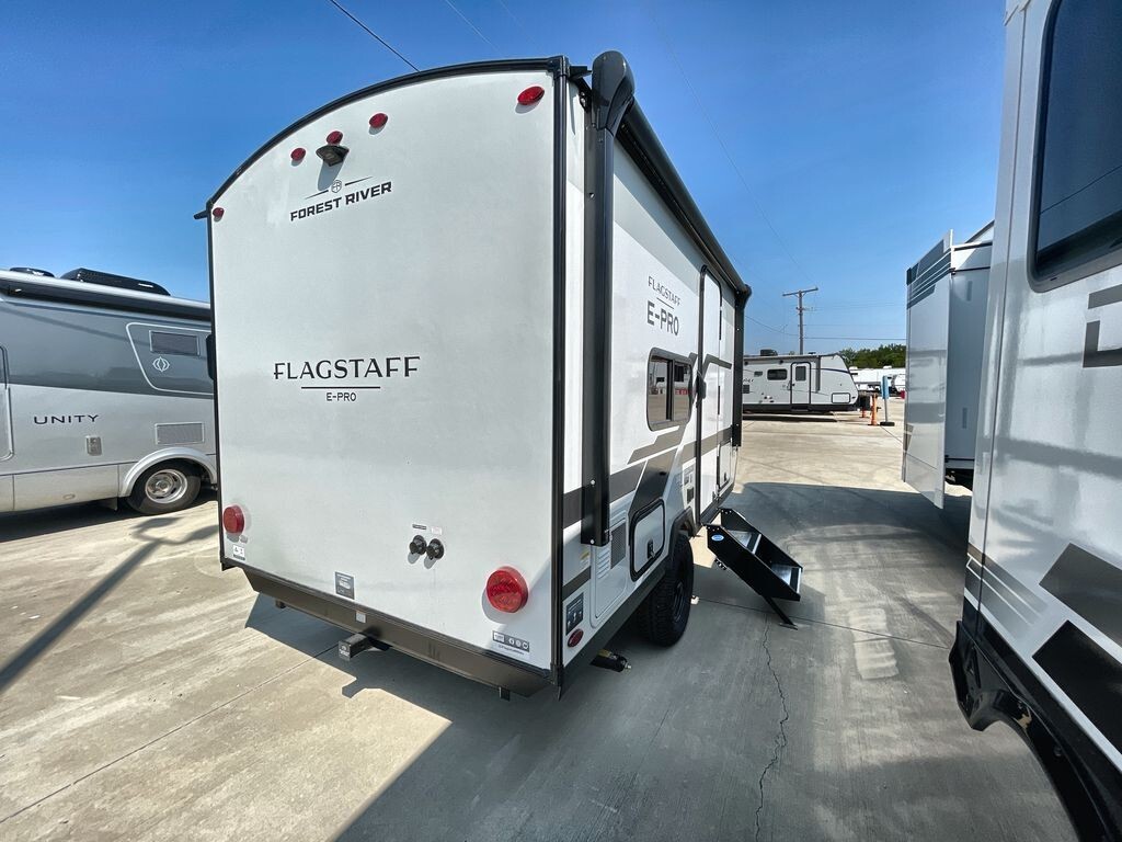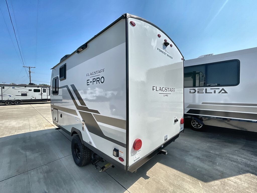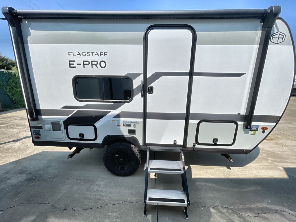Flagstaff E-Pro Travel TrailersYOUR IDEAL FLOOR PLAN, PERFECTLY SIZED. Our E pro travel trailers are everything you want and need in a camping experience in a package that is easily towable. Bigger off road tires with a great standard solar package allow you to take these to places you never deemed possible. For select models, an optional power package unlocks a realm of boundless potential, awaiting your every aspiration.