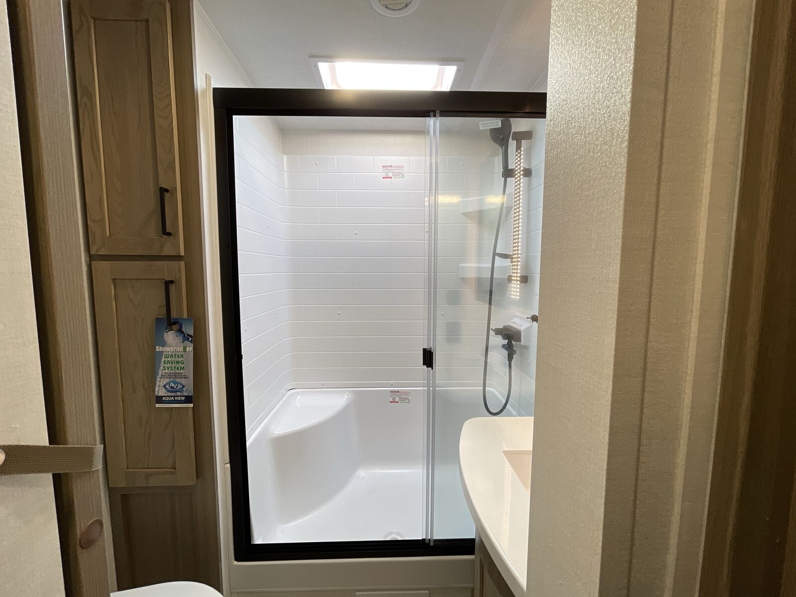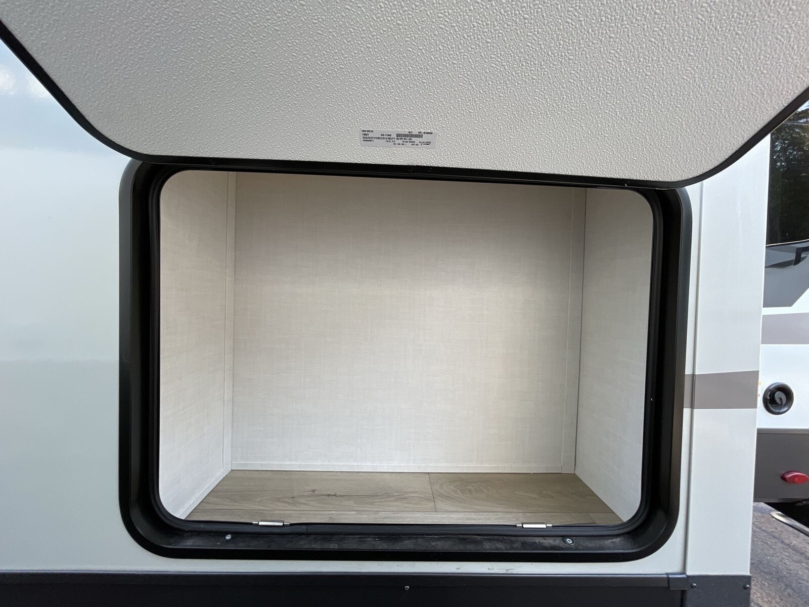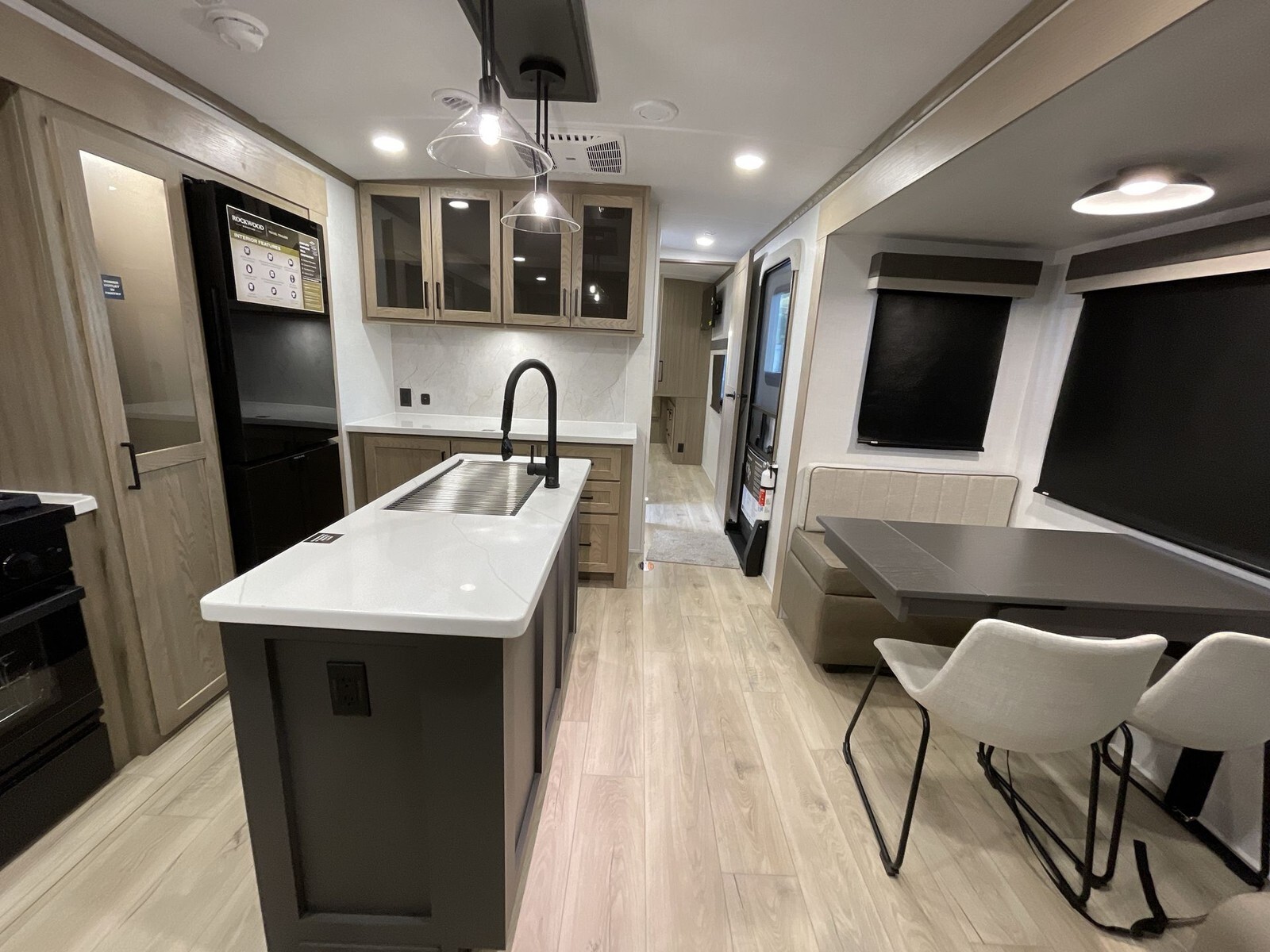 Measuring 36.67 feet in length and 8 feet in width, the 8337RL provides plenty of room for relaxation and entertainment. Its aerodynamic design enhances towing efficiency. Constructed with laminated white fiberglass sidewalls and an aluminum frame, this travel trailer is both sturdy and easy to maintain. The exterior includes two power awnings totaling 25 feet, equipped with adjustable rain dump and LED lighting, ideal for outdoor gatherings. Additional exterior features include tinted frameless windows, a rear ladder, and a 2-inch accessory hitch for