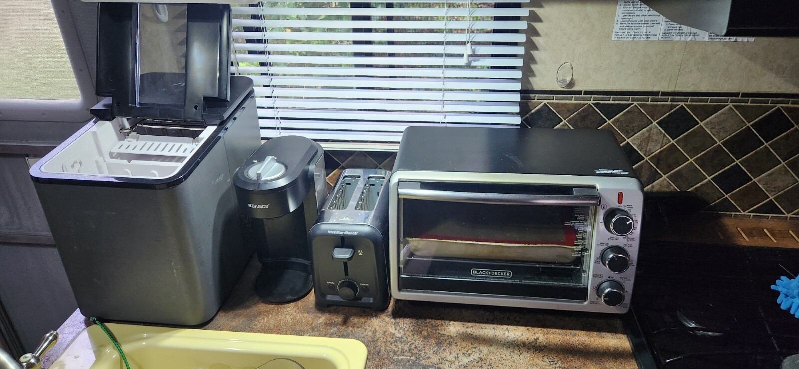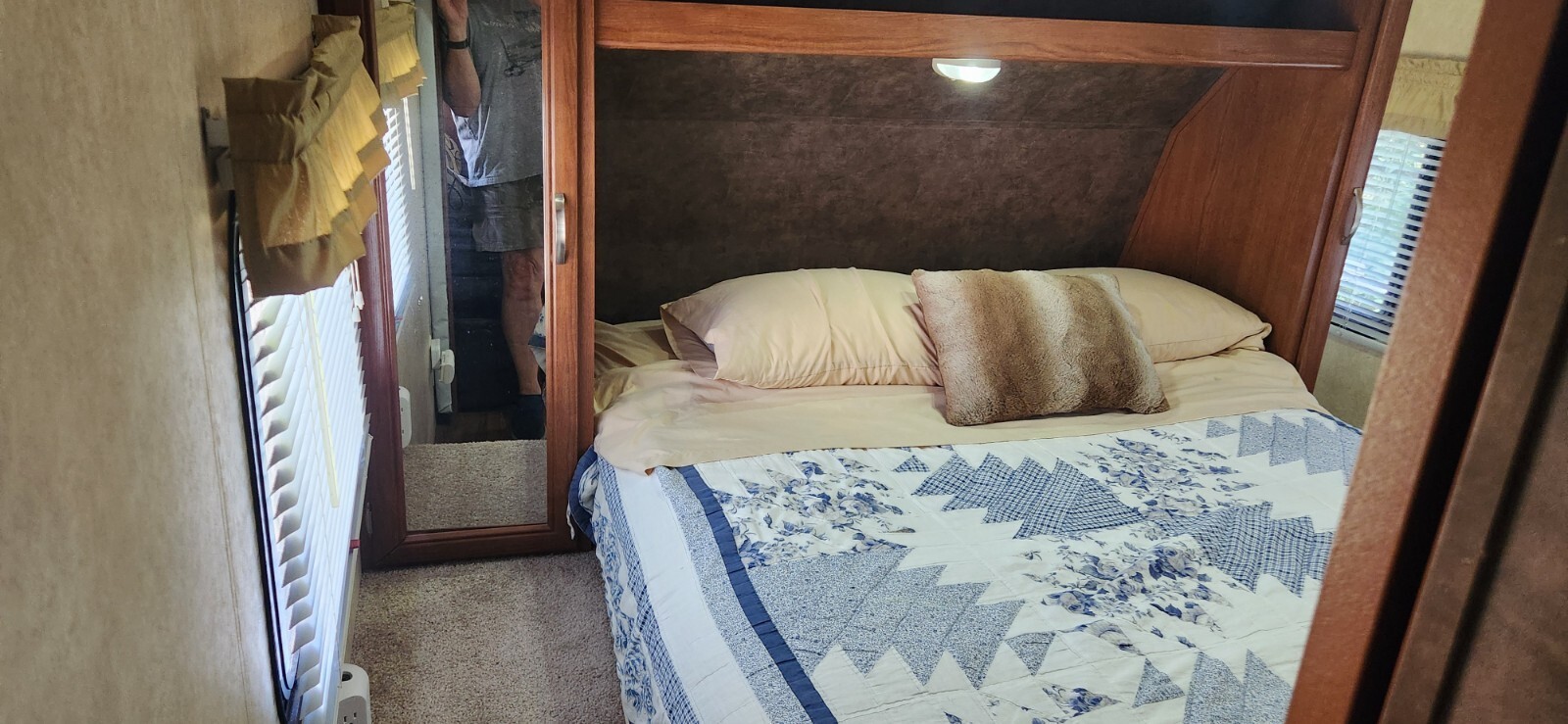 The interior includes residential-style curtains and night shades, as well as a double-bowl kitchen sink.