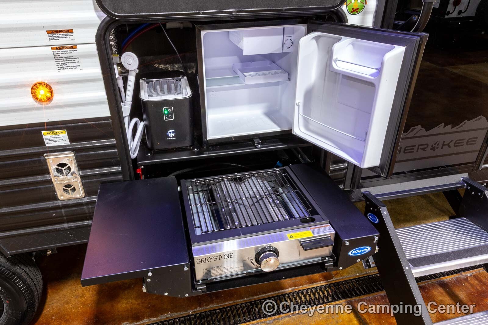 On the exterior, the Grey Wolf 26DBH is built for outdoor living. It features a convenient mini kitchen complete with a refrigerator, grill/griddle, ice maker, and water hookup. Two entry doors offer easy access, while the 15’ power awning with LED lighting creates the perfect shaded space to relax. You’ll also find a 200-watt solar panel, MorRyde premium entry steps, Leash Latch for pets, premium wheels, an exterior hot/cold shower, black tank flush, power stabilizer jacks, power tongue jack, marine-grade speakers, flip-down rear cargo rack, battery disconnect, filled LP tanks, a 12V deep cycle battery, and spacious exterior storage compartments. For extended season comfort, the 26DBH includes an LP gas furnace, enclosed holding tanks with heat pads, and a 15,000 BTU ducted air conditioner.