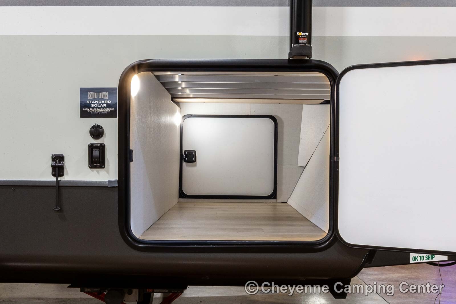 Outside you’ll have a 200-watt solar panel, portable solar prep, frameless tinted windows, aluminum wheels, Goodyear tires, tire pressure sensors with monitor, Torflex torsion axles, a 20′ power awning with LED lighting, 15K BTU ducted air conditioning, dual 30 lb. LP tanks, black tank flush fixture, outside hot/cold spray port, front pass thru storage, power stabilizer jacks, power tongue jack, roof ladder, keyed alike locks, battery disconnect and winterizing fixture.