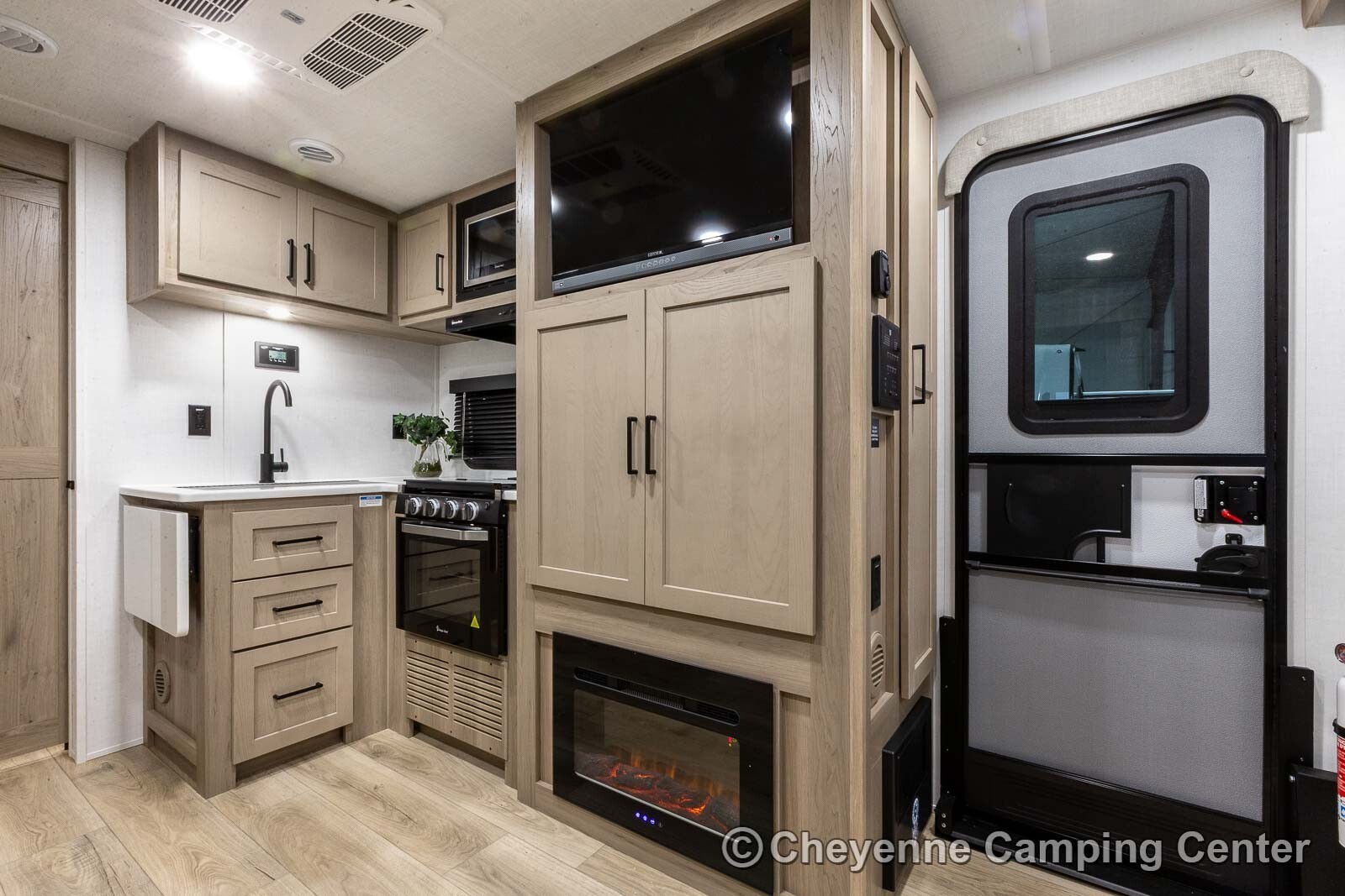 Outside you’ll have a 200-watt solar panel, portable solar prep, frameless tinted windows, aluminum wheels, Goodyear tires, a tire pressure monitoring system, Rubber-Ryde torsion axle suspension, LP quick connect and griddle prep, marine grade speakers, 19′ power awning with LED lighting, 15K BTU ducted air conditioning, dual 30 lb. LP tanks, black tank flush fixture, outside hot/cold spray port, front pass thru storage, power stabilizer jacks, power tongue jack, keyed alike locks, a roof ladder, black tank flush, battery disconnect, and winterizing fixture.