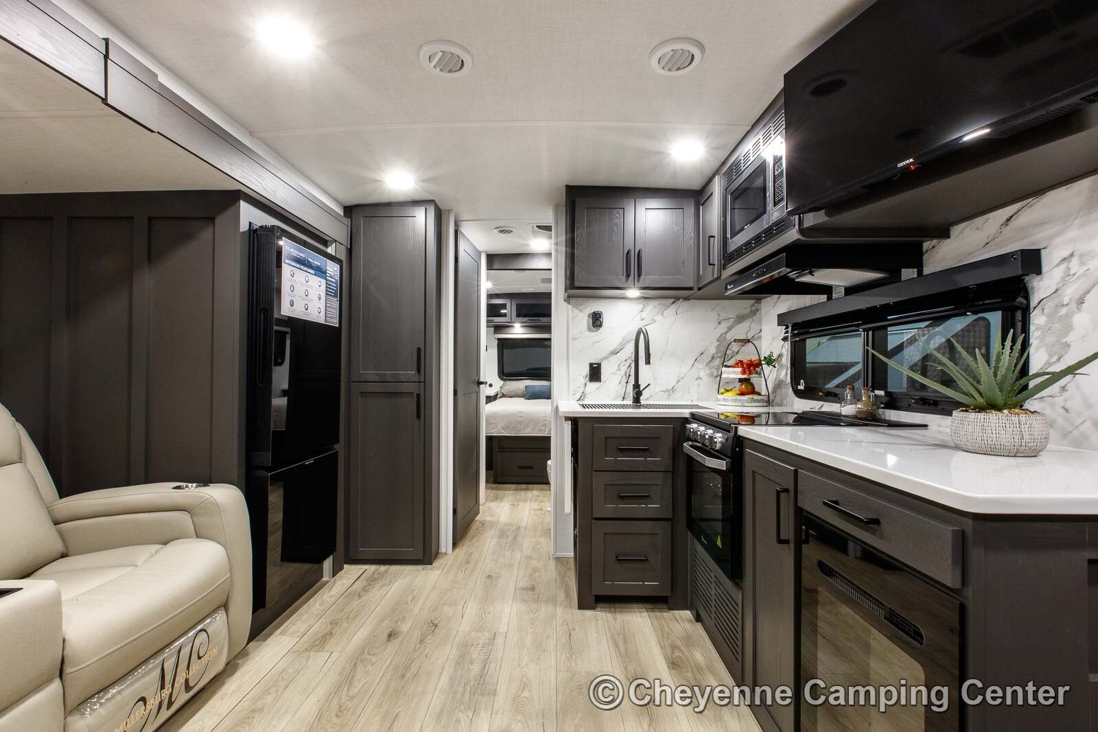 Outside, you’ll have auto leveling, a 200-watt solar panel, slide toppers, a hot/cold water fixture, storage compartments, a marine-grade stereo speaker, a 21′ power awning with LED lighting, two entry doors with premium strut assist entry steps, Goodyear Endurance tires, a tire pressure monitoring system, and torsion axles for a safe and superior ride.
