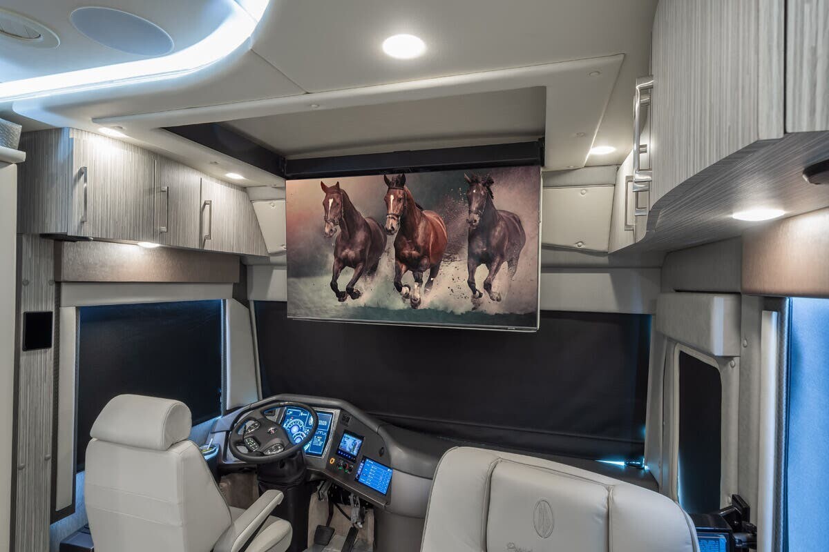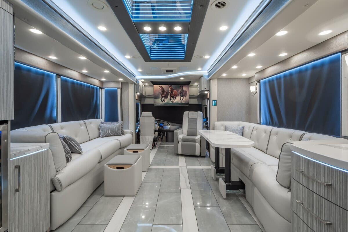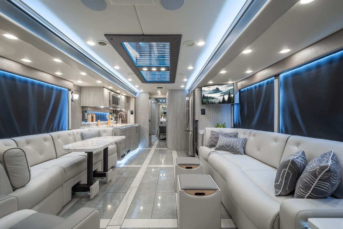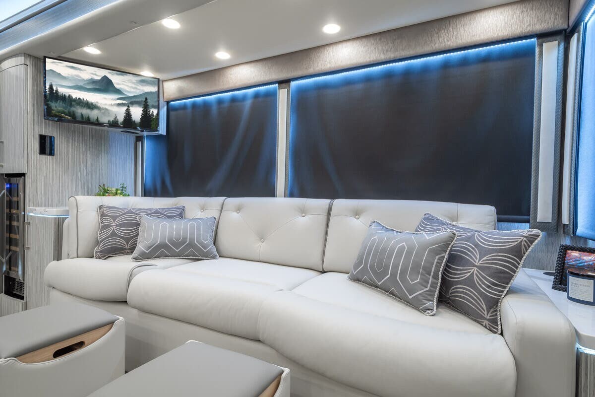 The exterior boasts a high-gloss, multi-layer paint finish that offers both visual appeal and protection against the elements. LED lighting enhances visibility, while large panoramic windows allow natural light to fill the interior and provide scenic views. The RV is equipped with advanced suspension and air disc brakes on all wheels for a smooth and safe ride.