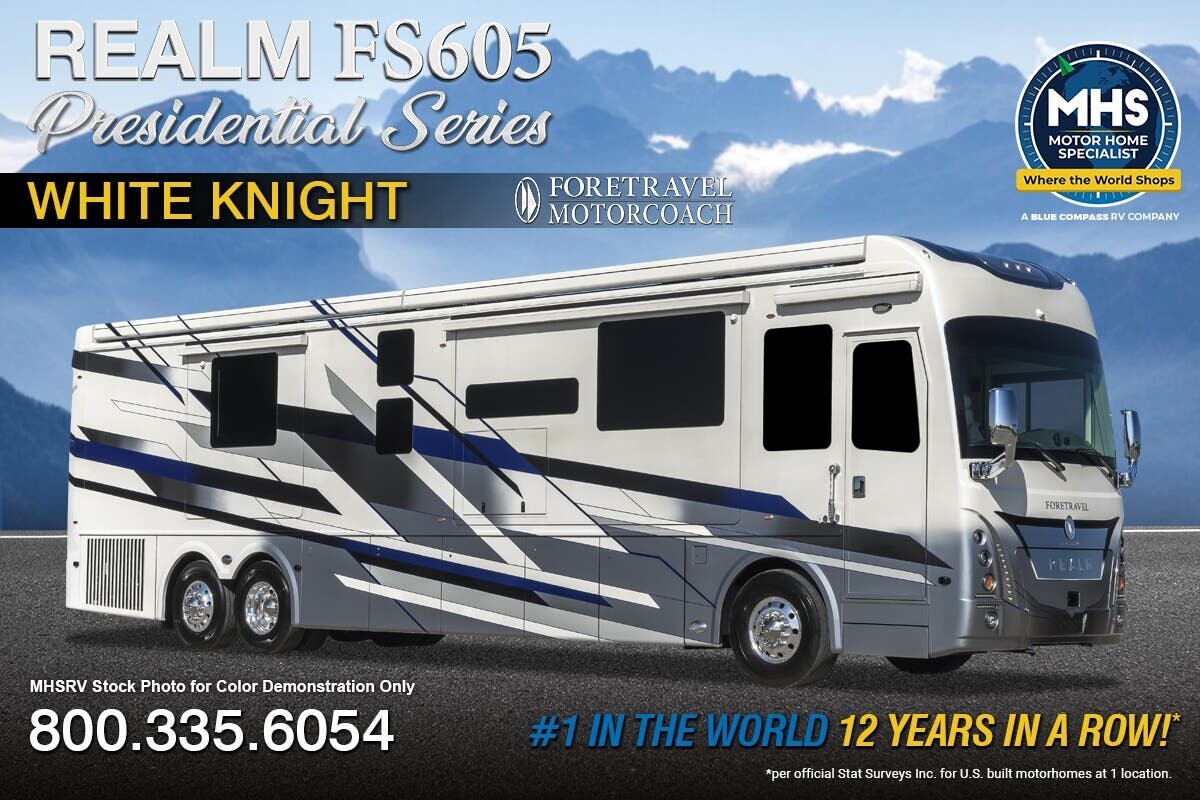 The 2026 Foretravel Presidential Series Realm FS605 LV2 is a top-tier motorhome designed to offer luxury and comfort on the road. This RV is crafted by Foretravel, a respected name known for its dedication to quality and innovation in the world of recreational vehicles. The 2026 model brings an elevated level of sophistication and functionality, making it a standout choice for those seeking a premium travel experience.One of the main features of the Foretravel Realm FS605 LV2 is its spacious and thoughtfully designed interior. The floor plan maximizes space, ensuring a comfortable living area that feels open and inviting. The living space is equipped with plush seating, making it an ideal place to relax, whether you're entertaining guests or winding down after a day of travel. The high-quality materials used throughout the motorhome add to the luxurious feel, providing a touch of elegance and durability.The kitchen in the 2026 LV2