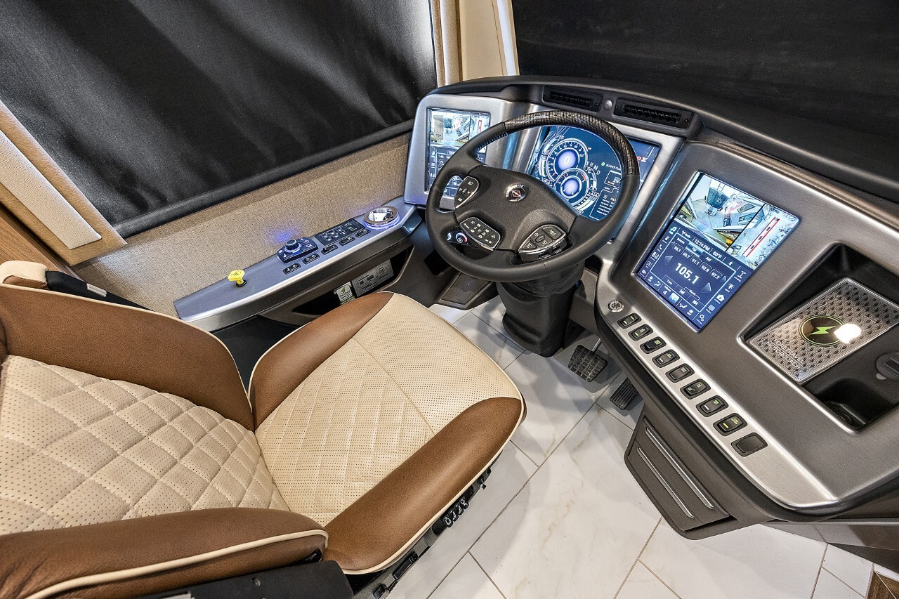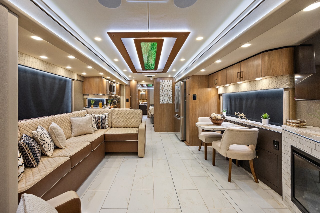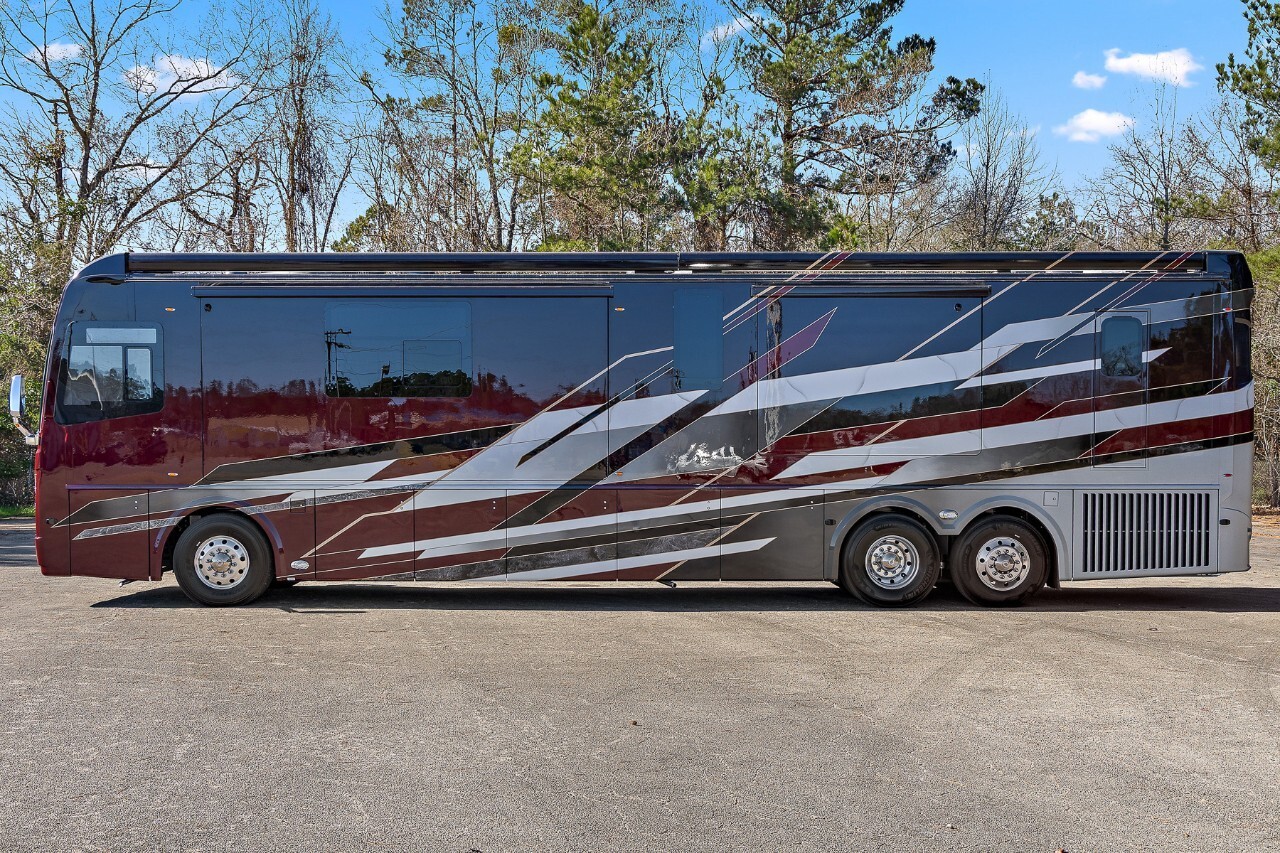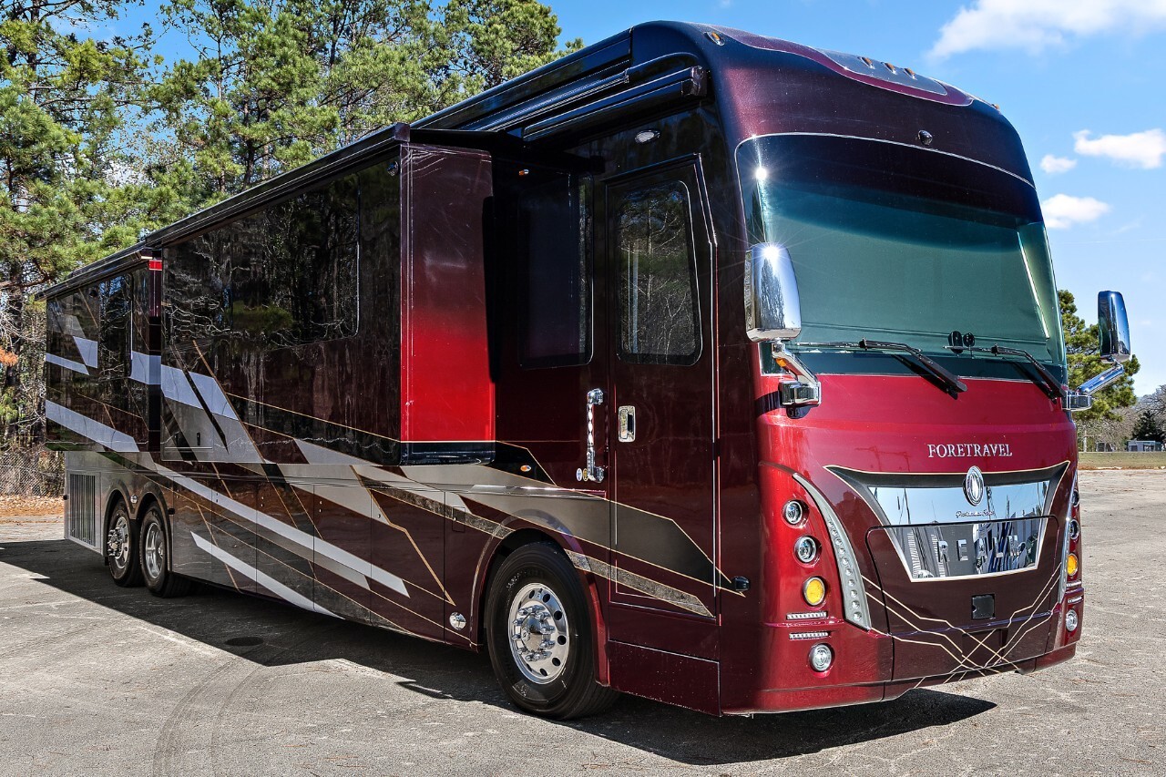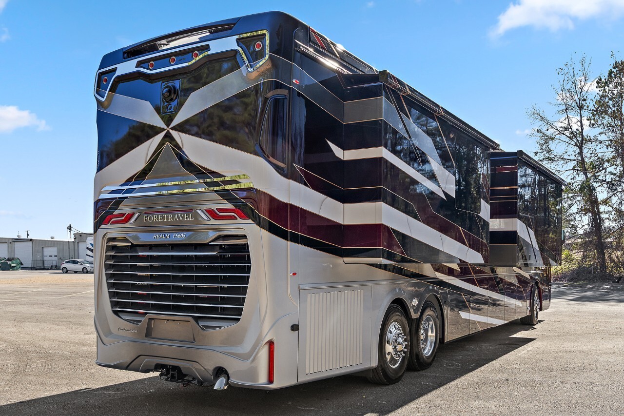 The 2025 Foretravel Presidential Series FS605 LV3 is a top-tier luxury motorhome designed for travelers who value comfort and style. Built on the robust Spartan K4 chassis and powered by a Cummins X15 605 HP engine, the LV3 offers a smooth and powerful driving experience.The exterior of the LV3 features a sleek, aerodynamic design that enhances fuel efficiency and adds a modern touch. High-end paint finishes and premium detailing make it a standout on the road.Inside, the LV3 boasts a spacious and thoughtfully designed floor plan. The living area includes plush seating and large panoramic windows that fill the space with natural light. The kitchen is equipped with high-grade appliances, solid surface countertops, and ample storage, making meal preparation a pleasure. The dining area provides a comfortable spot for meals and gatherings.The master suite offers a king-sized bed with premium bedding, large closets, and a smart TV for